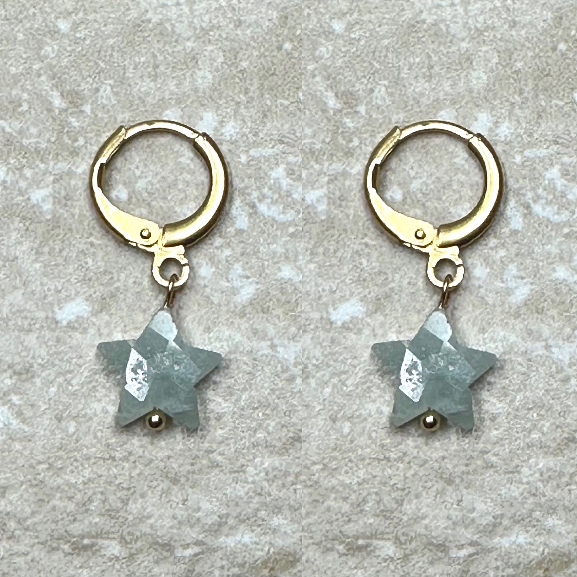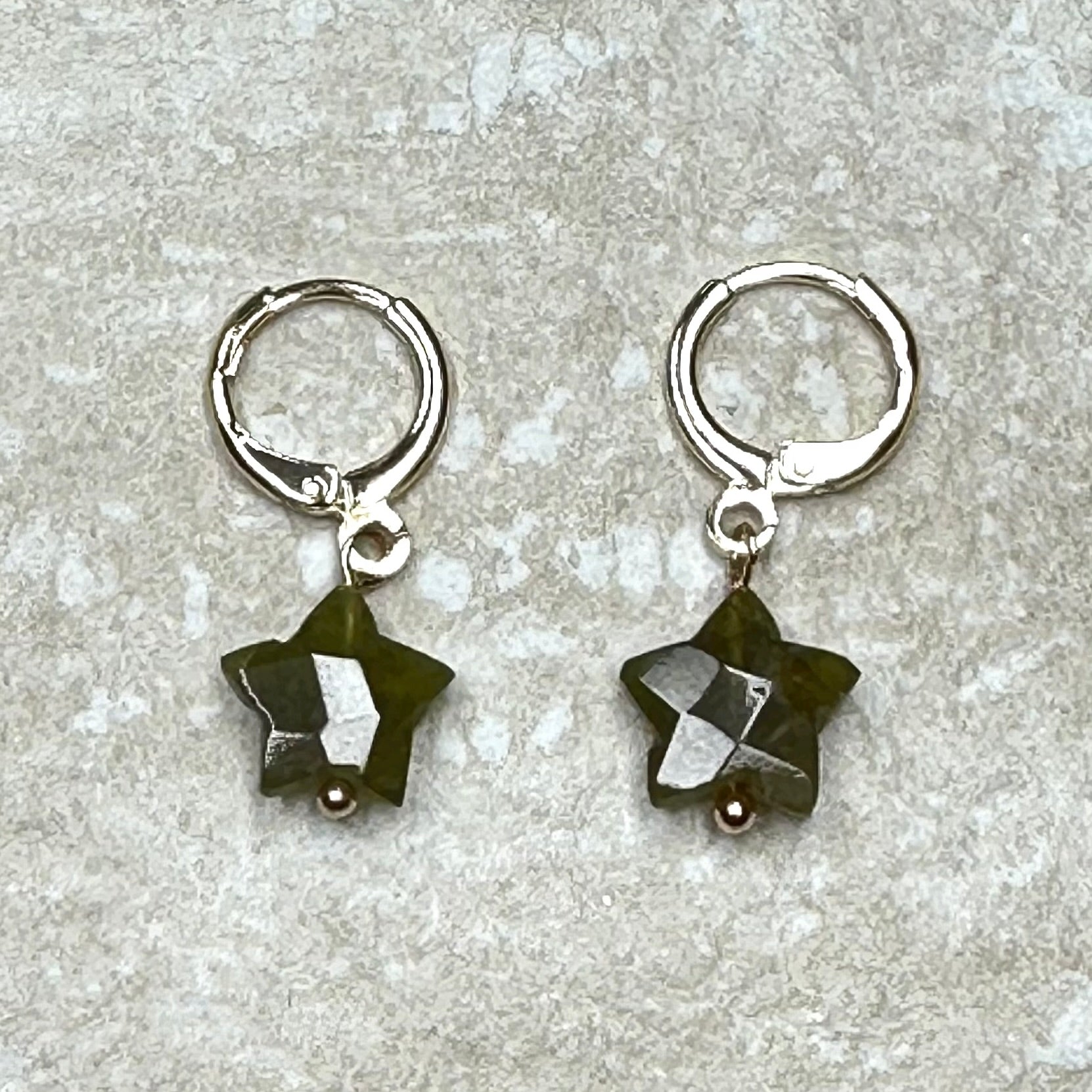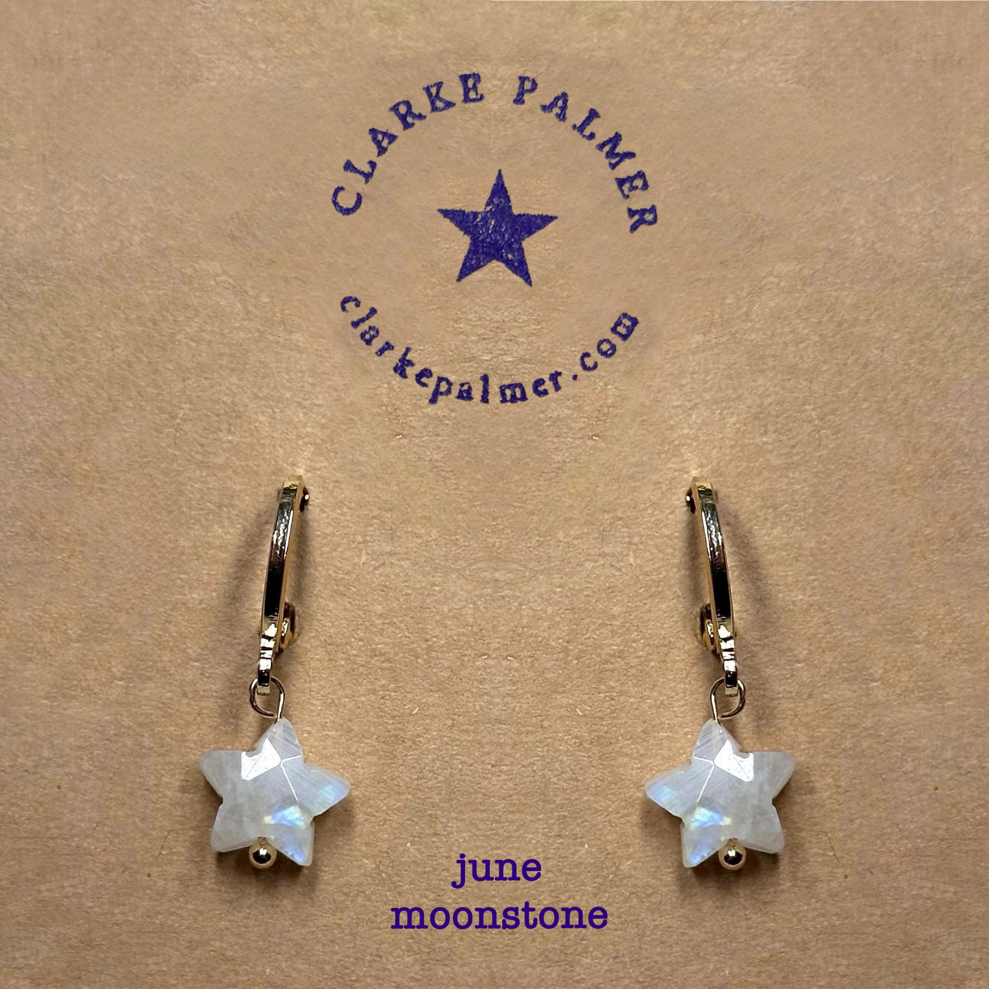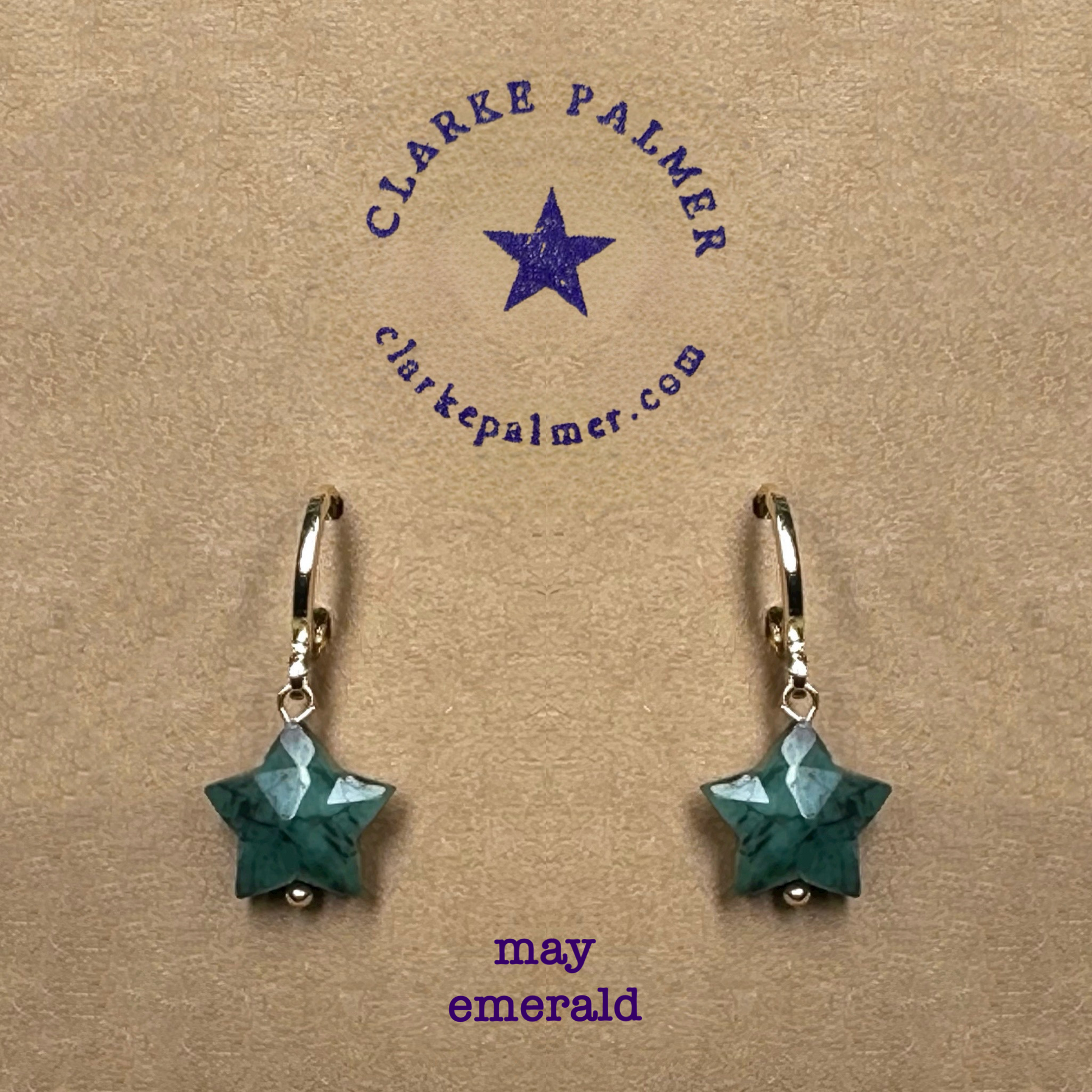 Hand made from sustainably sourced hand cut real gemstone faceted stars. Choose your gemstone and from 22kt gold vermeil hoops; CZ multi rainbow coloured 22kt gold vermeil hoops; or silver vermeil hoops in the options.