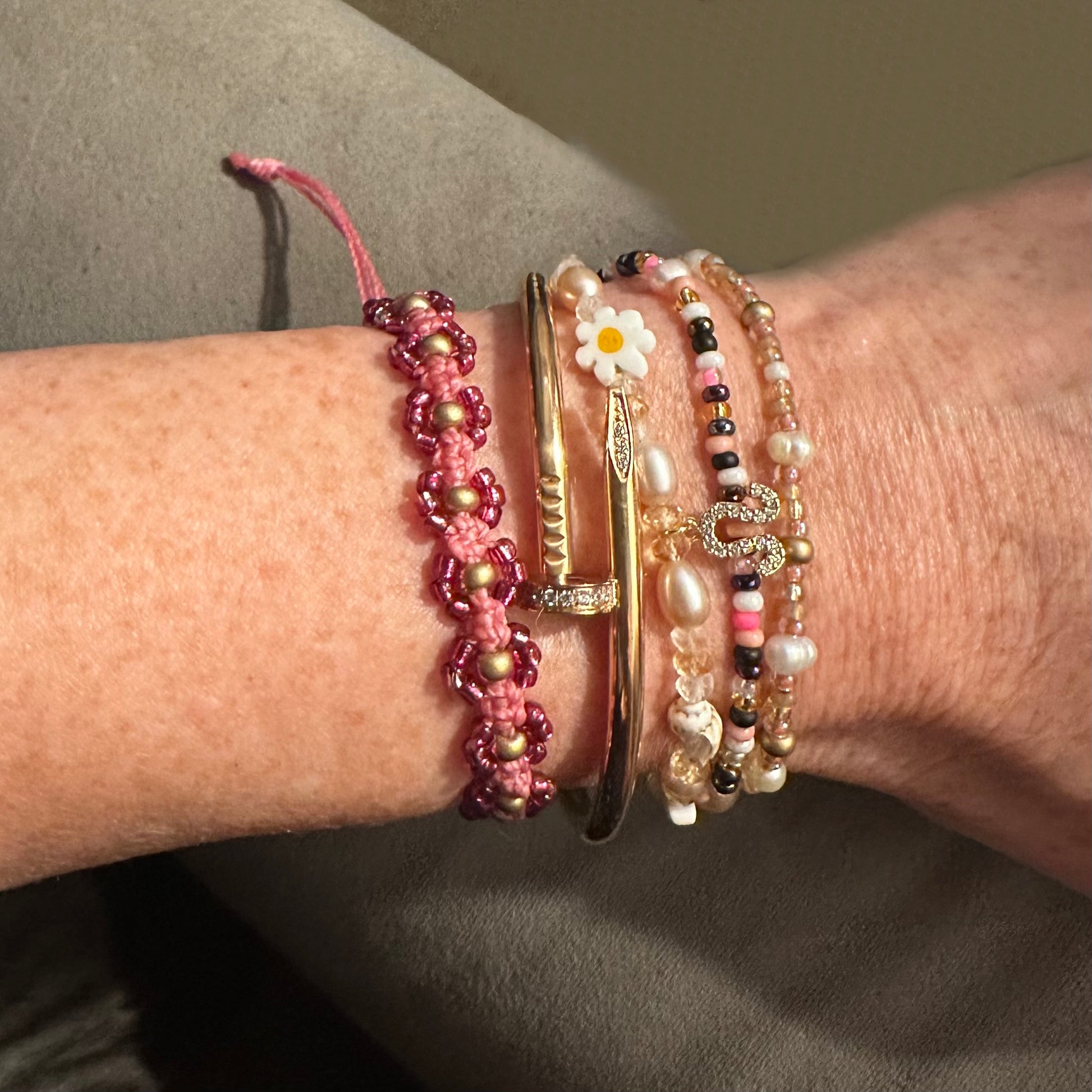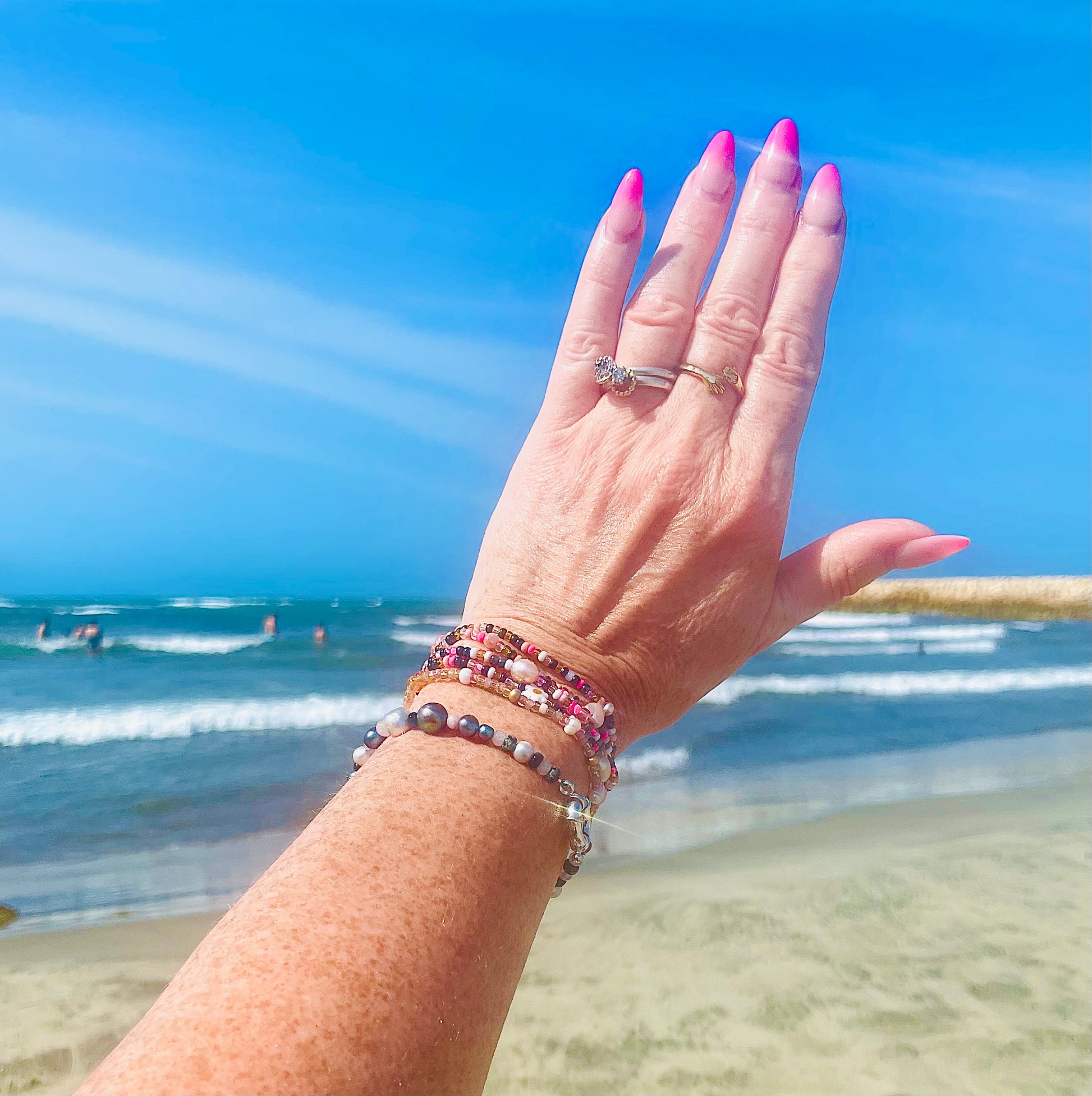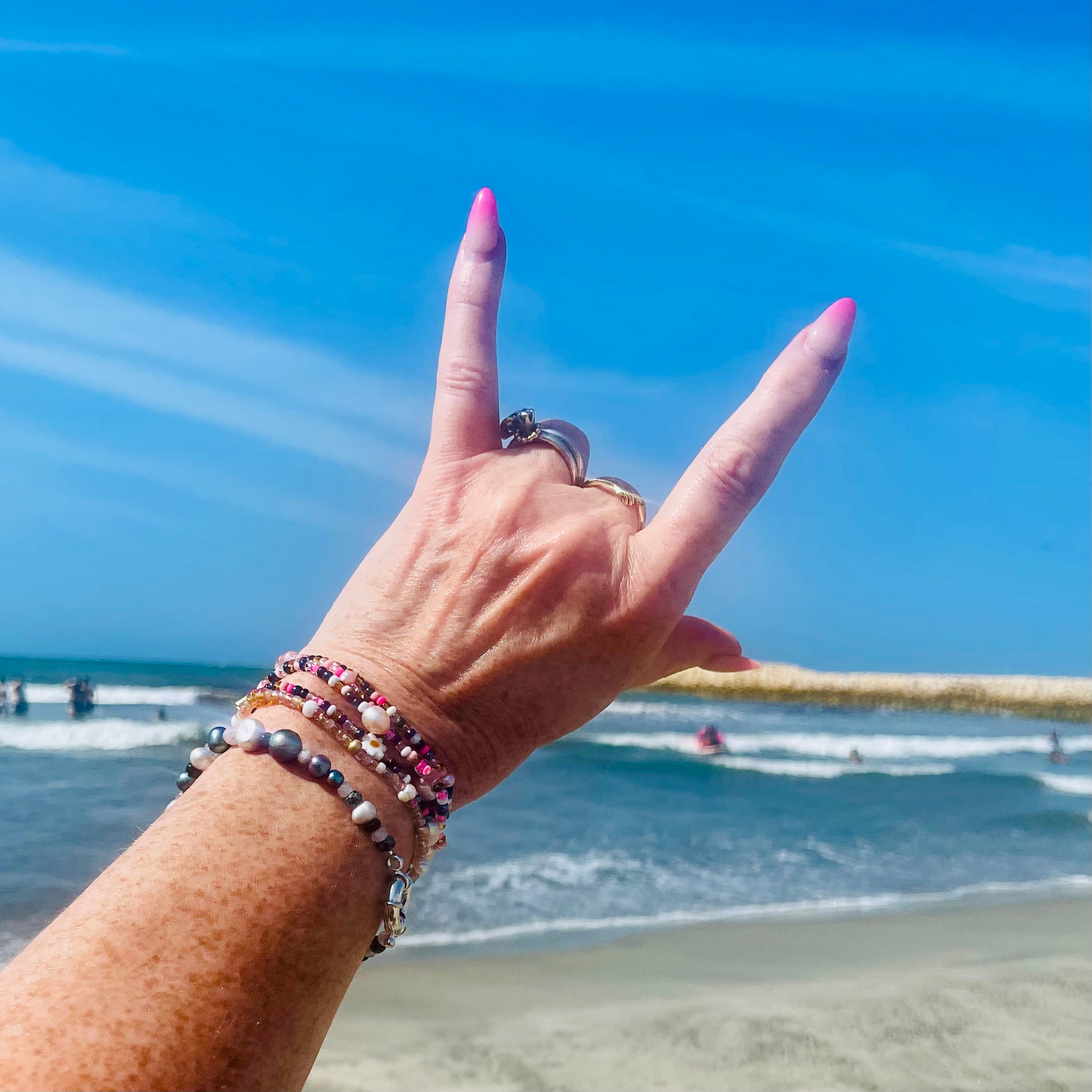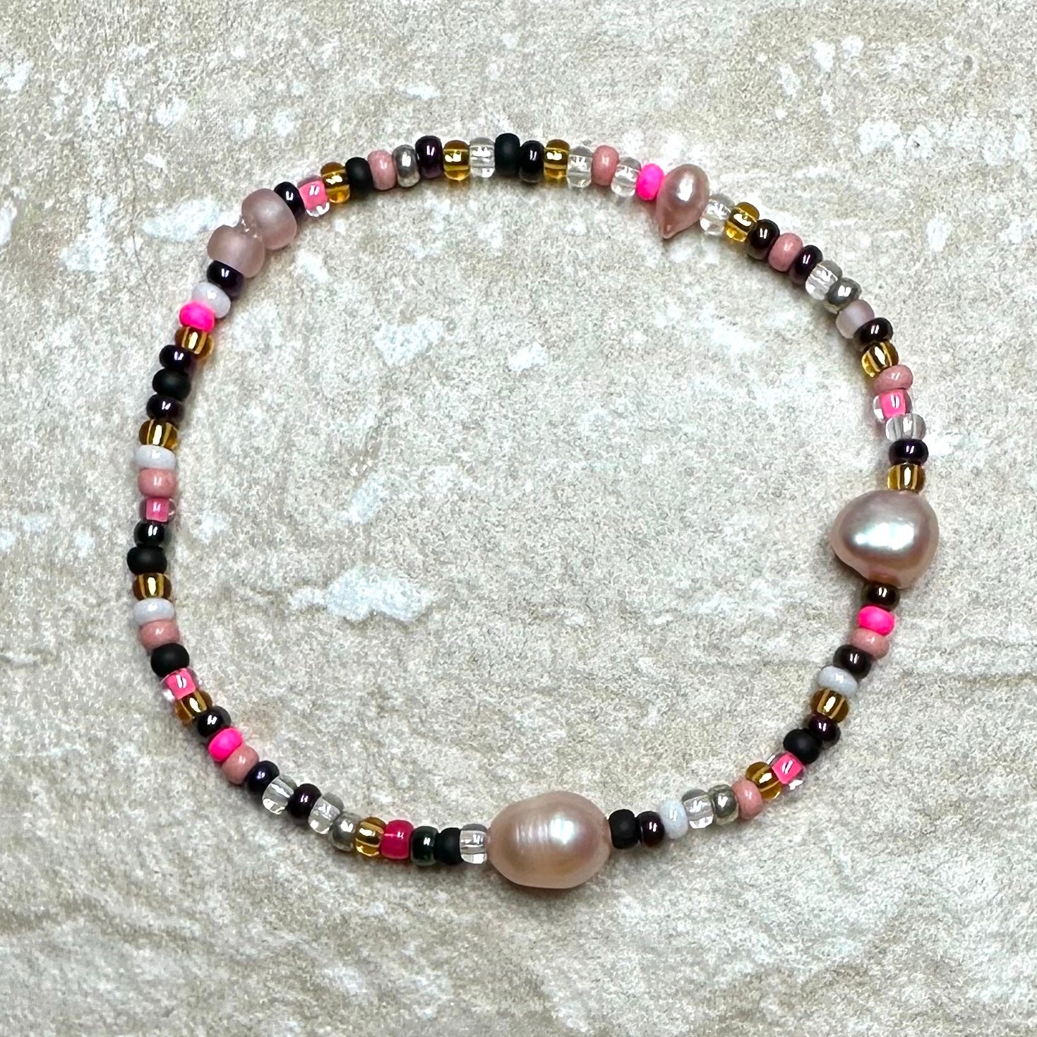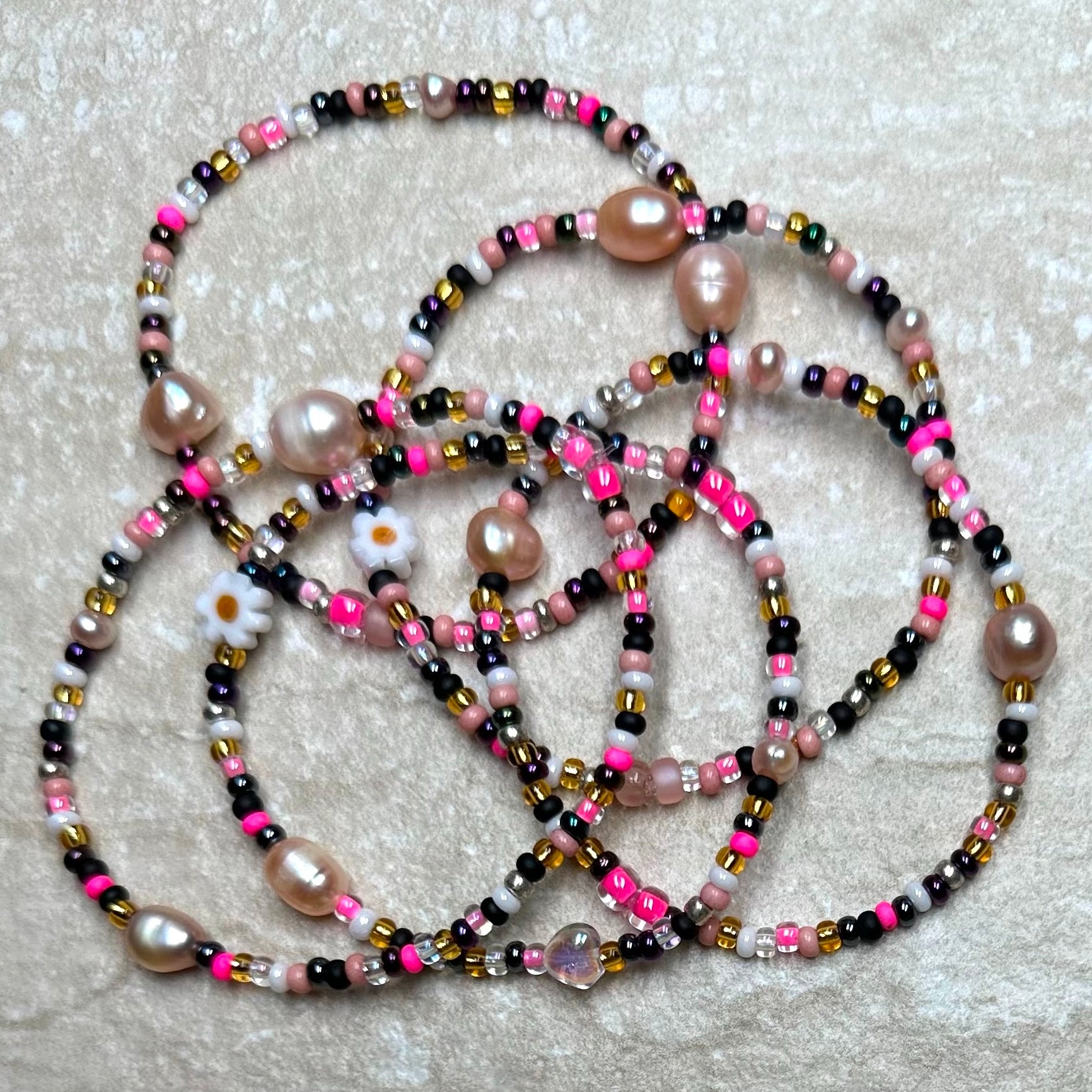Our All Sorts Beaded Bracelet is handmade from sweetie shades of glass Preciosa and Miyuki beads -neon pink, golden yellow, pale rose, white, black, silver and palest pink pearls.