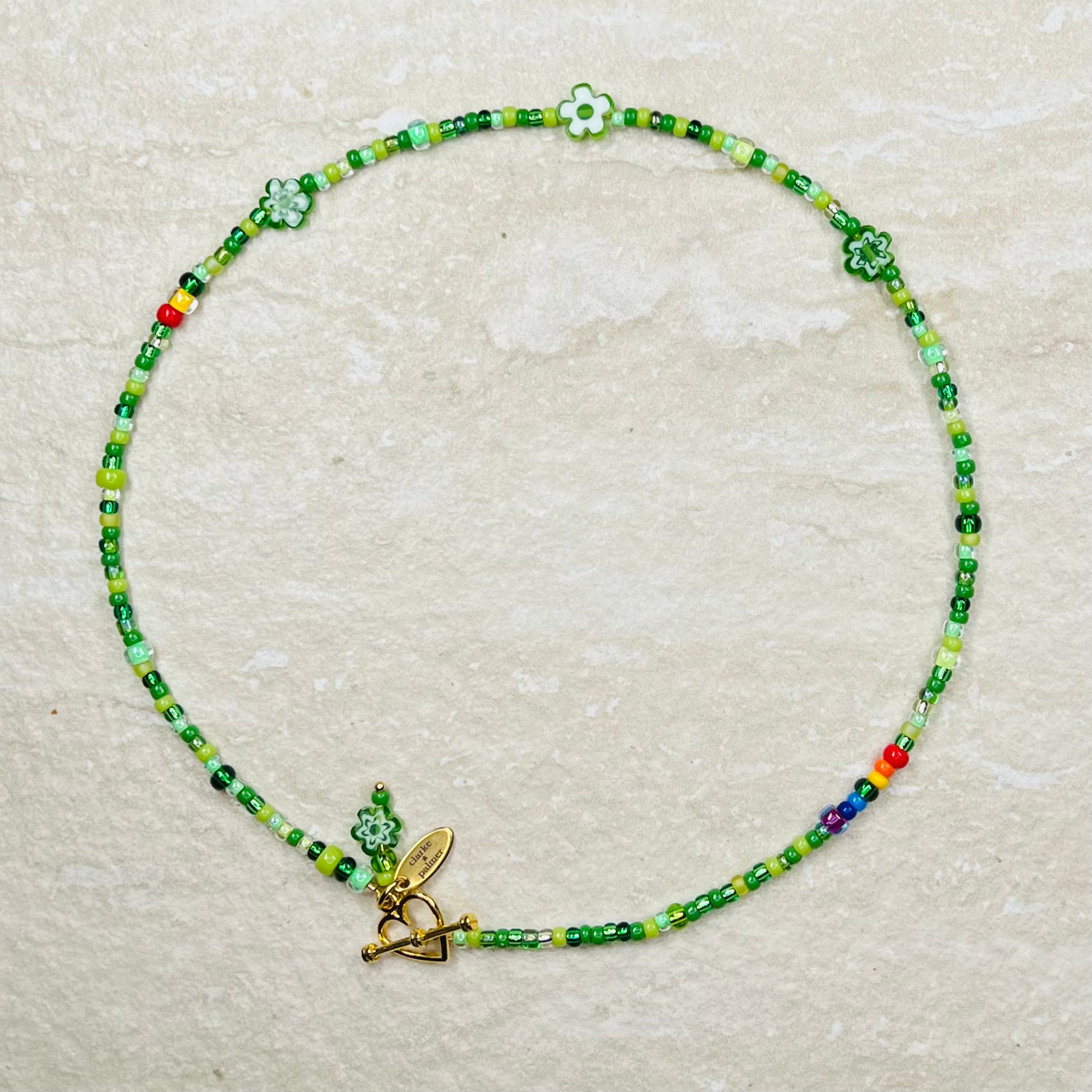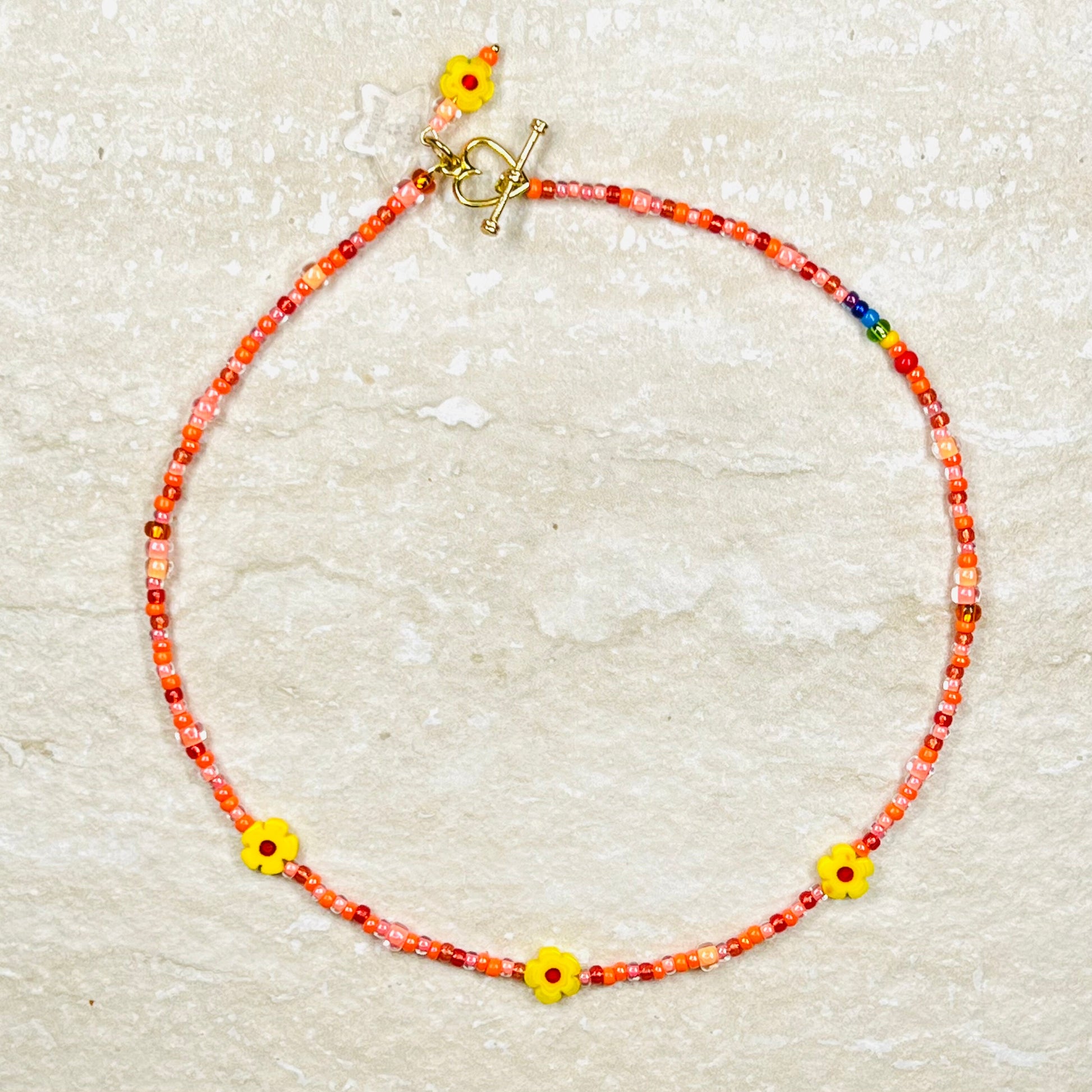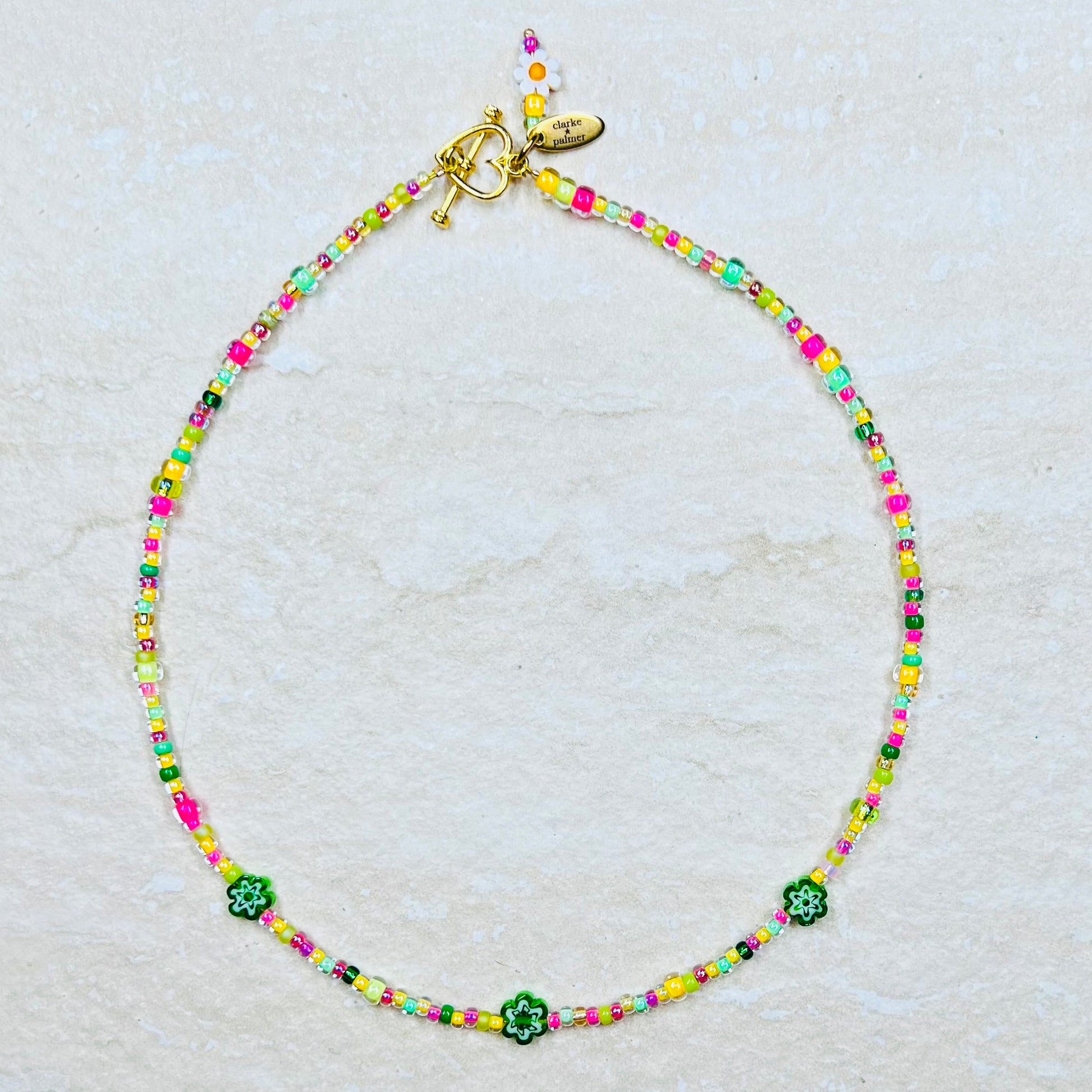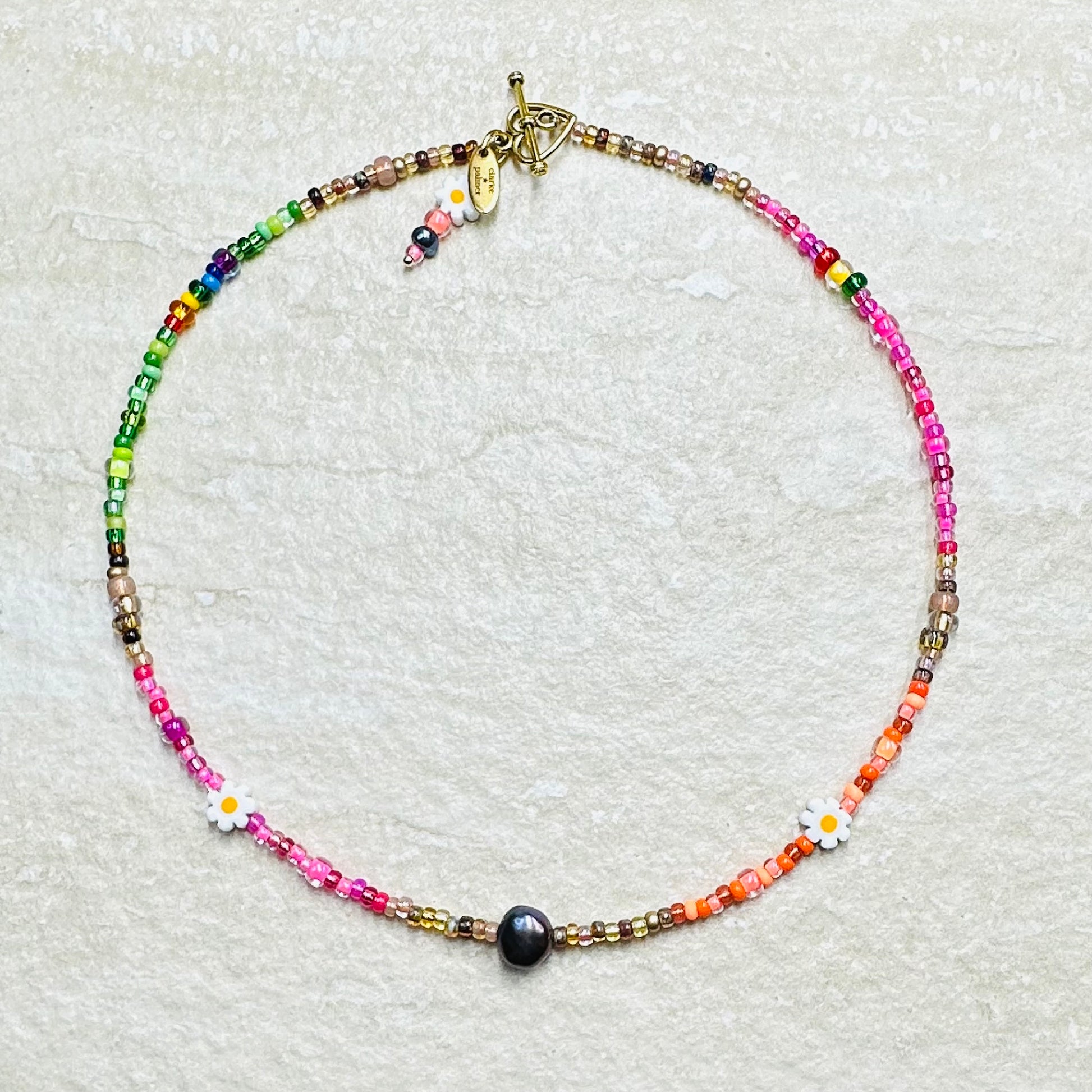 Our Dolly Mixture Beaded Necklace is handmade with Preciosa and Miyuki glass beads with glass daisies. It has a 24 kt gold vermeil heart toggle clasp. As worn by actor Sophia di Martino!