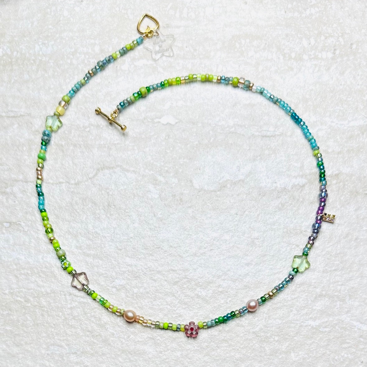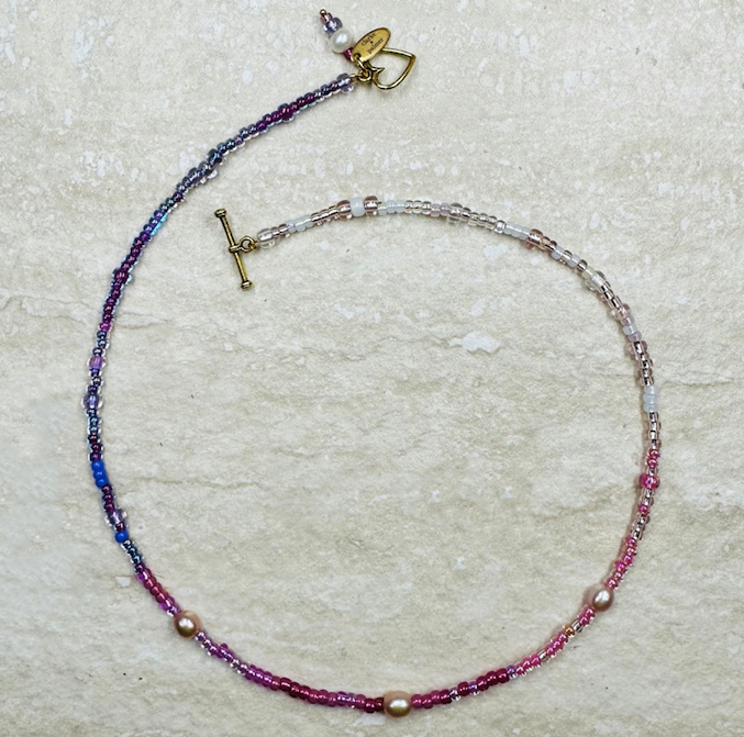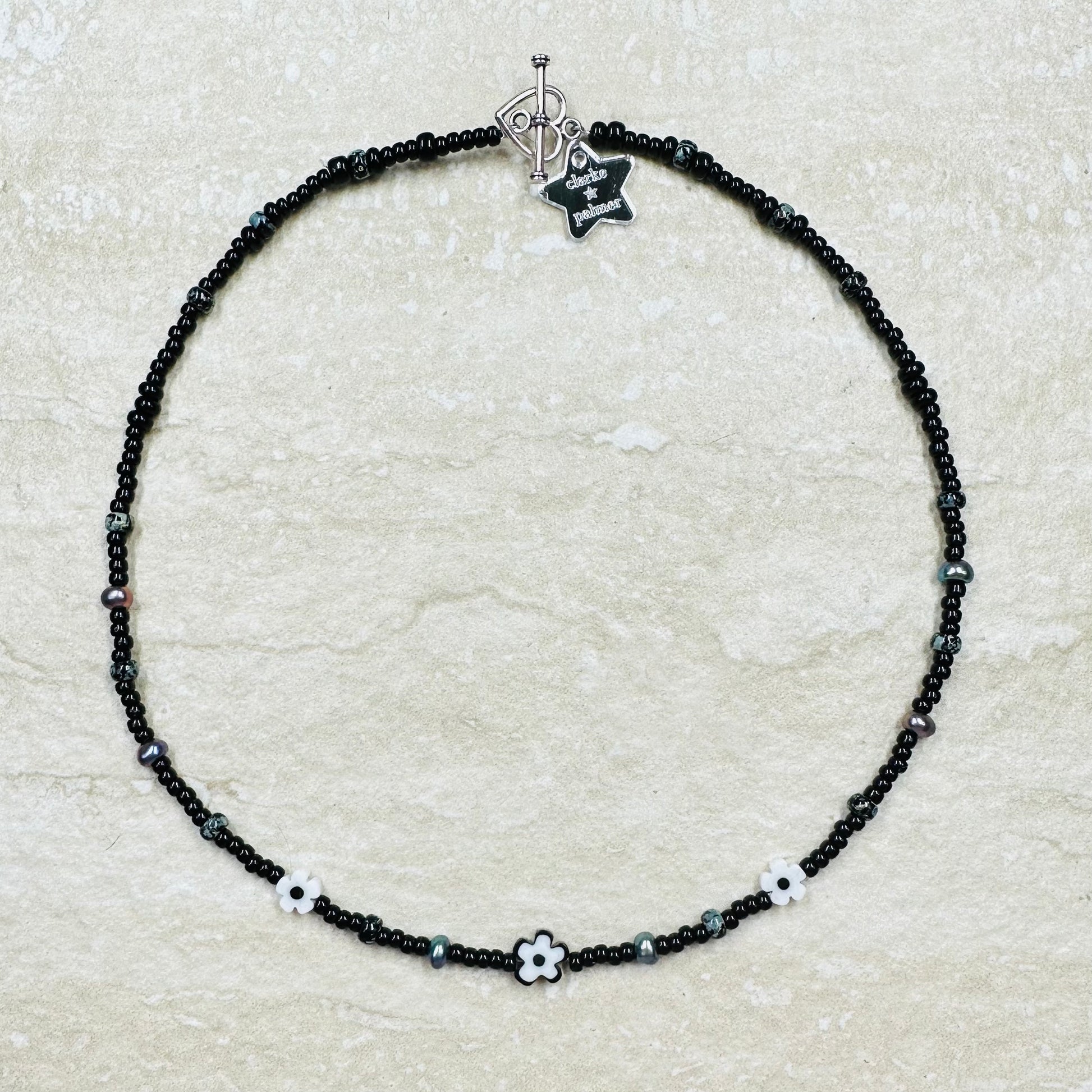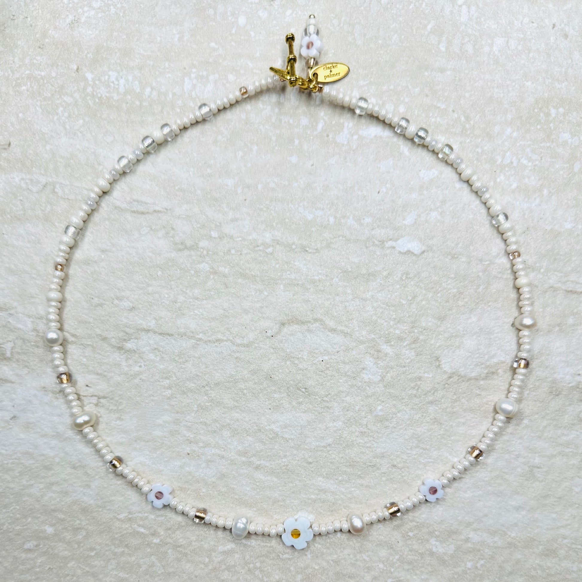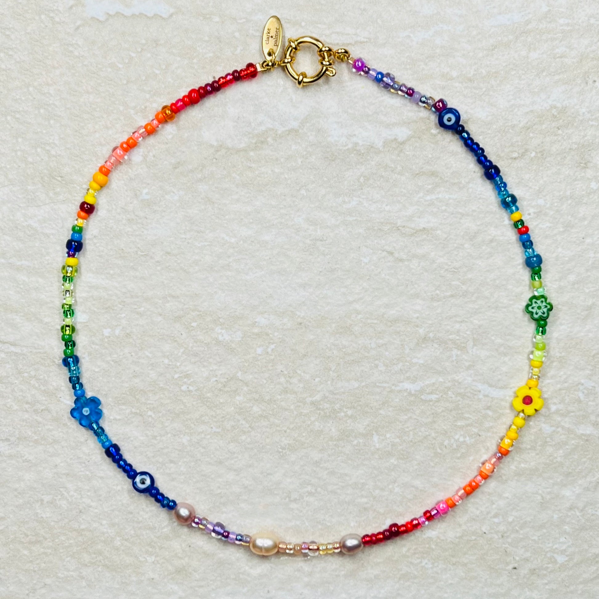 Our Dolly Mixture Beaded Necklace is handmade with Preciosa and Miyuki glass beads with glass daisies. It has a 24 kt gold vermeil heart toggle clasp. As worn by actor Sophia di Martino!