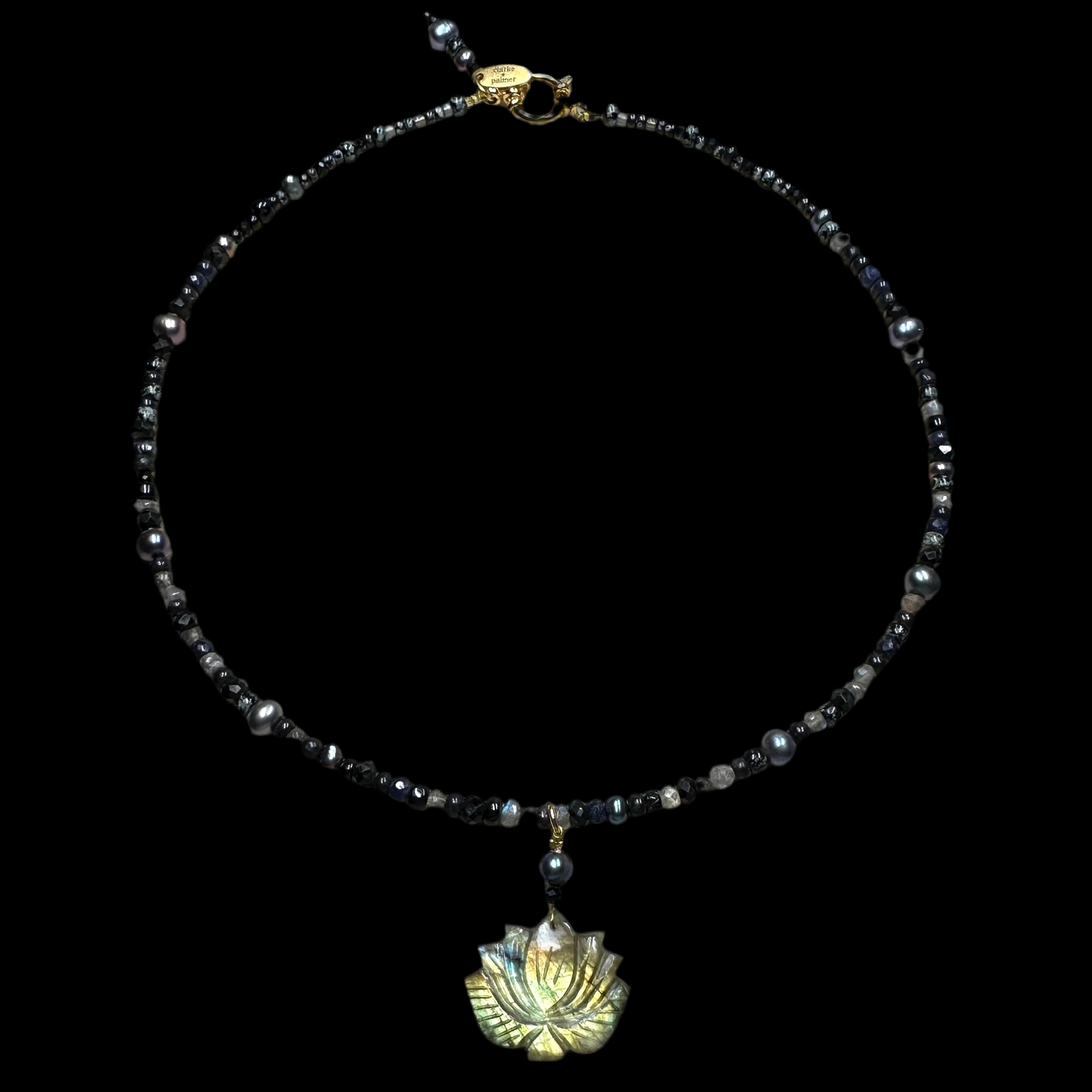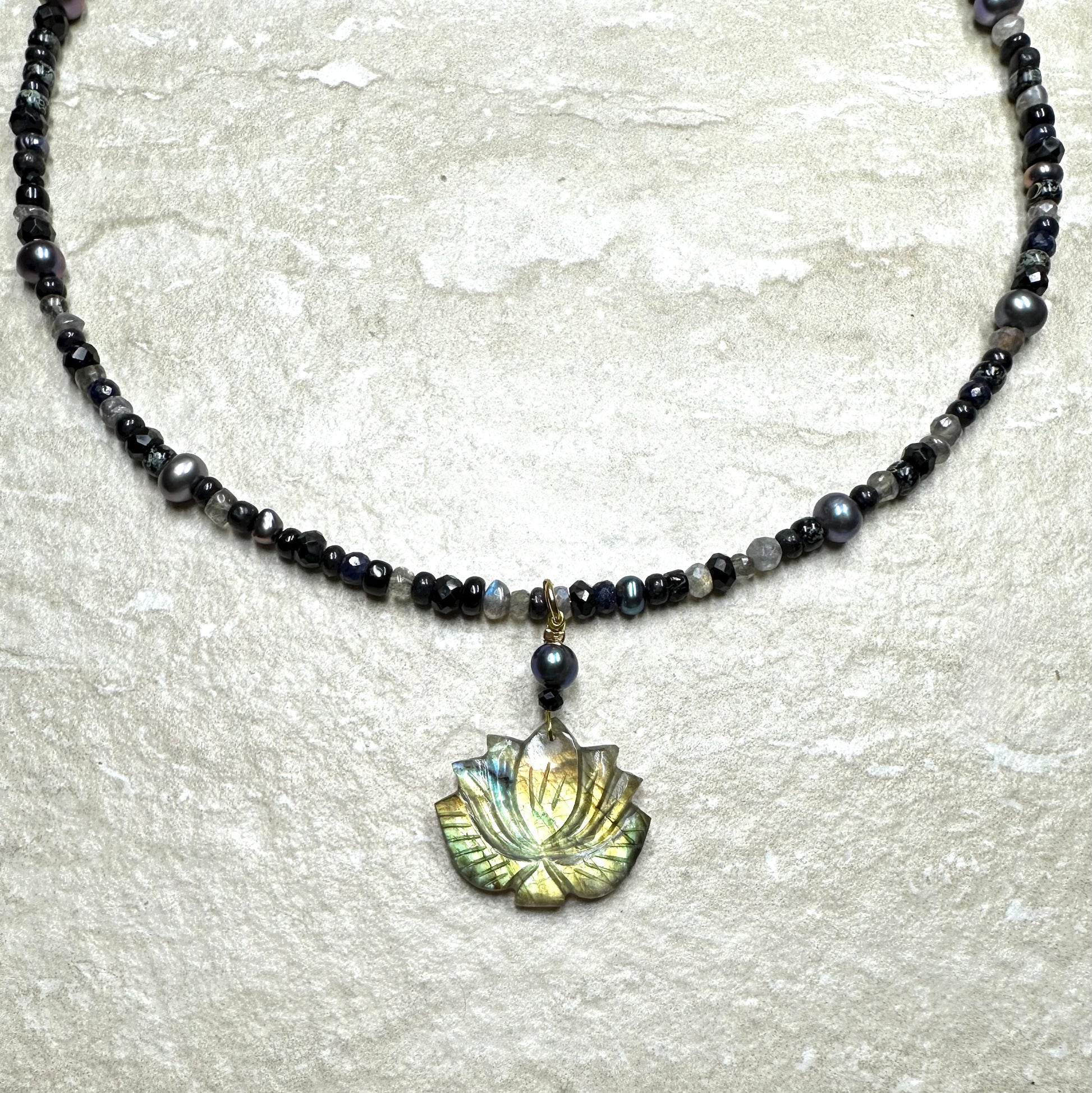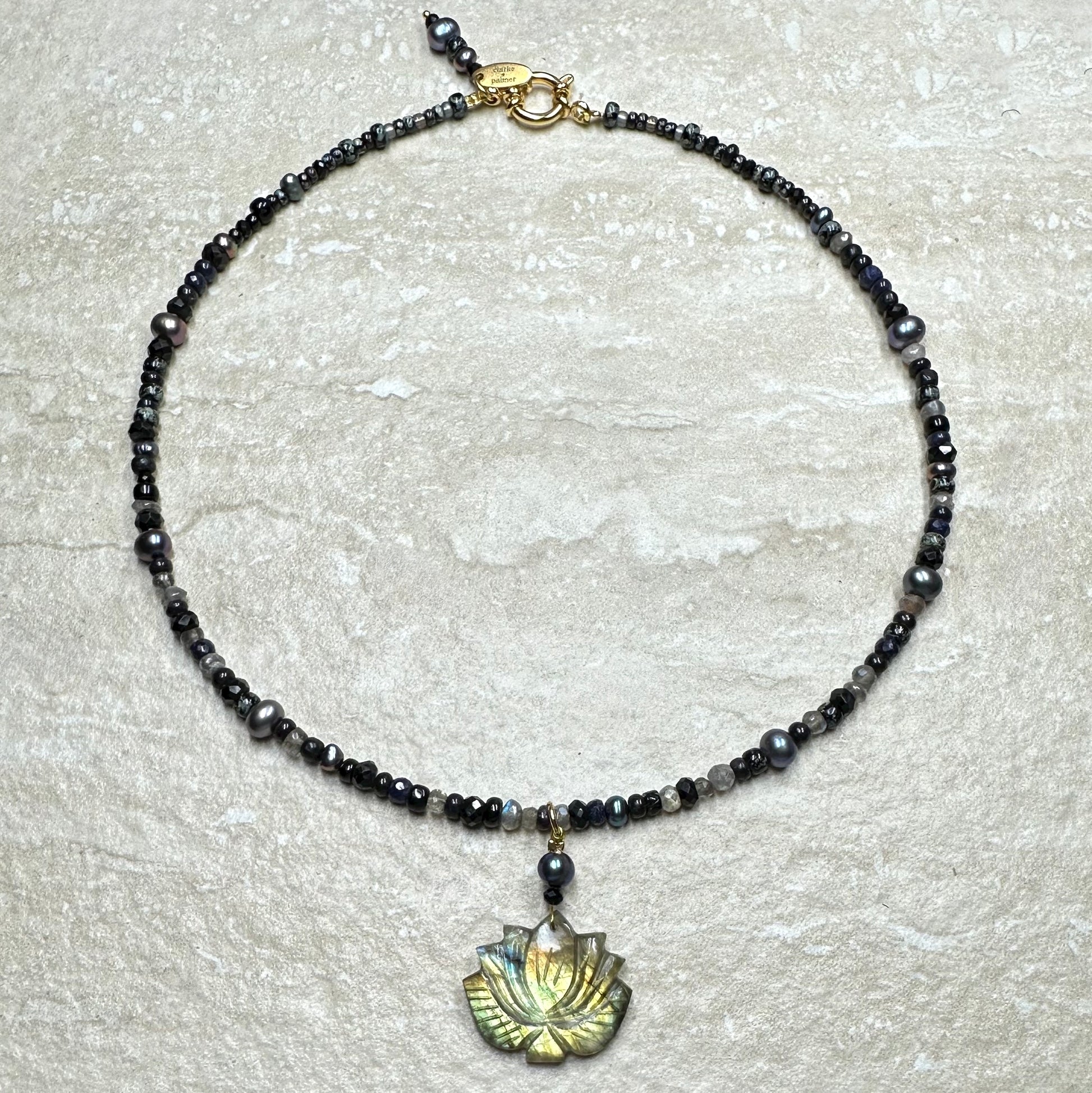 This Necklace is handmade with real black/peacock pearls mixed with faceted and smooth spinel, moonstone, labradorite and opal rondelles and centred by your choice of handcarved labradorite lotus, or faceted spinel briolette and peacock pearl. Our pearls are sustainably sourced from Japan.