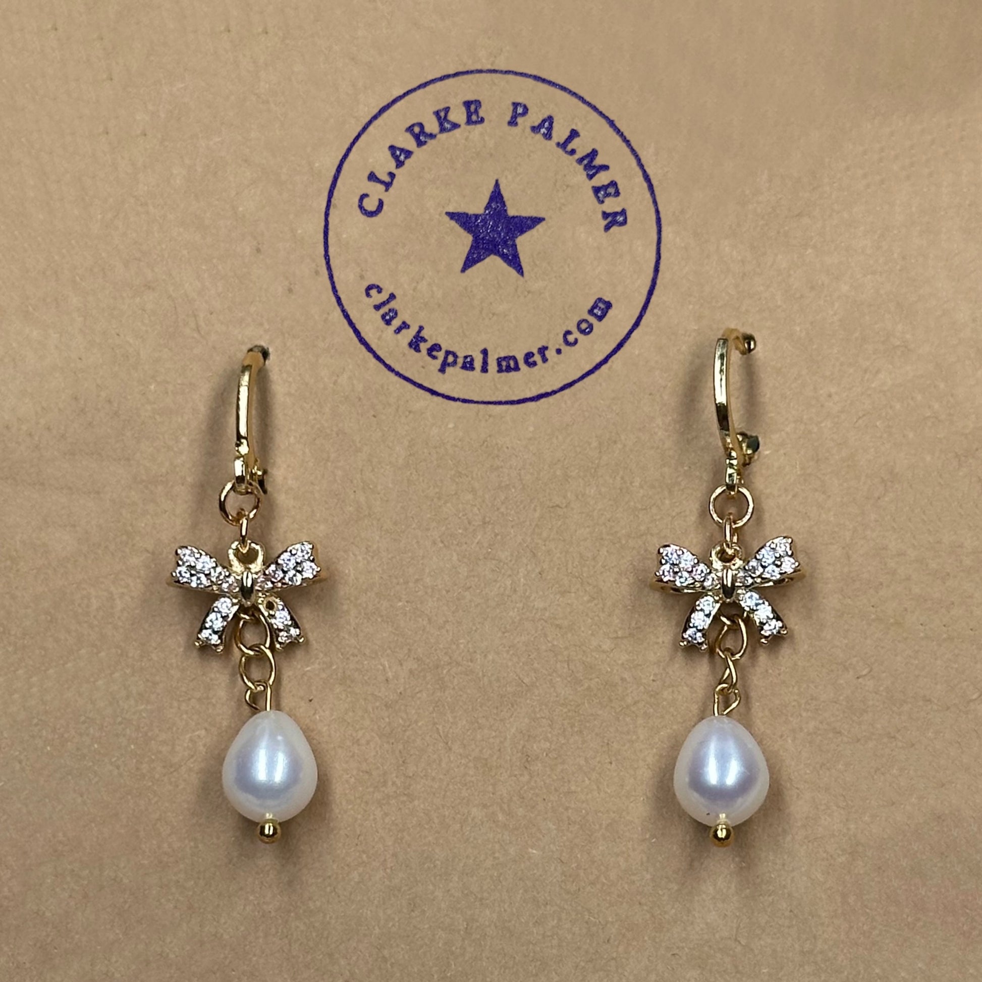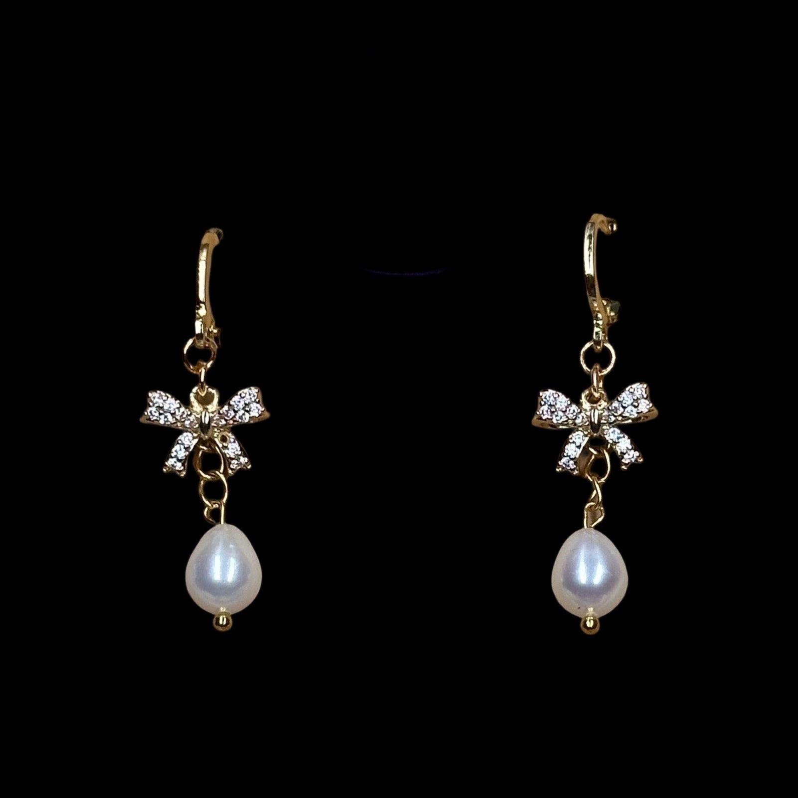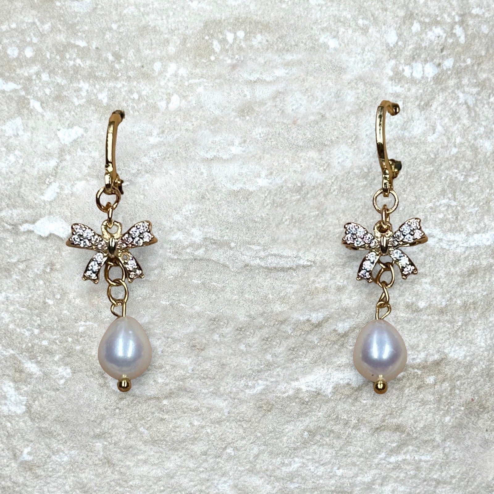 We love these bow drop pearl earrings. They are made from real teardrop shaped pearls hanging from 24kt gold vermeil CZ bows and go perfectly with our Marie Antoinette Pearl Necklaces.