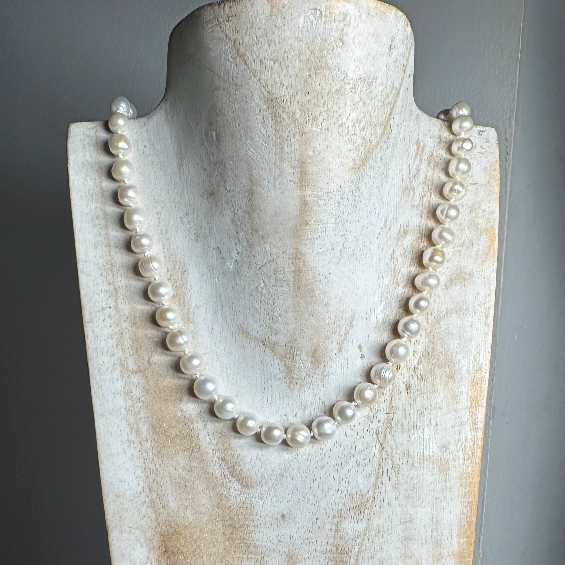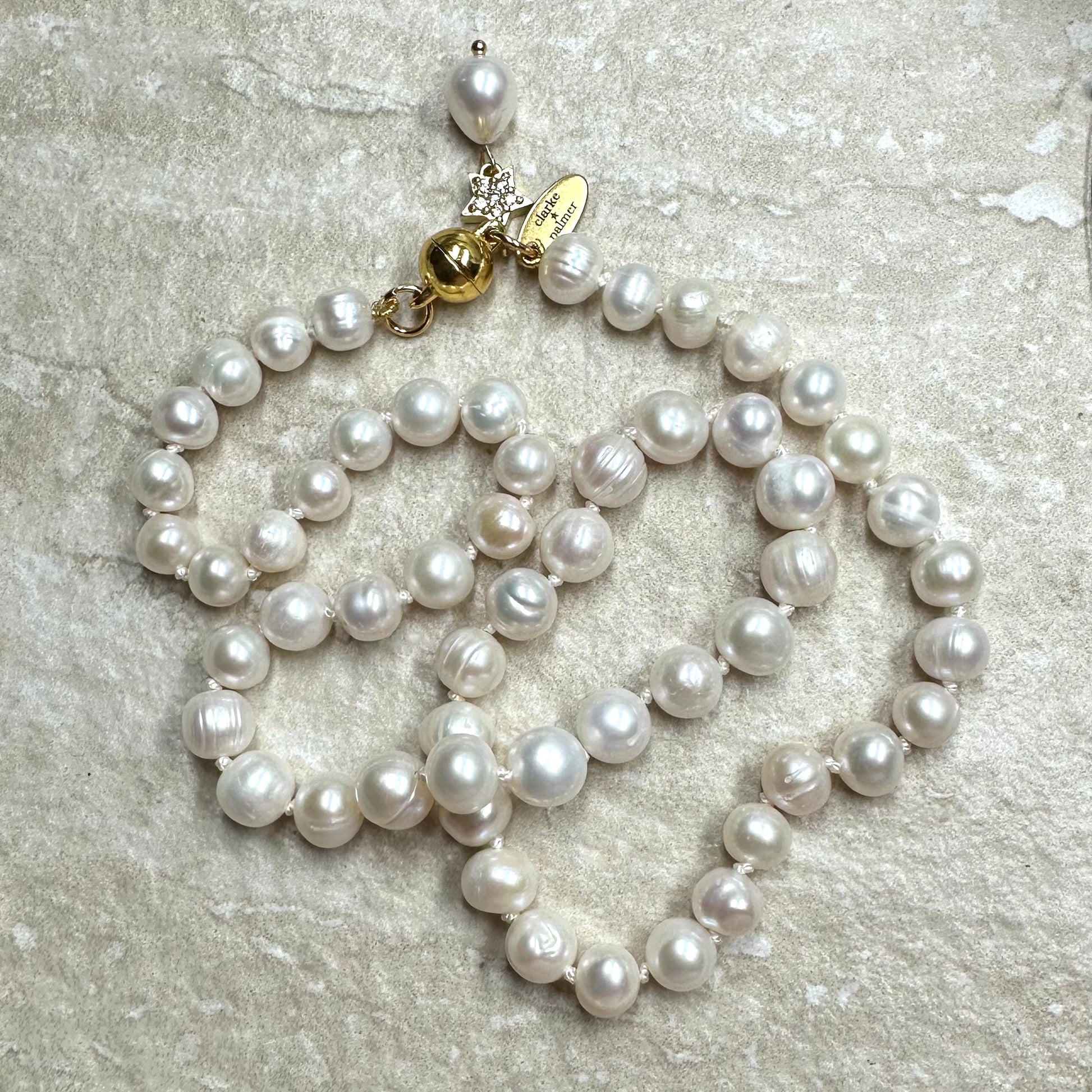 The Clarke Palmer Classic Single Strand Pearl Necklace is handmade in real round AA quality freshwater 6-7 mm pearls. They are strung on silk thread and hand knotted between each pearl in the traditional manner. Choose your size and between three clasps in the options: Silver or 22kt gold vermeil sailor clasp or 22kt gold vermeil filigree.
