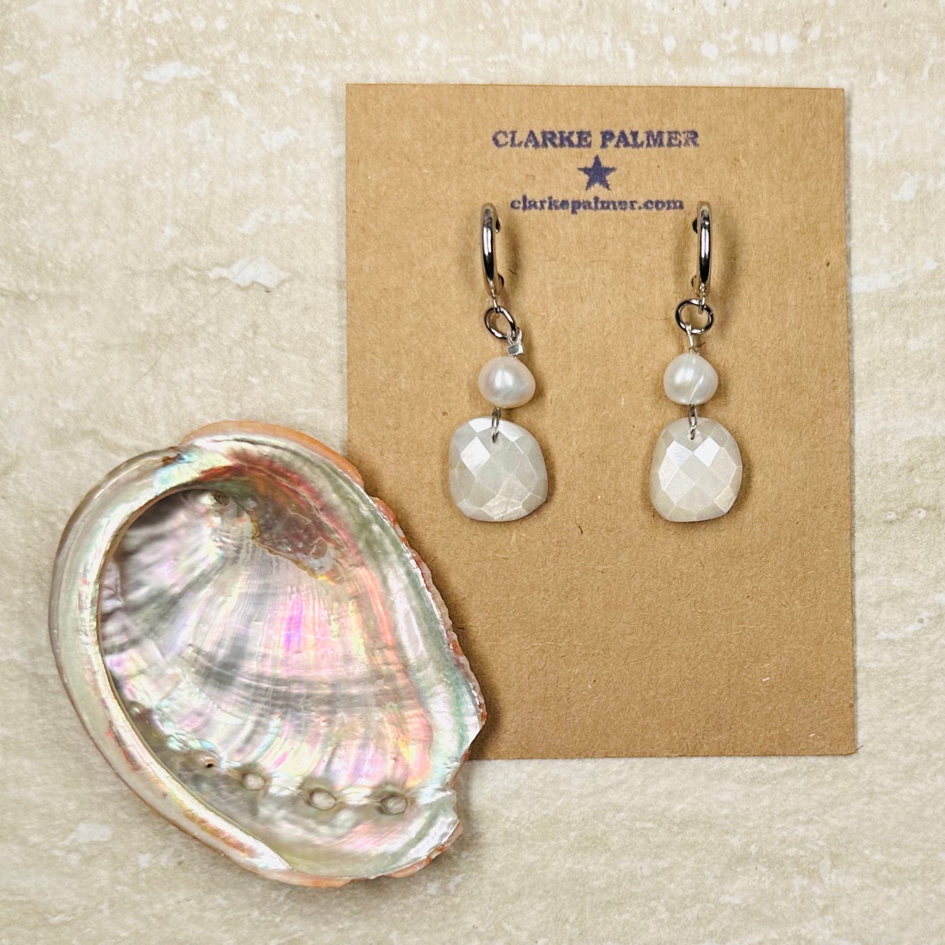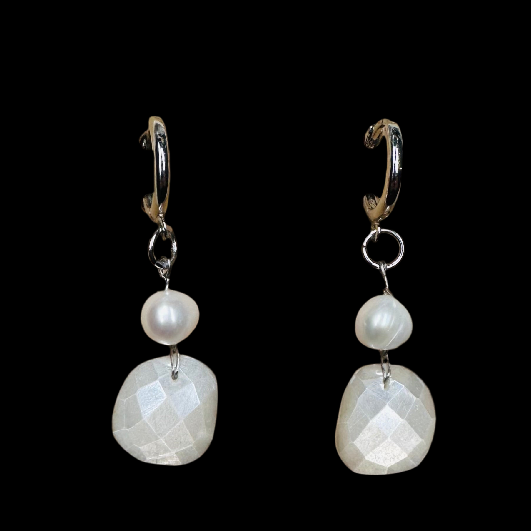 Part of our Precious Elements Collection, these earrings are handmade from hand cut faceted precious metal coated cream moonstone focal drops and cream pearls.
