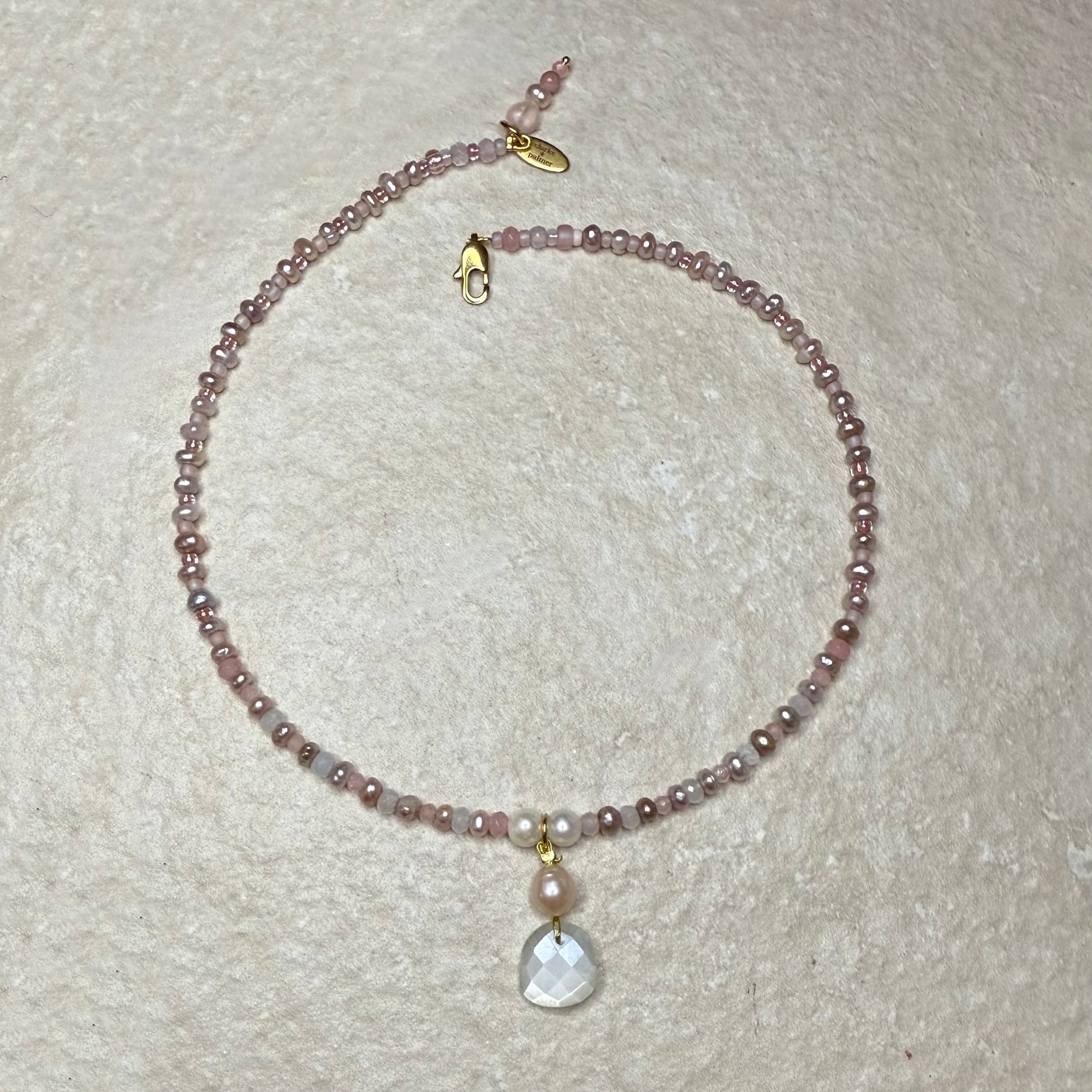 Part of our Precious Elements Collection, this beautiful necklace is handmade from rose & white pearls and rose Quartz tiny faceted rondelles. With a 22 kt gold lobster clasp it is centred by our beautiful moonstone and pearl pendant . The pendant is made from a hand cut faceted precious metal coated white moonstone focal drop and a pale pink pearl.
