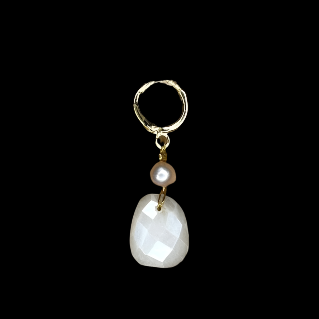 Part of our Precious Elements Collection, this moonstone and pearl pendant is handmade from a hand cut faceted precious metal coated white moonstone focal drop and a cream pearl.