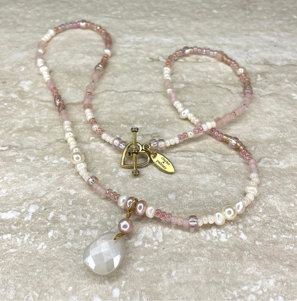 It has a spring snap clip ring and can be worn on your favourite gold or silver chain or one of our beaded necklaces. Pictured is the pearl and rose gold necklace in choker length and 50 cm, and the moonstone and pearl earrings.