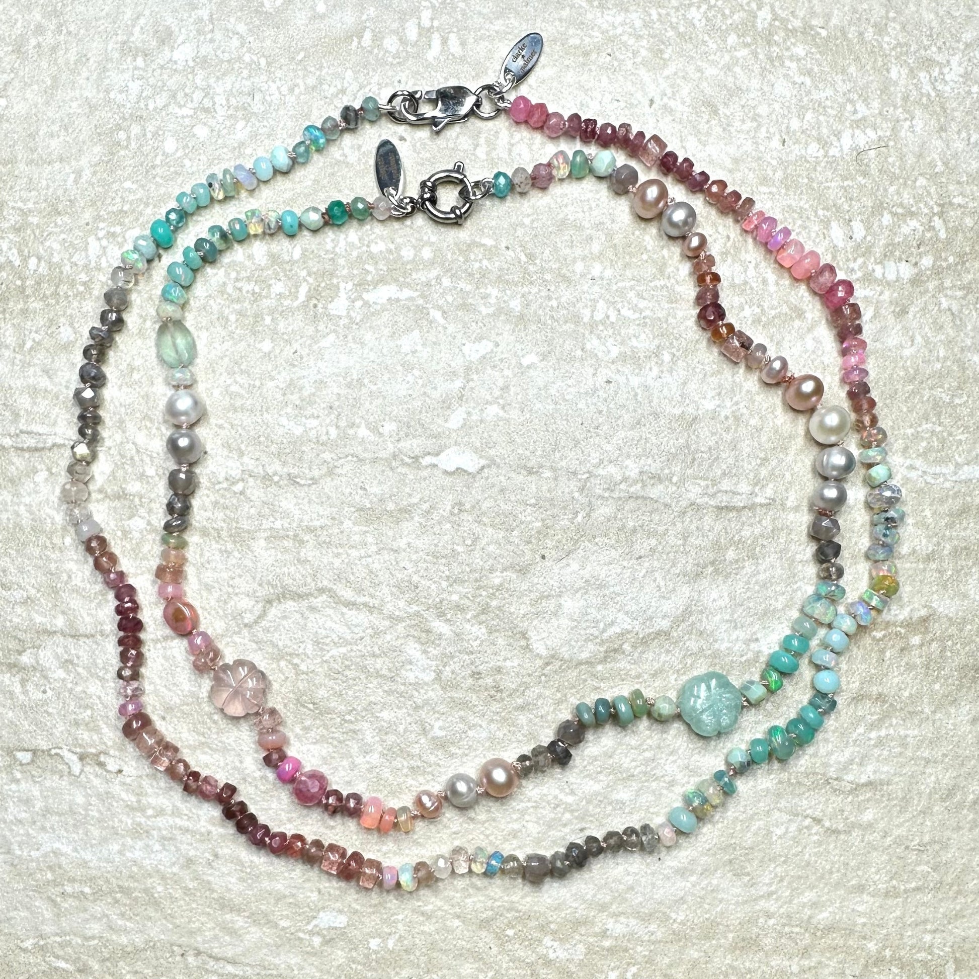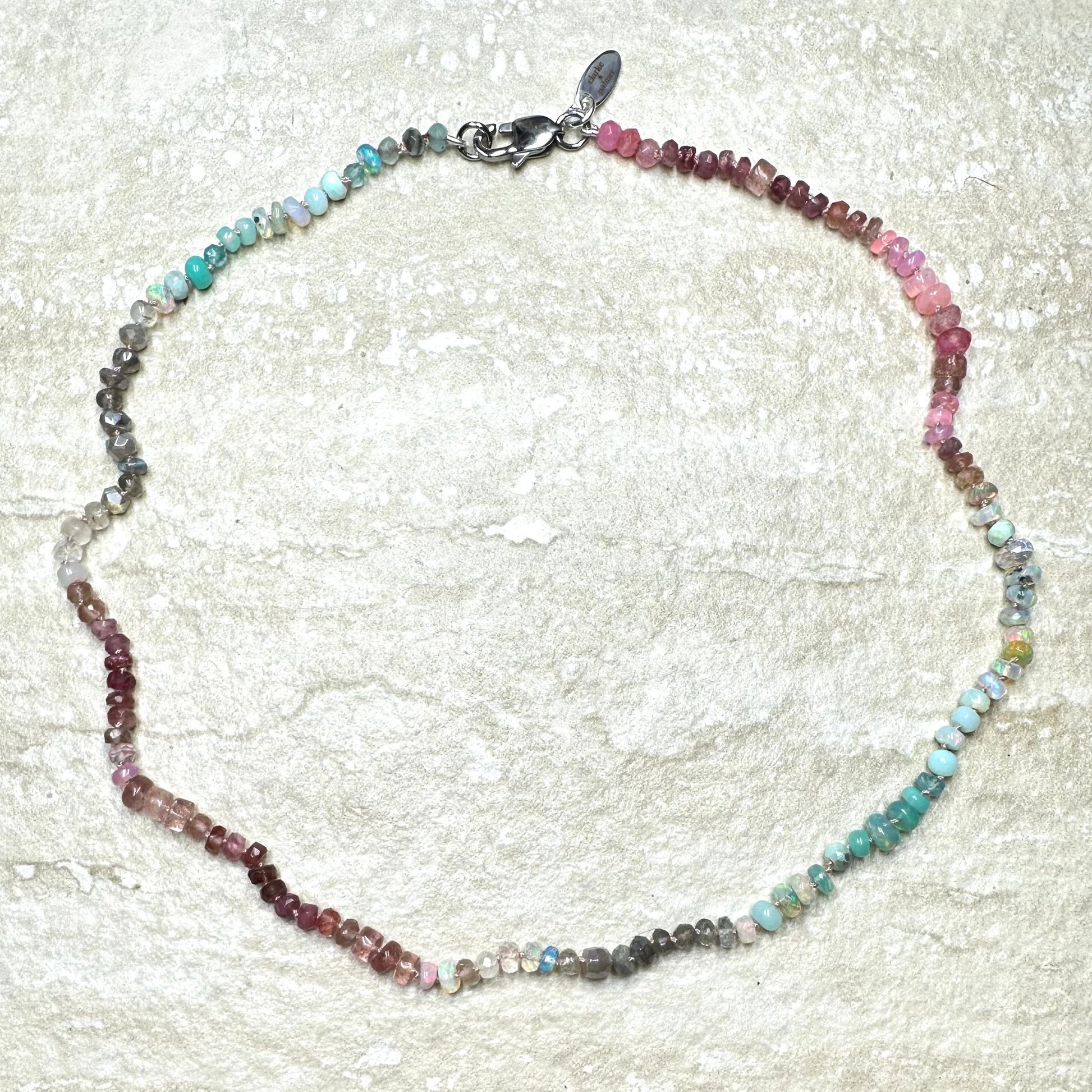 As worn by the fabulous jewellery influencer @sparkleyayi this beautiful necklace blends ivory, blush, rose, duck egg, aqua, silver and grey shades of moonstone, labradorite, andesine, tourmaline, rose Quartz, opal and aquamarine 4mm rondelles.