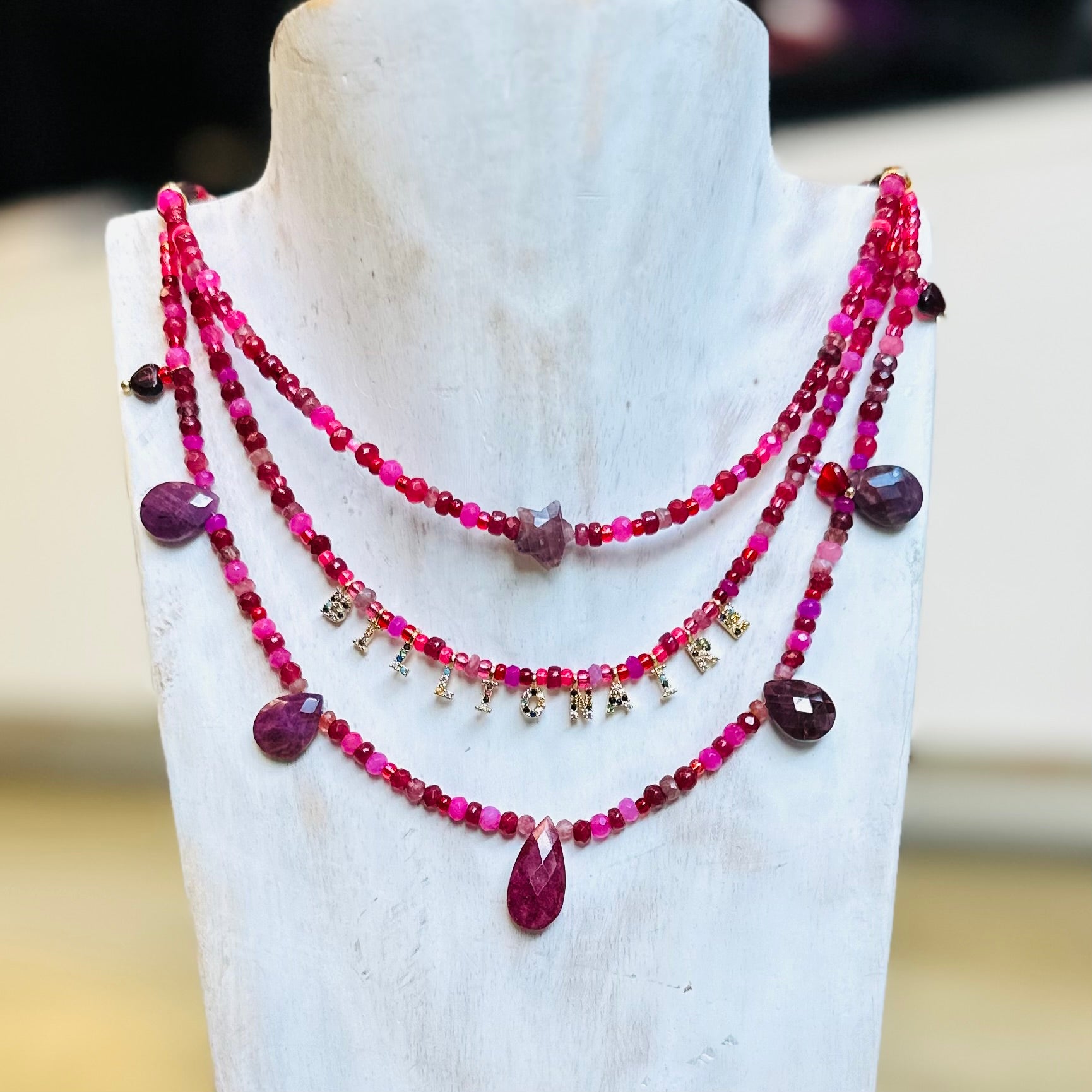 Our BILLIONAIRE Everything Necklace was inspired by @pazpricex fabulous tune BILLIONAIRE (download on @spotifyuk) Handmade in ruby, garnet, agate, opal, red spinel and tourmaline sustainably sourced hand cut rondelles, ruby briolettes, 24kt gold vermeil cz charms and sailor clasp. It has tiny cz letters. You. Can choose your own letters or phrase also.