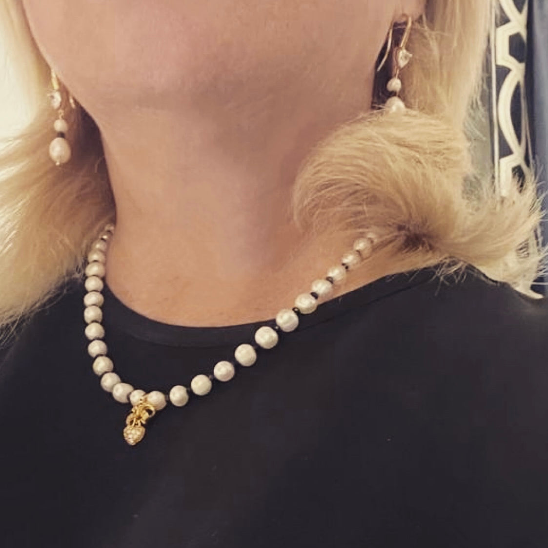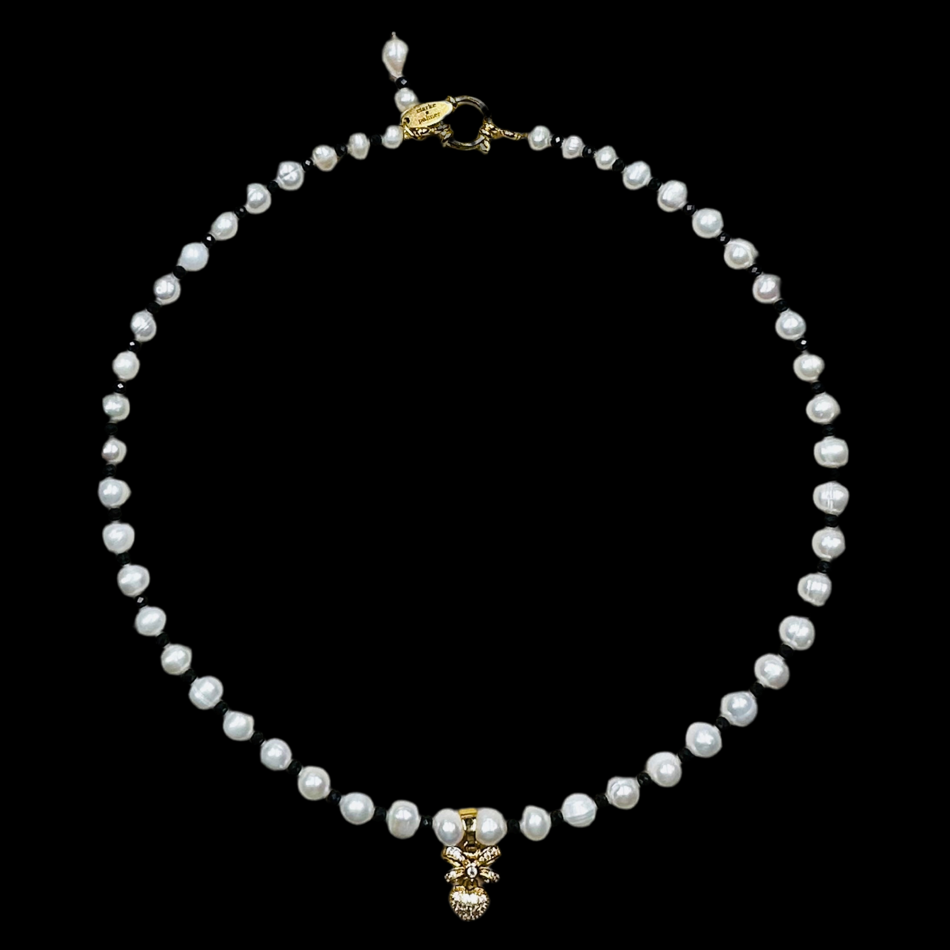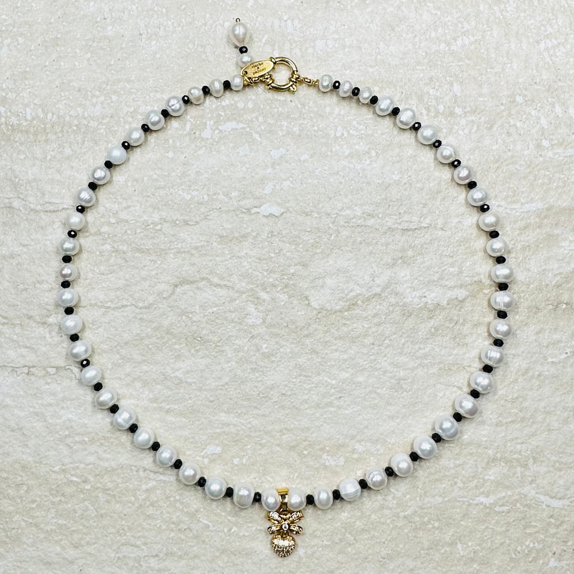 This Necklace is handmade from real ivory-white pearls interspersed with faceted black spinel rondelles and centred by a 24 kt gold vermeil cz heart and bow charm pendant. We love the graphic contrast of the beautiful spinel rondelles against the creamy and white pearls and the and heart bow charm the style of jewellery that Marie Antoinette favoured. Our pearls are sustainably sourced from Japan. It has a 24 kt gold vermeil sailor clasp and a drop pearl and spinel charm.