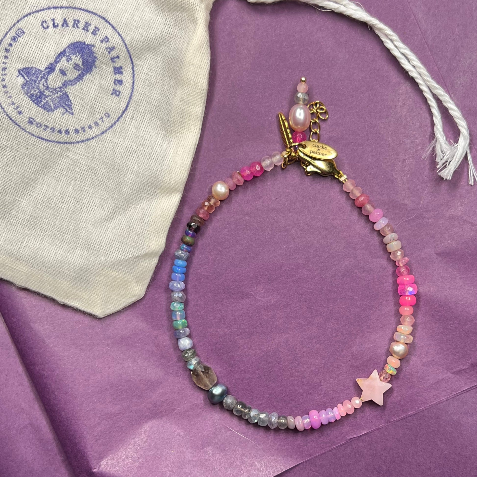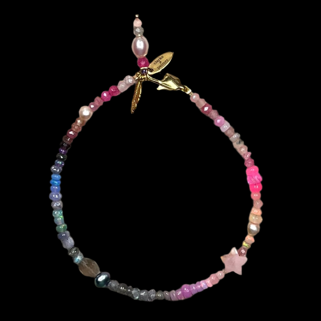 Our Rose Violet Anklet is handmade from ombré shades of purple, delphinium blue and pink sustainably sourced gemstones. It includes hand cut opal, moonstone, garnet, tanzanite, tourmaline, pearl, sapphire, amethyst, ruby and pearl rondelles. You can choose between gold or silver vermeil sailor clasp. Choose your size and in the options.