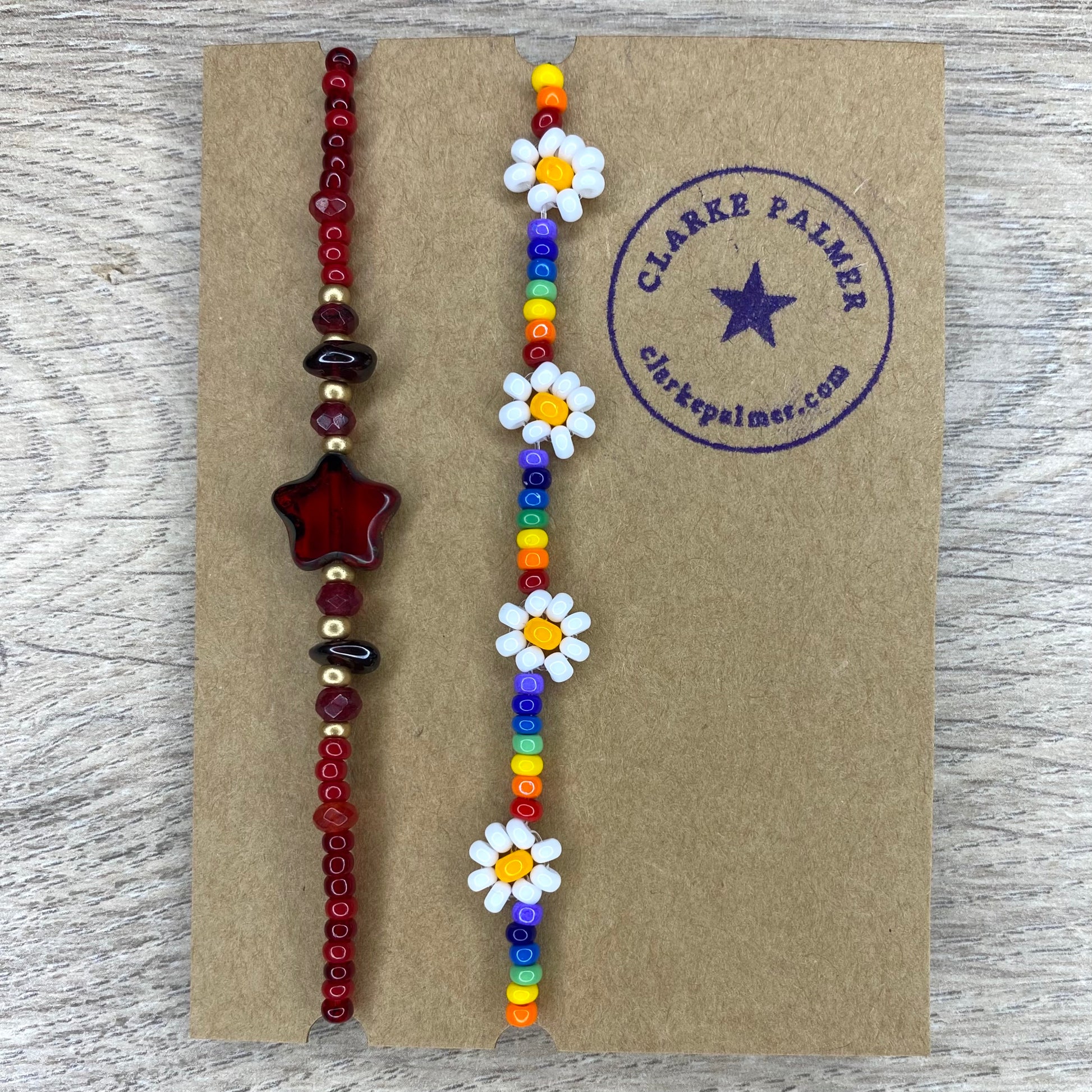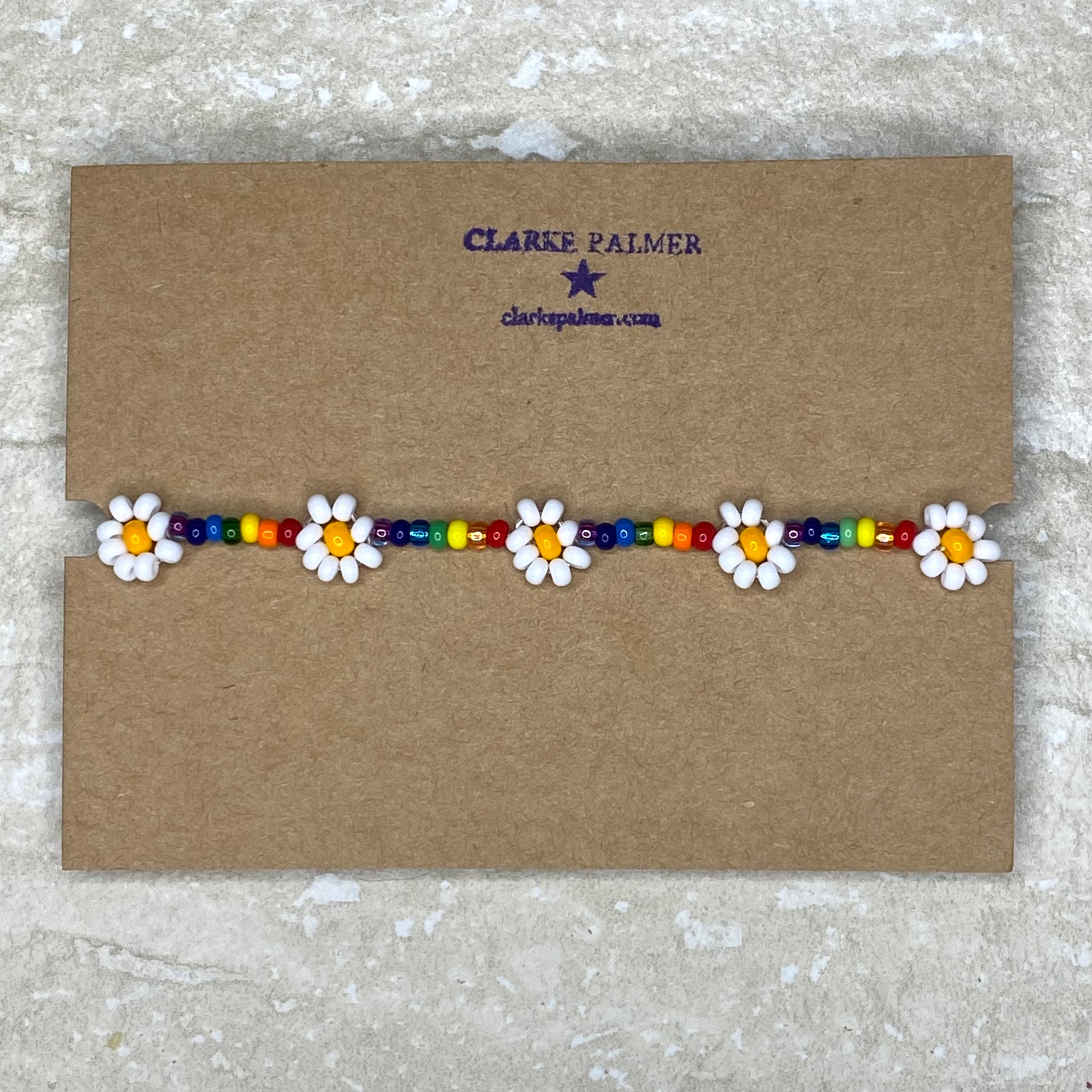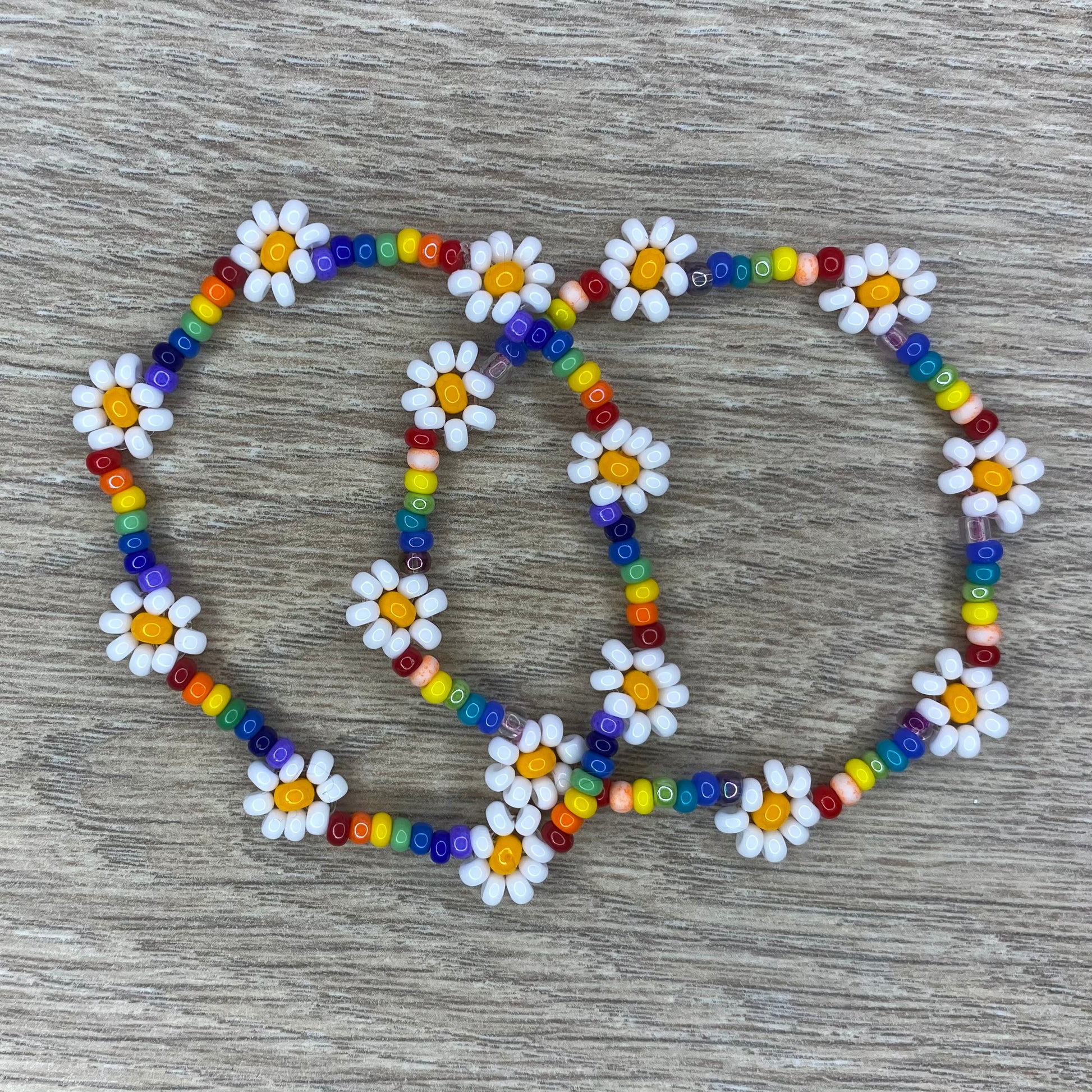 The Daisy Rainbow Beaded Bracelet is handmade from white daisies with yellow centres joined with rainbow Preciosa and Miyuki glass beads. Choose your size and optional 24kt gold vermeil letter in the options.