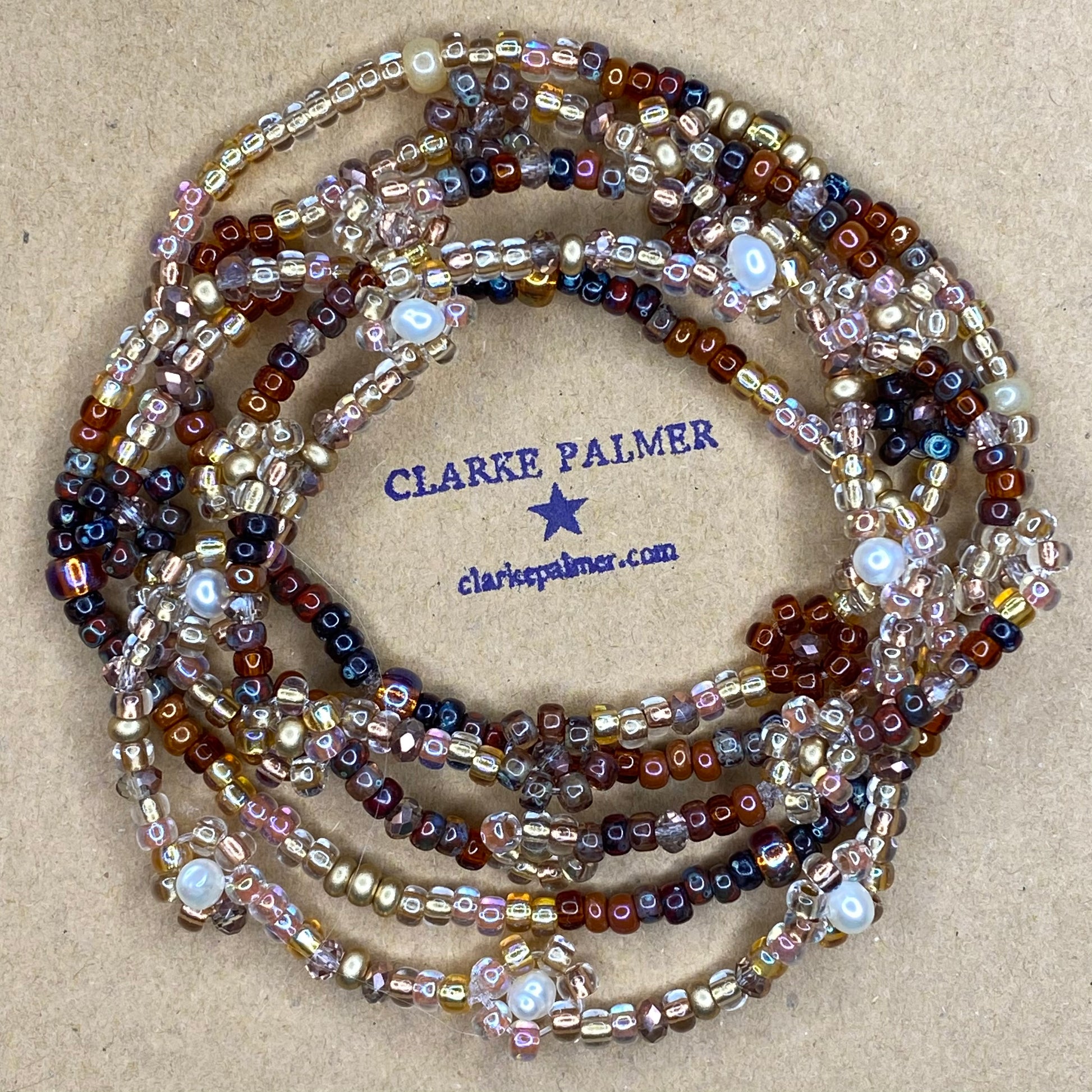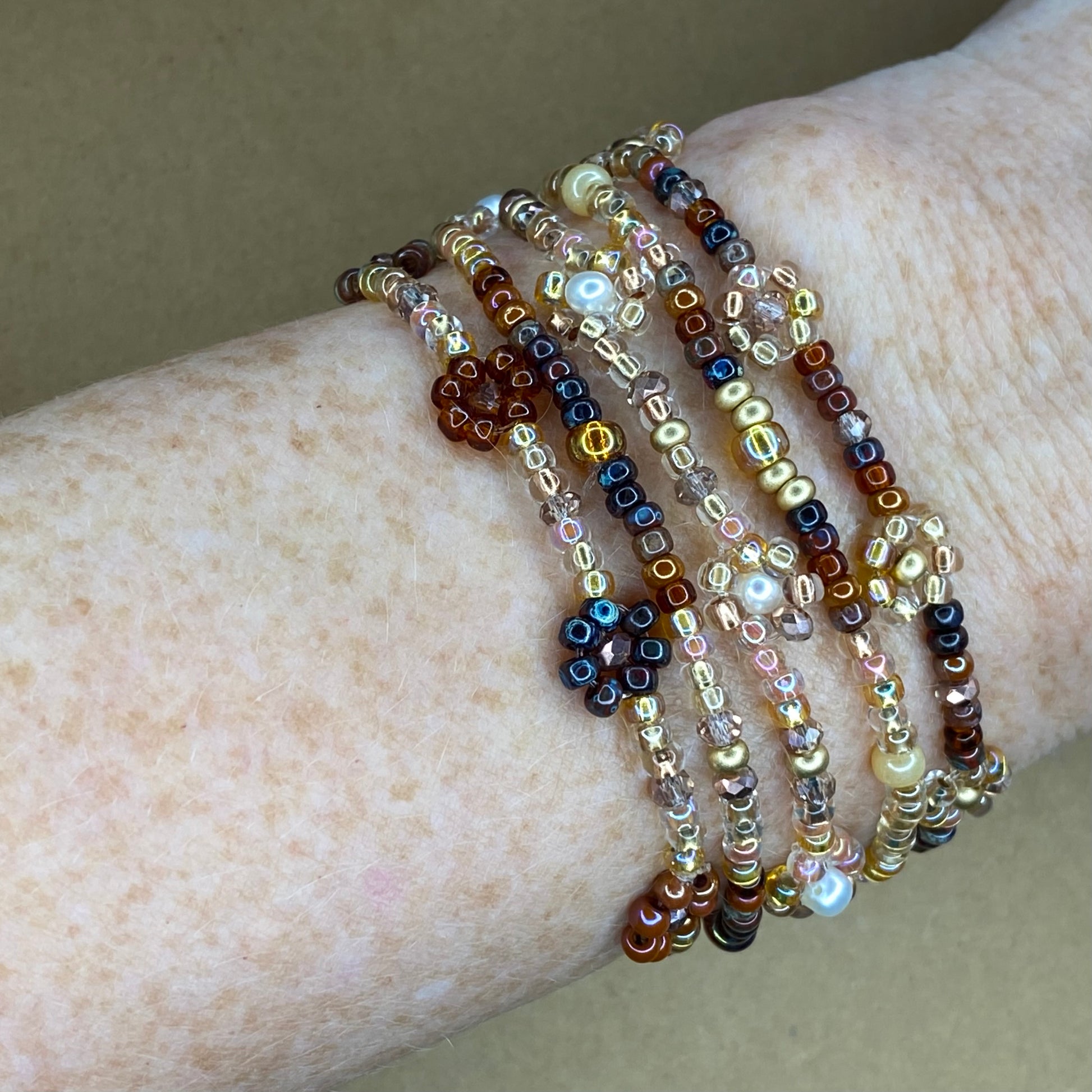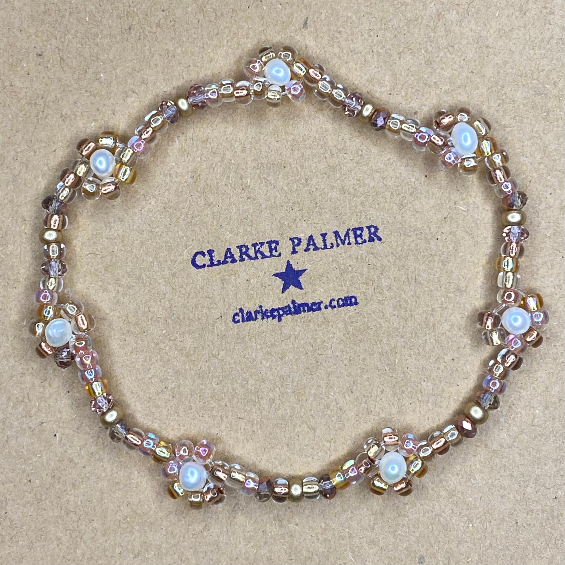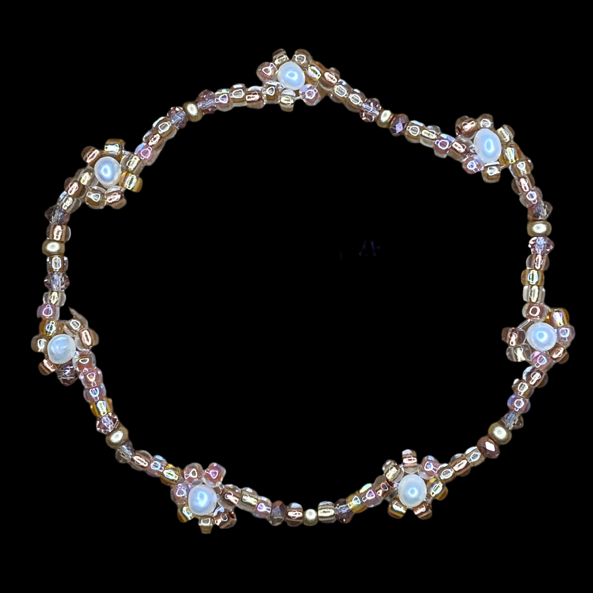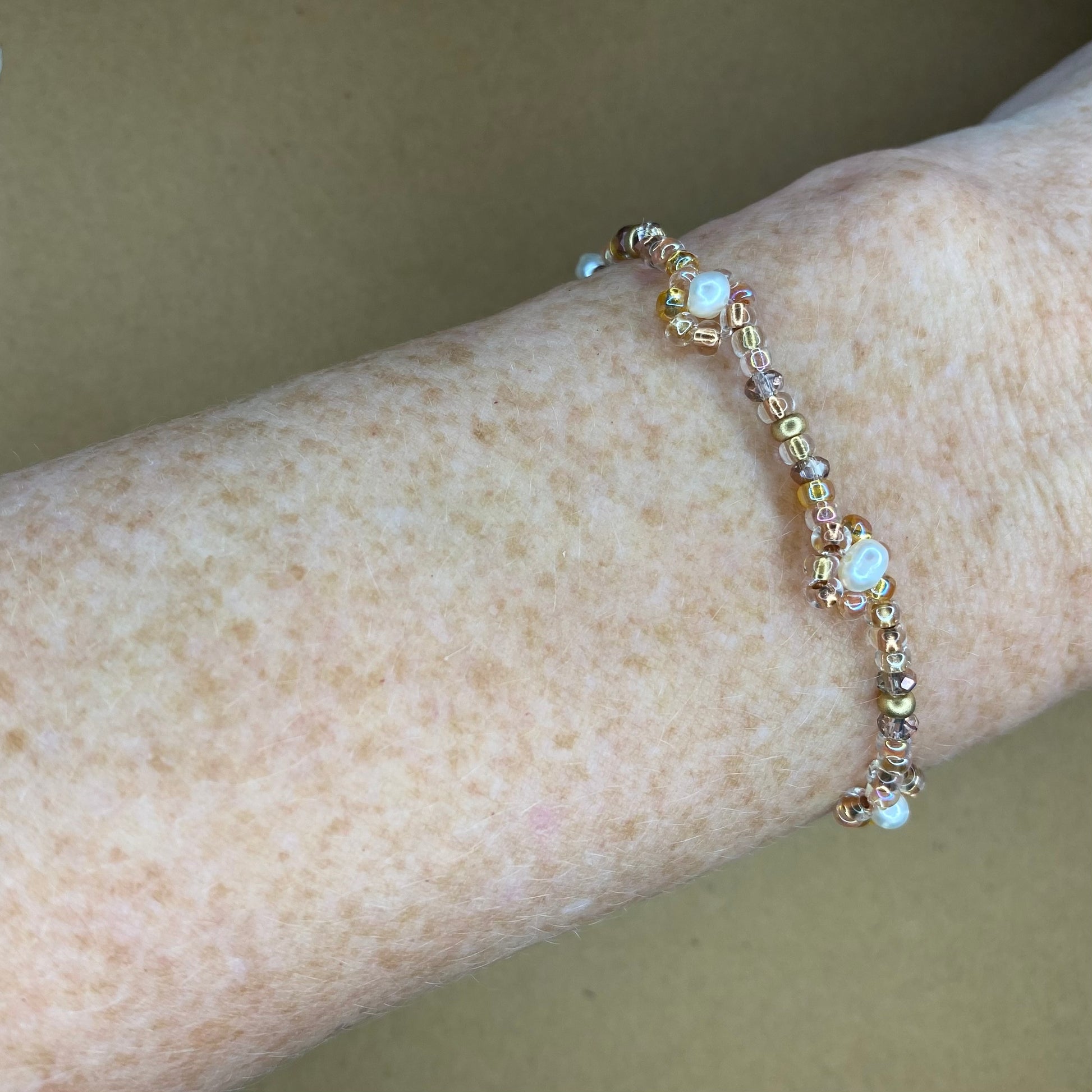 The Daisy Rosy Glow Pearl Bracelet is handmade from rose gold Preciosa and Miyuki glass beads with freshwater pearls. Choose your size and optional 24kt gold vermeil letter in the options.