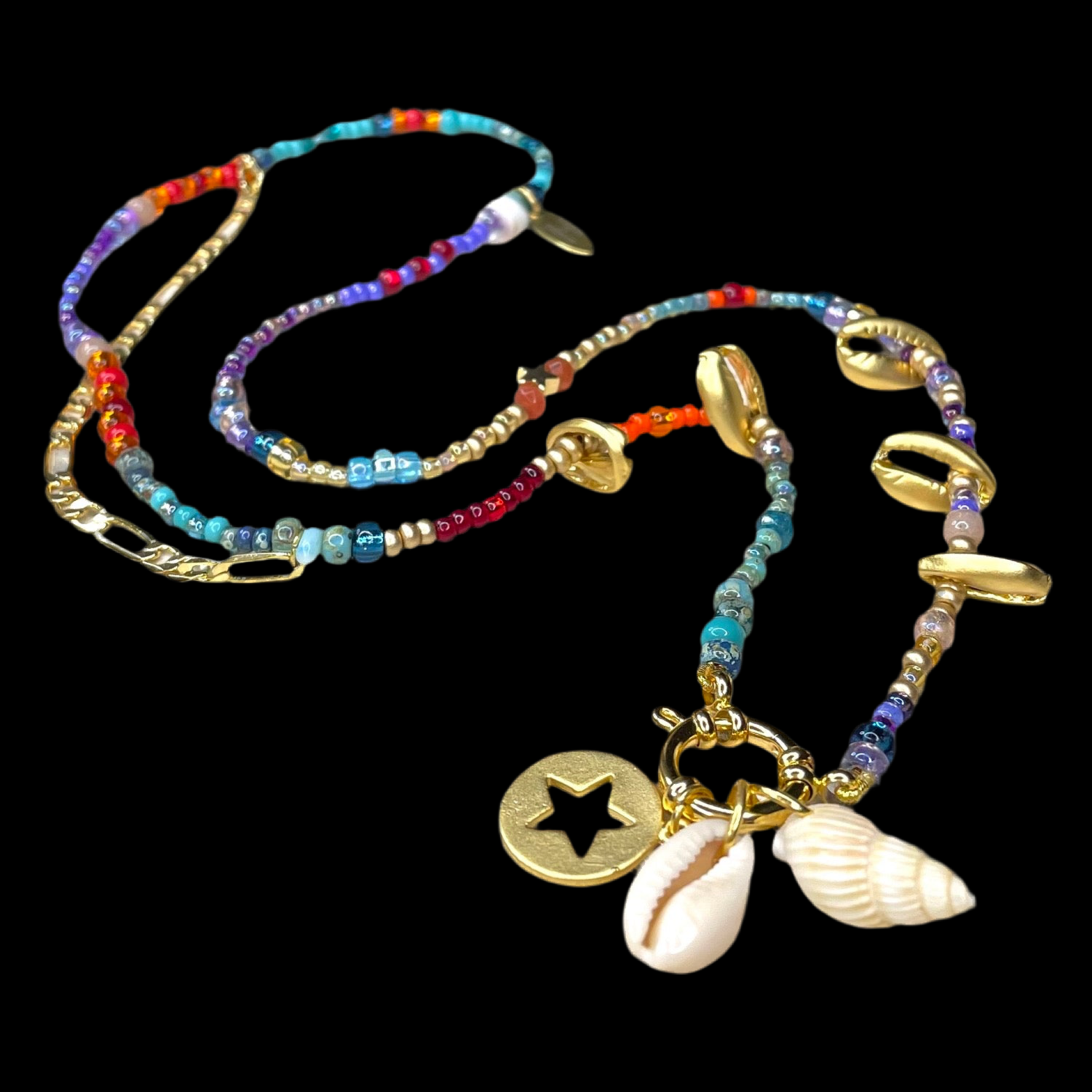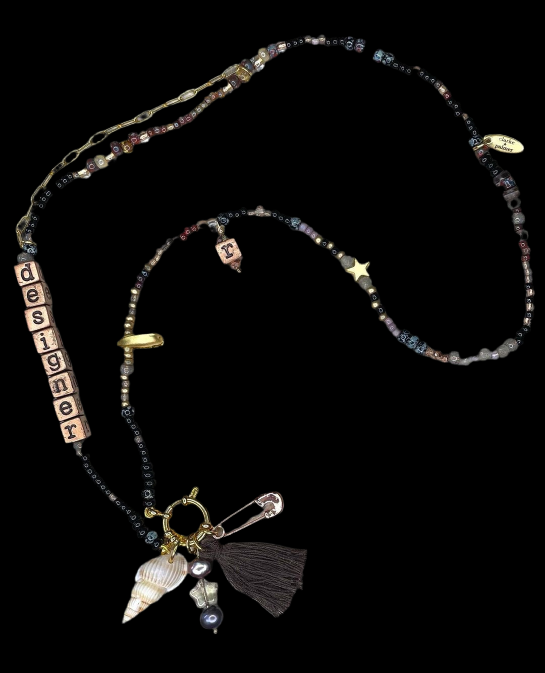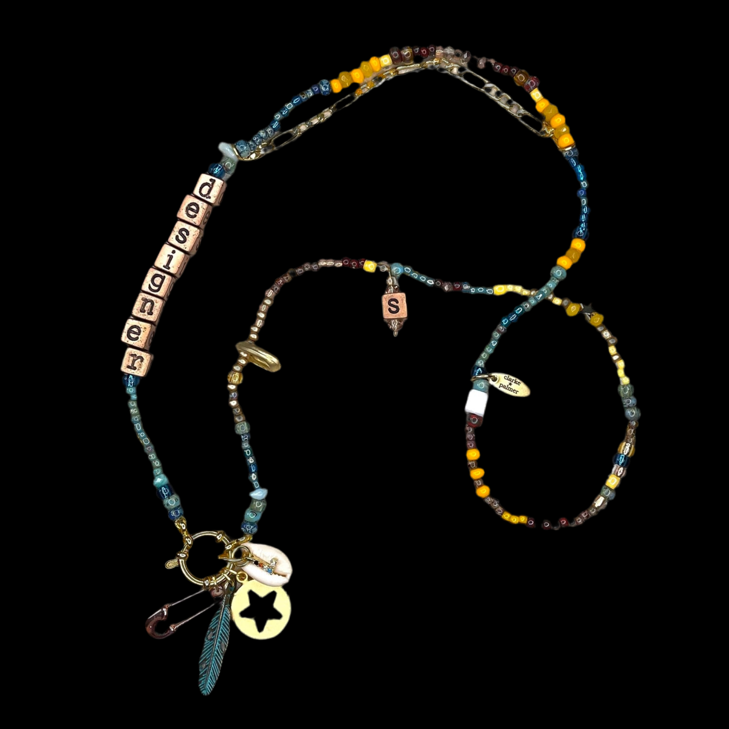 The 'Designer' clasp charm necklace is handmade from turquoise, yellow and purple shades of Preciosa, Miyuki glass beads, agate faceted rondelles and pearls with 24kt gold vermeil figaro chains, clasp and 3 charms of your choice. Choose your own shades and from choker length 40 cm, medium 45 cm and long 50 cm (pictured), 3 charms (price included) and upgrade to 24kt gold vermeil letters in the options.