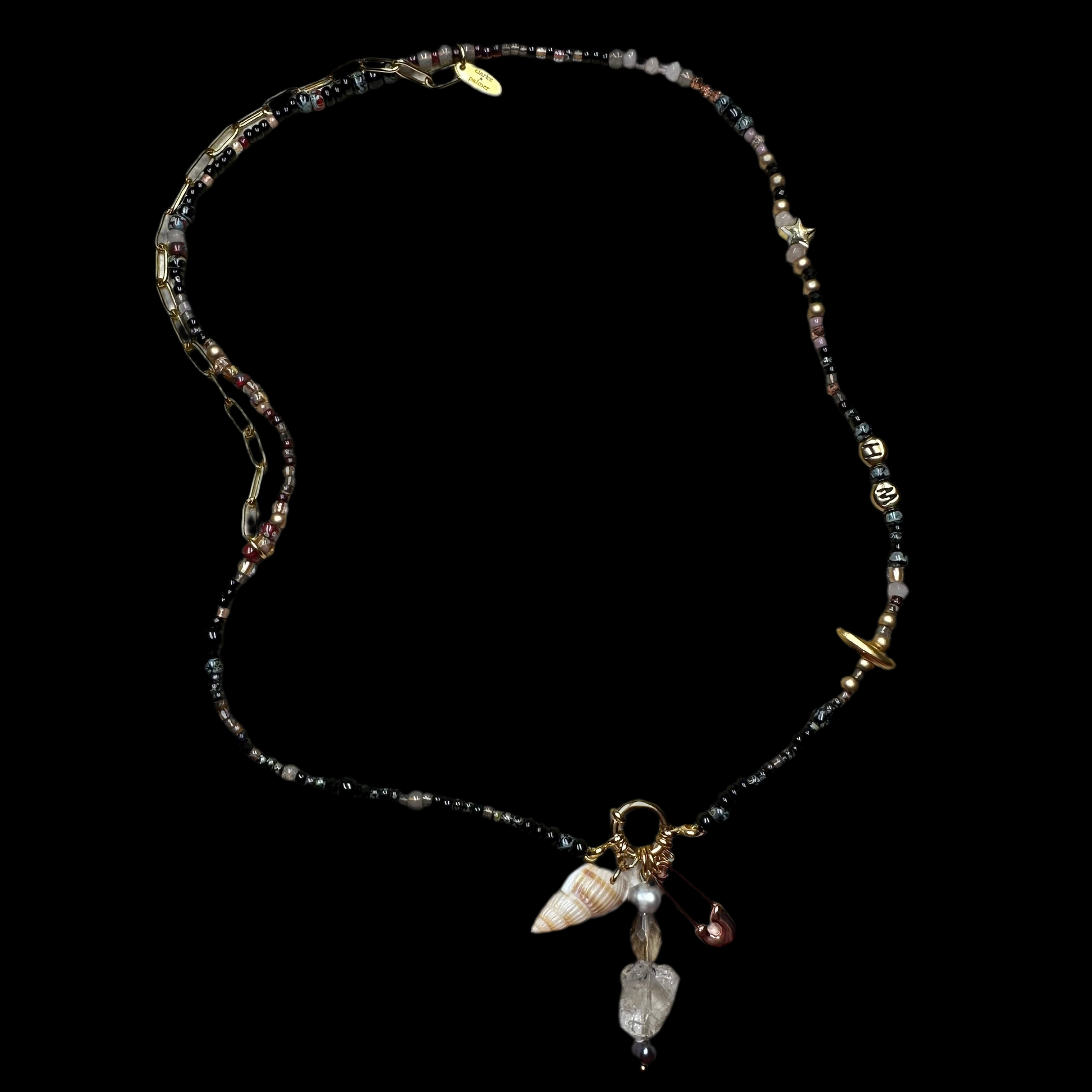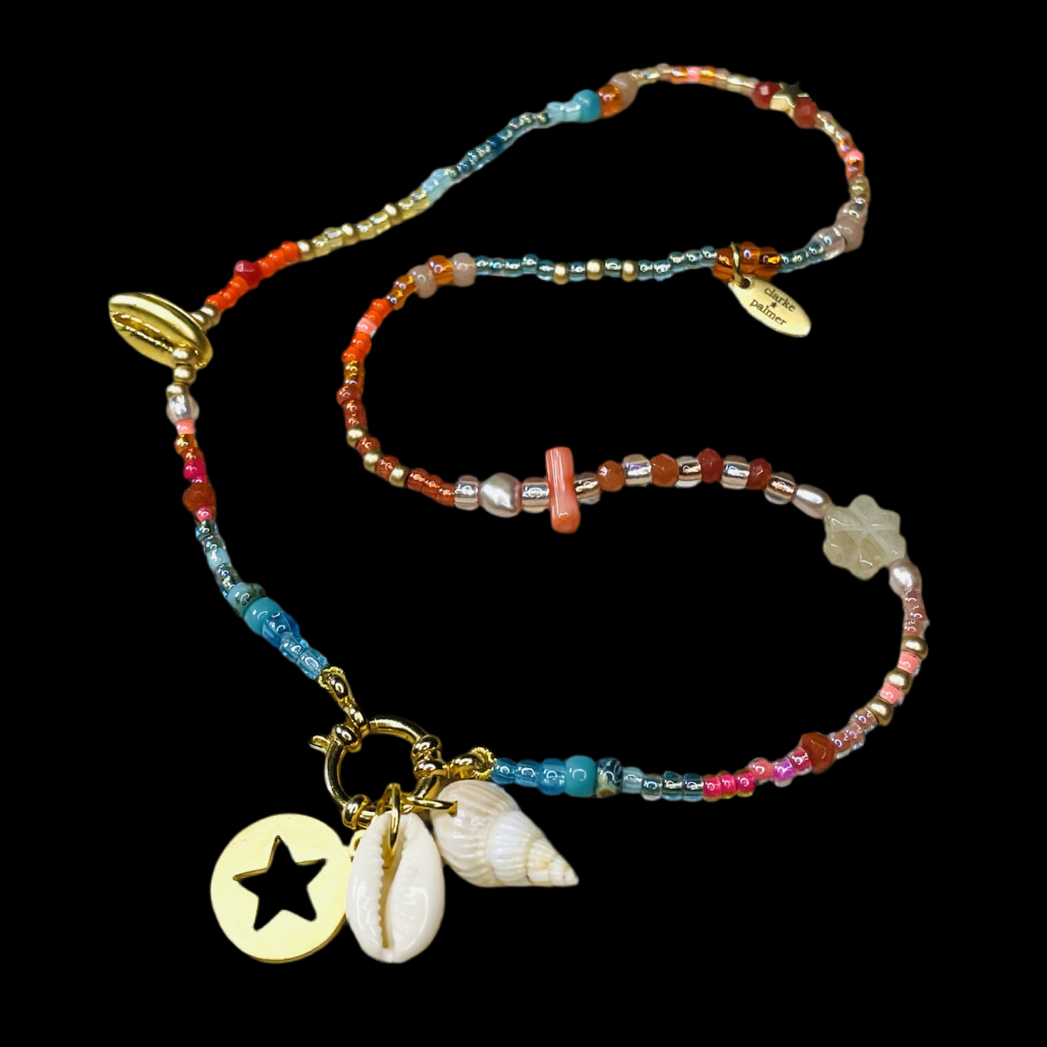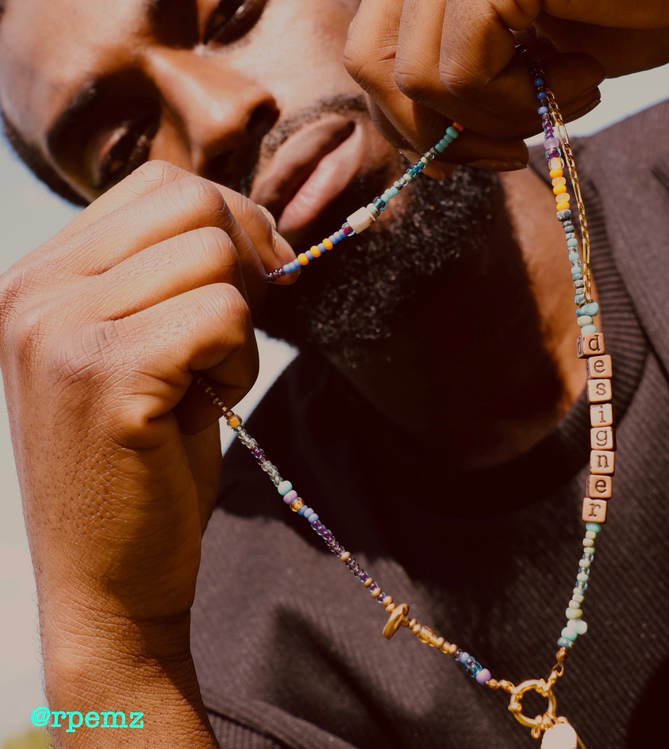 The 'Designer' clasp charm necklace is handmade from turquoise, yellow and purple shades of Preciosa, Miyuki glass beads, agate faceted rondelles and pearls with 24kt gold vermeil figaro chains, clasp and 3 charms of your choice. Choose your own shades and from choker length 40 cm, medium 45 cm and long 50 cm (pictured), 3 charms (price included) and upgrade to 24kt gold vermeil letters in the options.