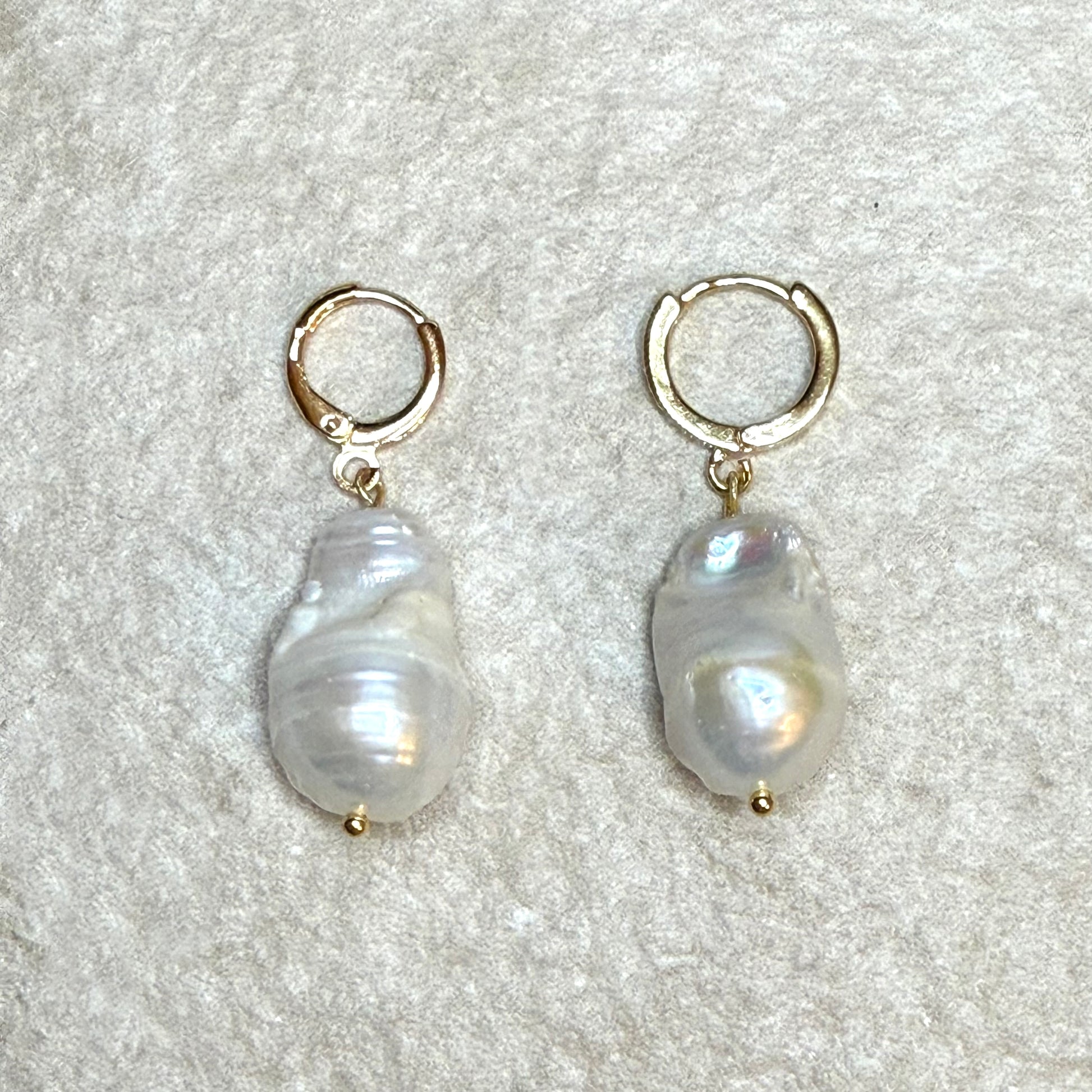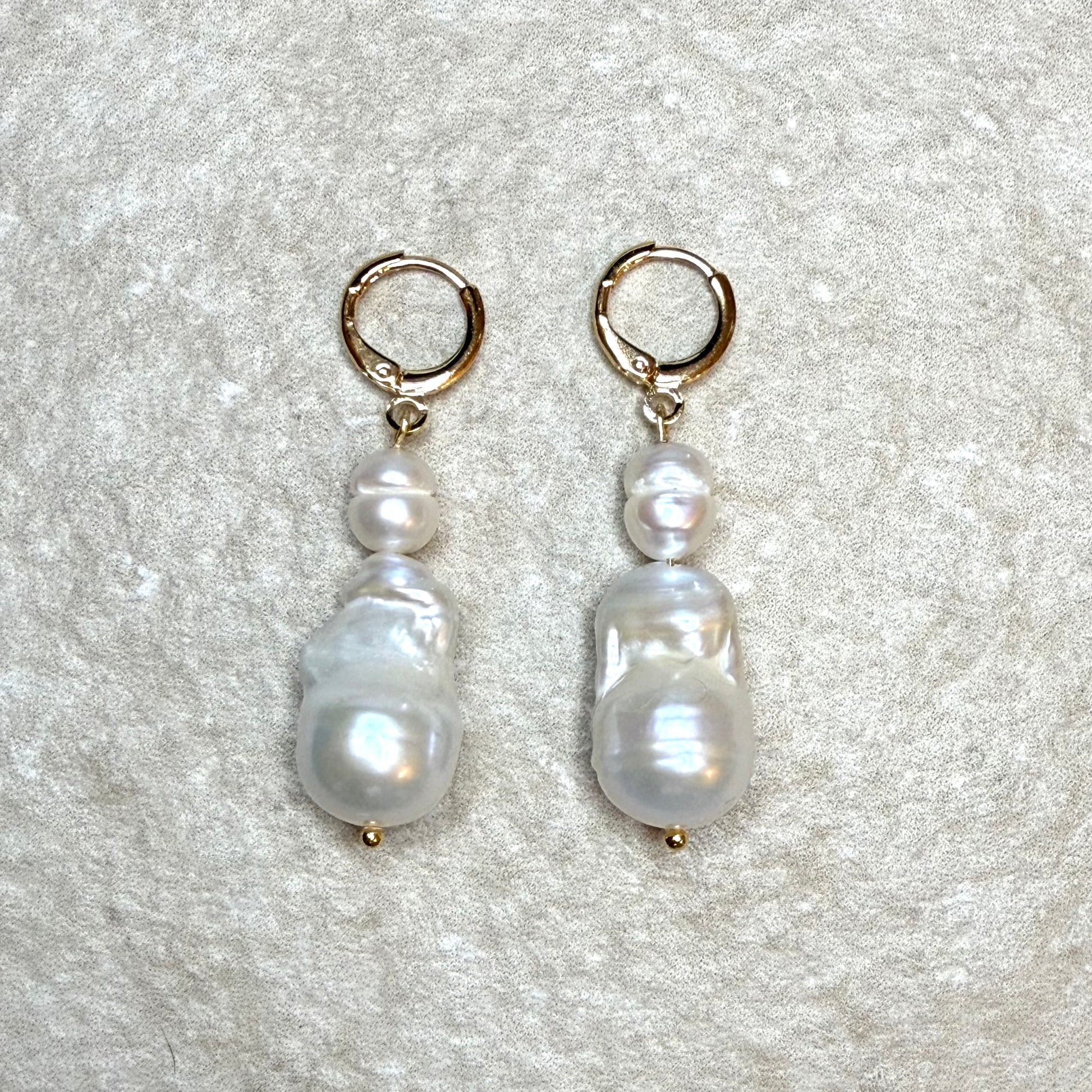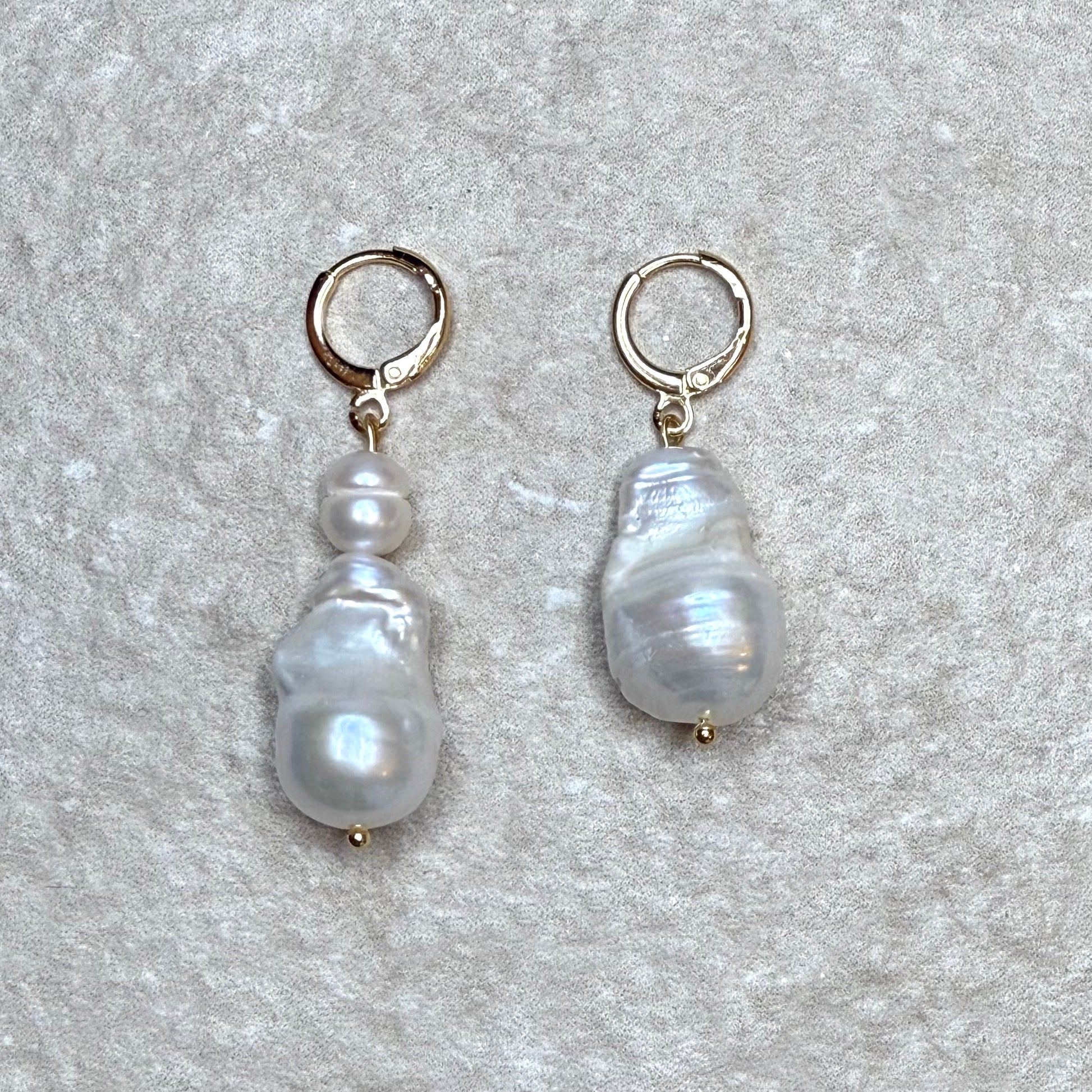 Each earring features a pair of organically sculpted freshwater pearls that dance with light, suspended from slender 22kt gold vermeil links. The duo of pearls - unique in shape and glow - brings an artful asymmetry that feels both timeless and deeply personal.