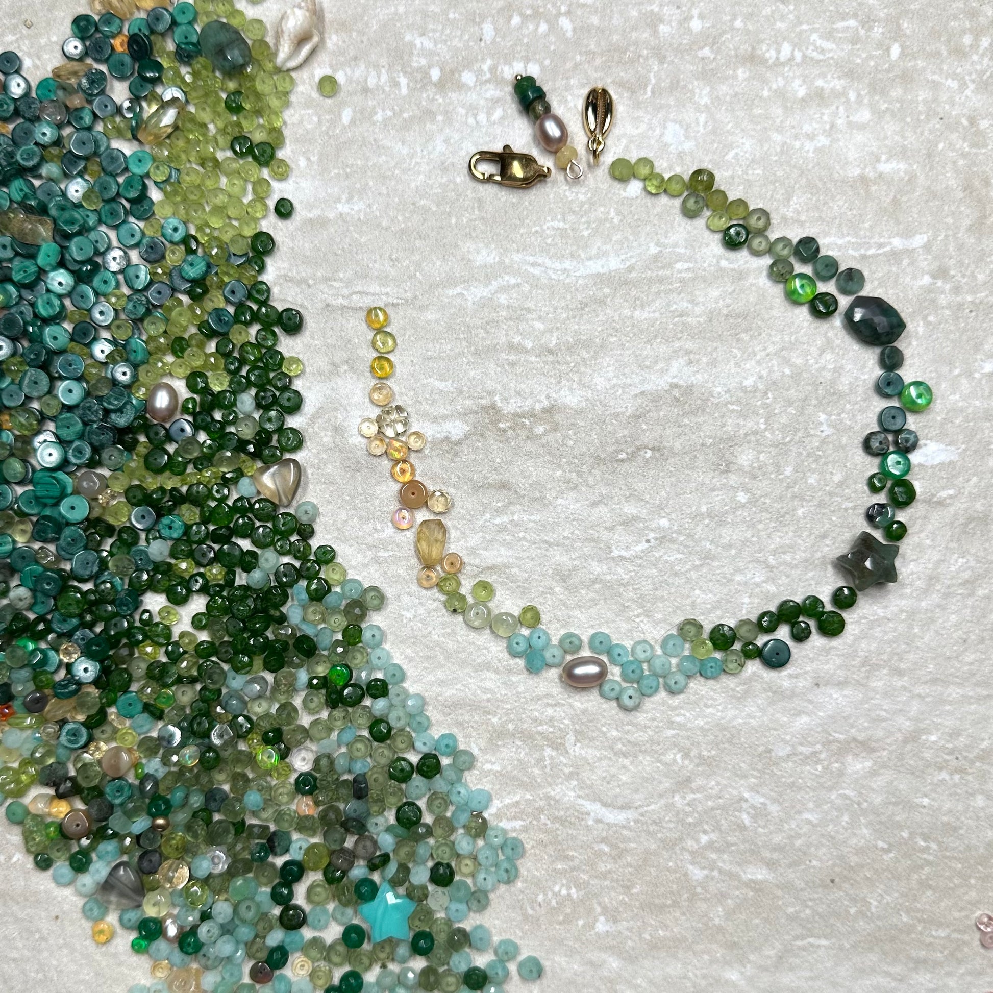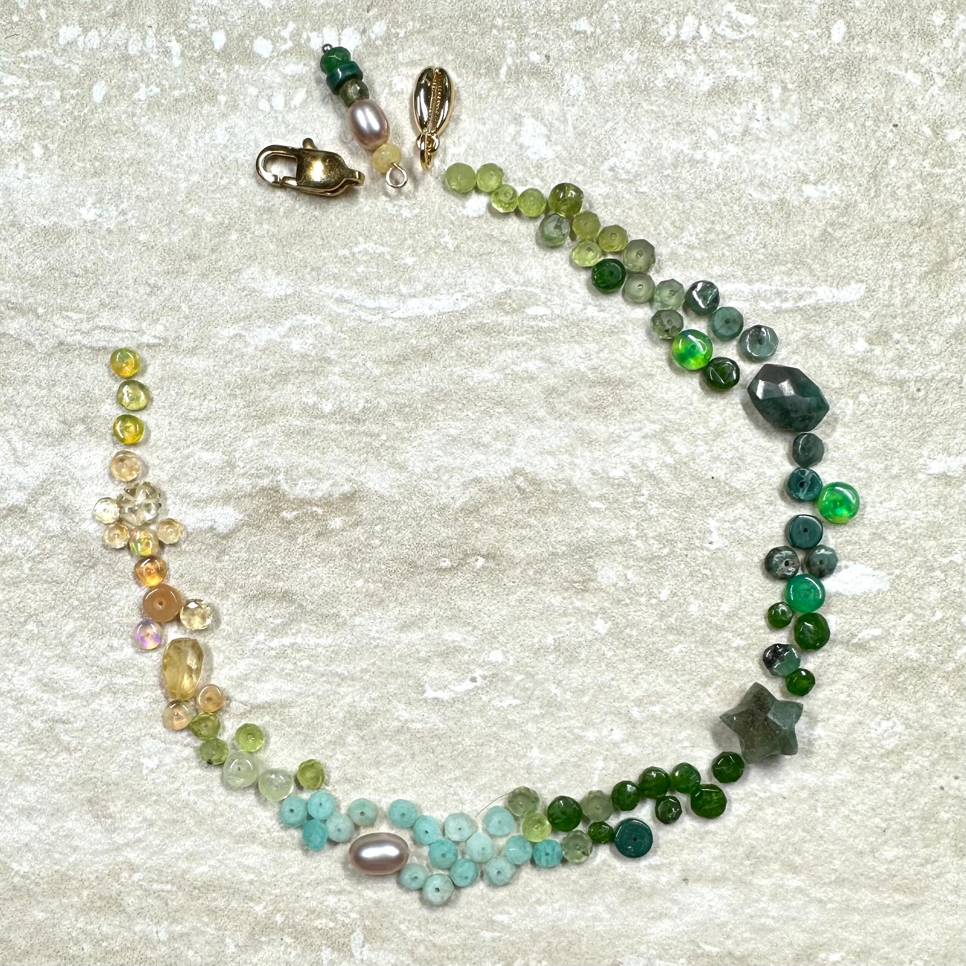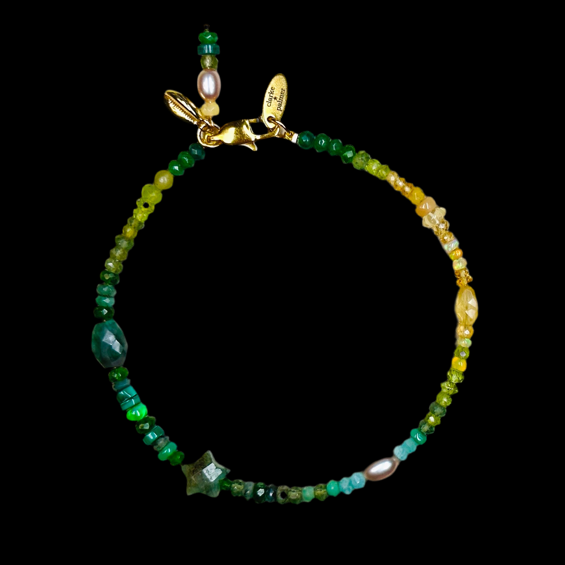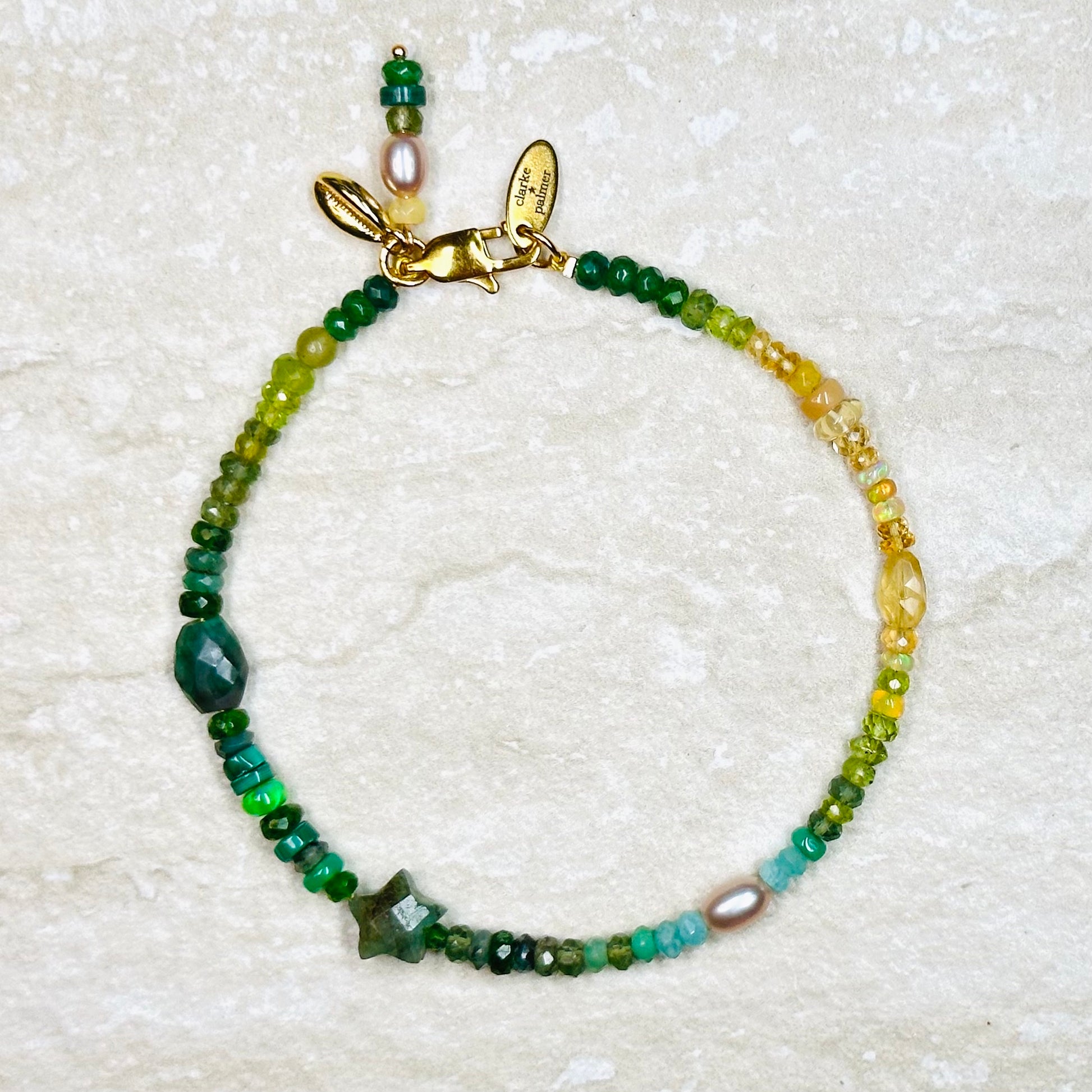 Our stunning ‘Eden’ Anklet is handmade from ombré shades of sustainably sourced gemstones. It includes hand cut emerald star and opal, emerald, apatite, citrine, malachite, peridot, chrysoprase and pearl rondelles. It has a pearl and gemstone charm.