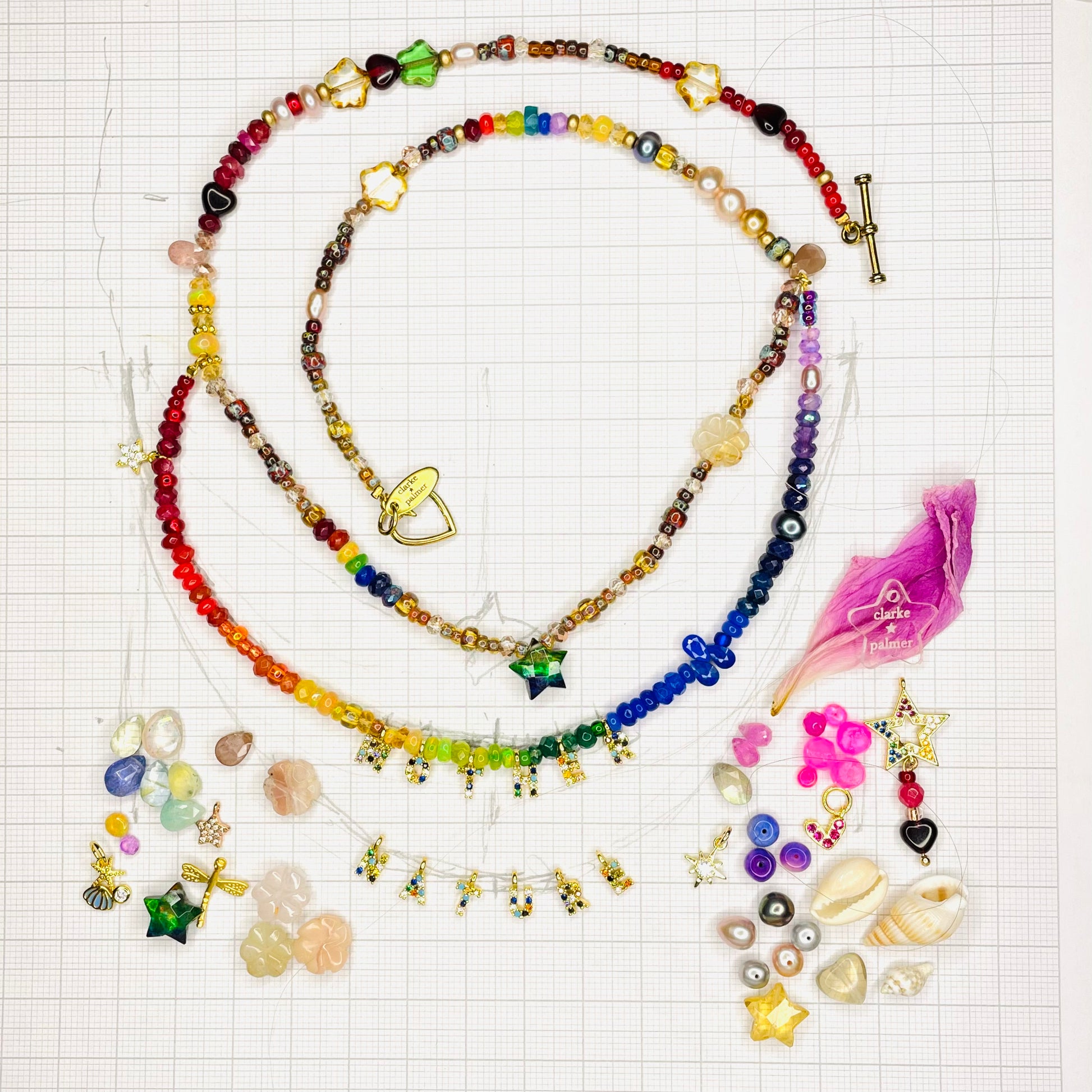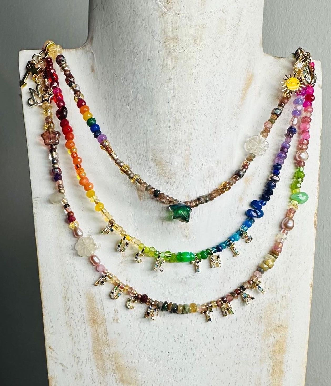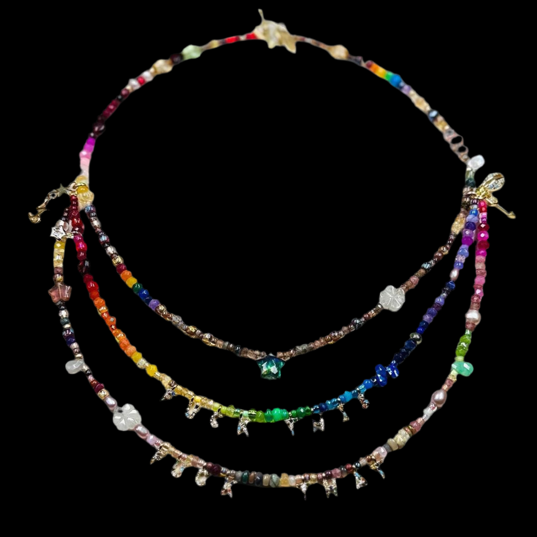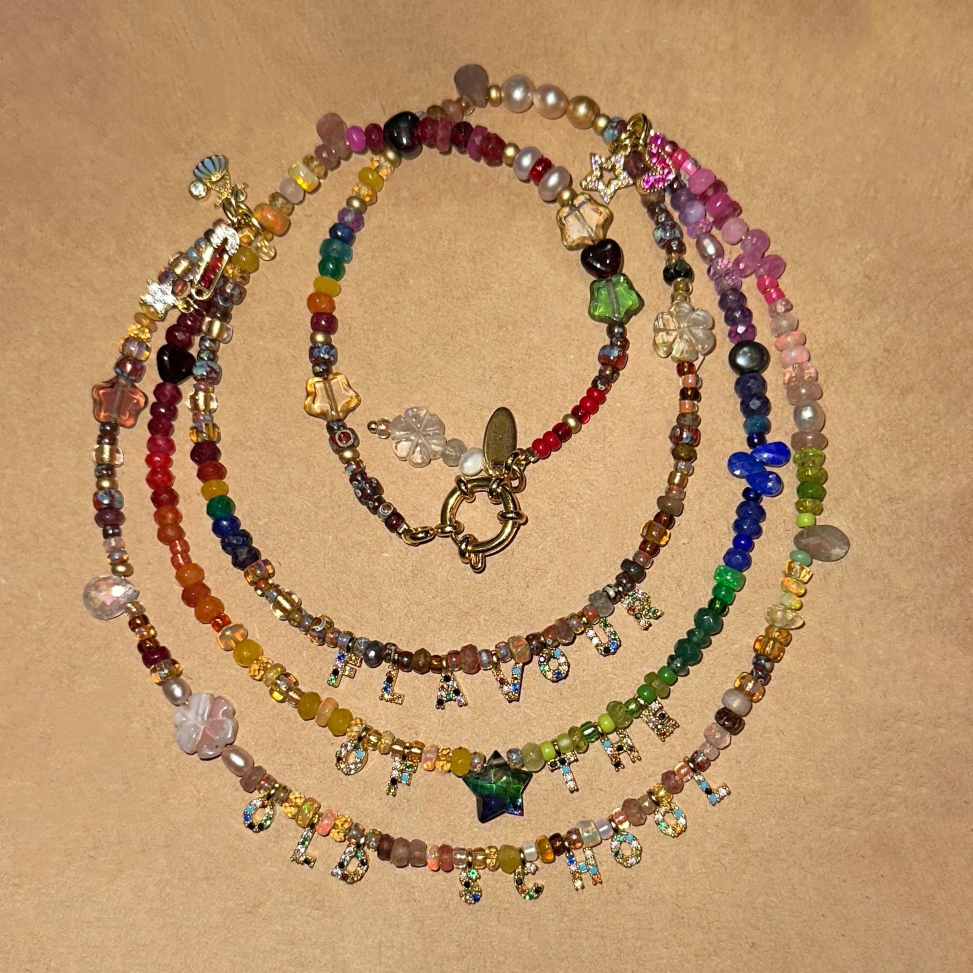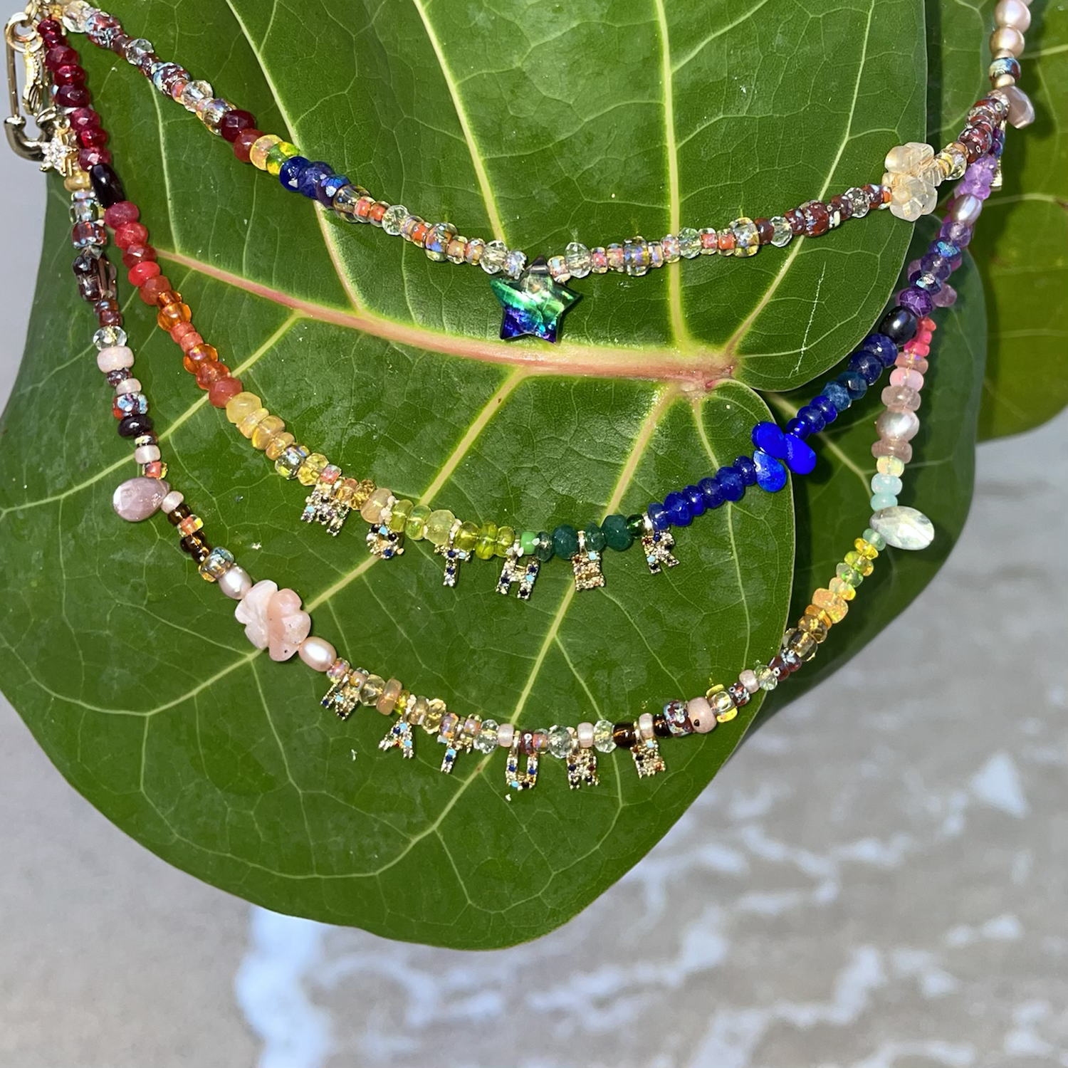 Part of our Precious Elements Collection, the Everything Mother Nature Necklace blends rainbow and earthy shades of precious and semi-precious stones including sustainably sourced ruby, Ethiopian opal, andesine, tourmaline, sapphire, emerald, garnet, citrine, peridot, amethyst, moonstone and Preciosa and Miyuki glass beads. Make your choice of tiny 24 kt Gold cz letters and length in the options.