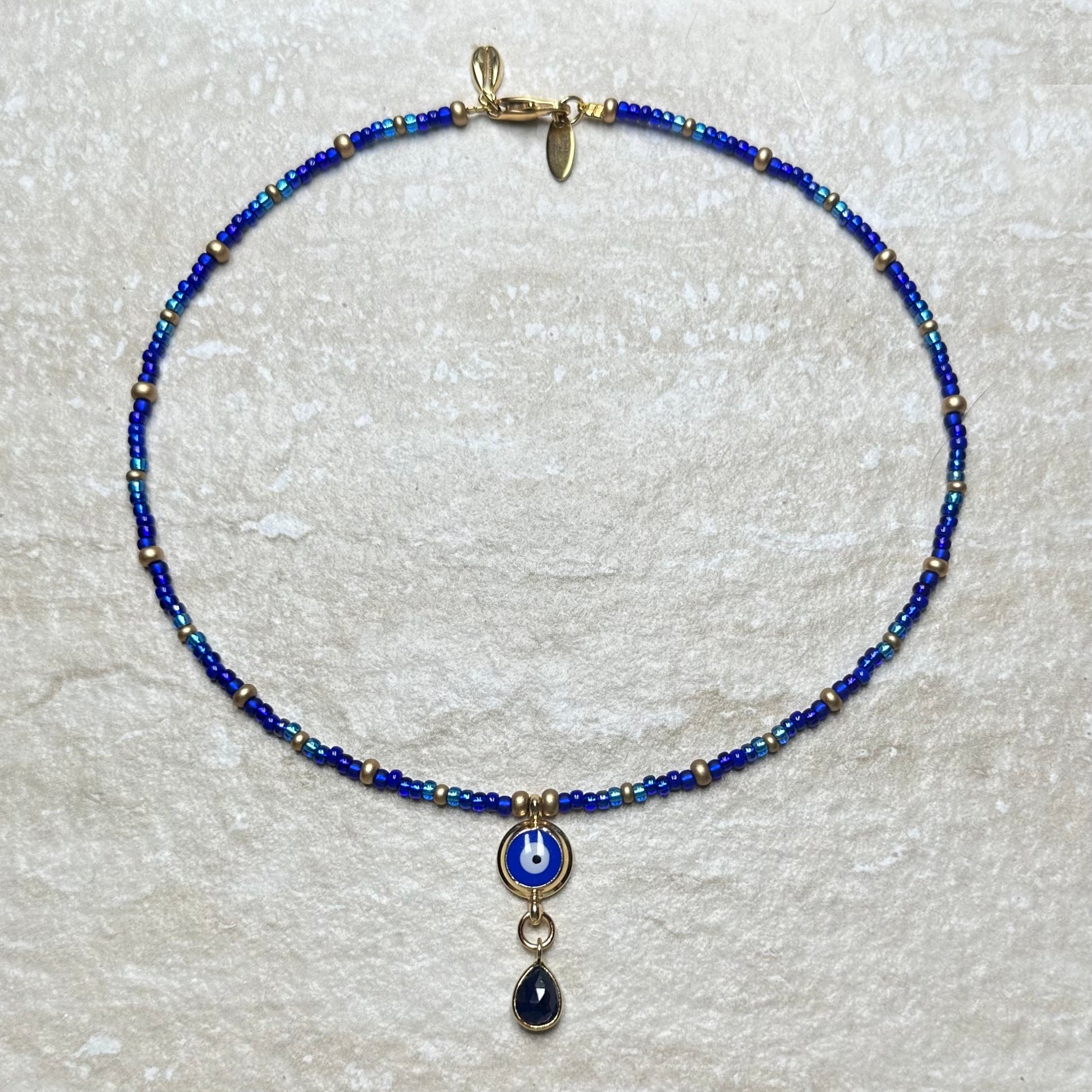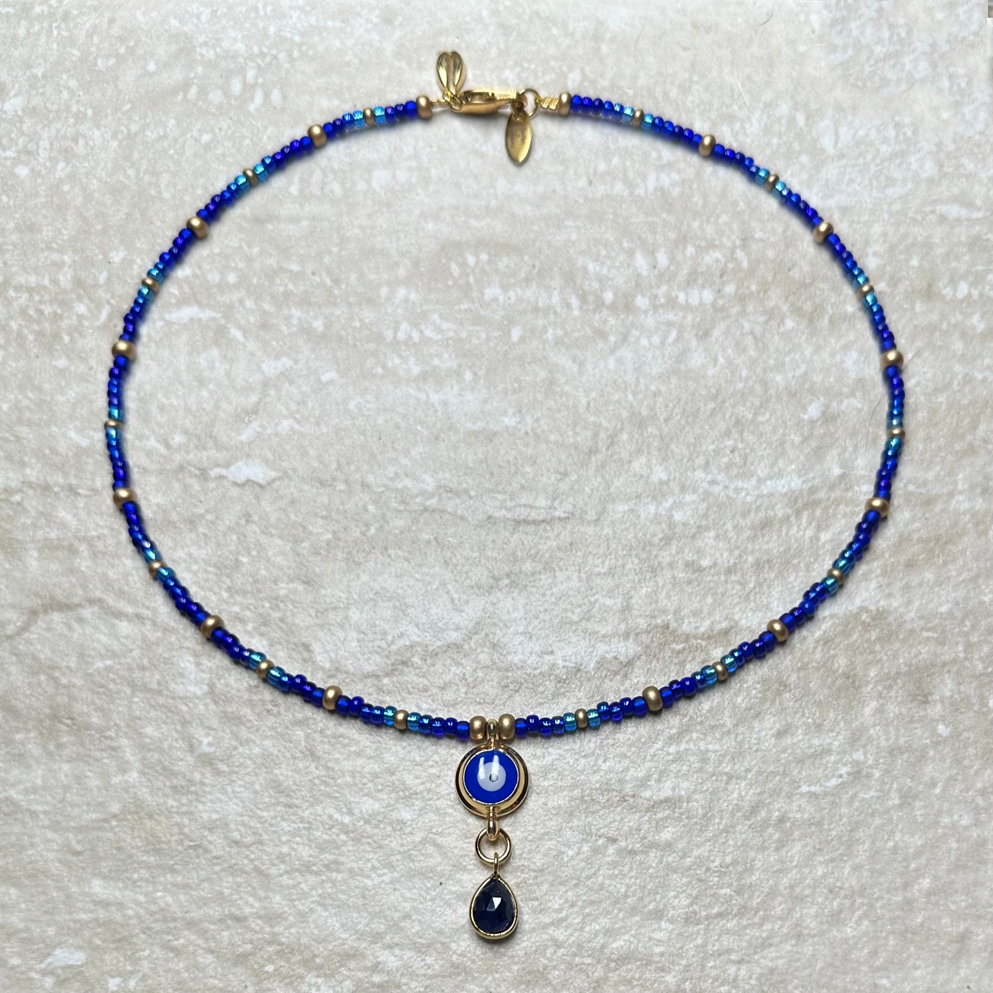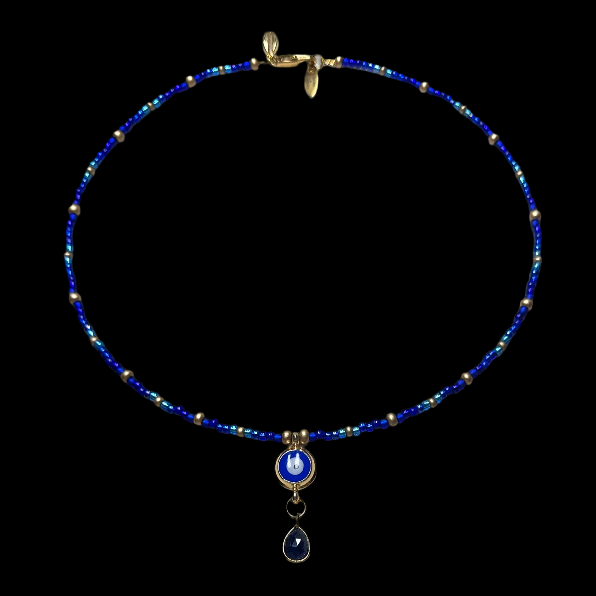 Our Evil Eye Drop Sapphire Beaded Necklace is handmade with 7 shades of deep blue, ultramarine, peacock, azure and gold Preciosa and Miyuki glass beads. It has an evil eye charm and real Burmese sapphire Briolette drop set in 22 kt gold vermeil with a 22 kt gold vermeil clasp.