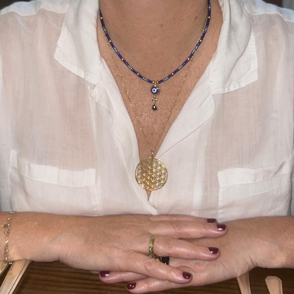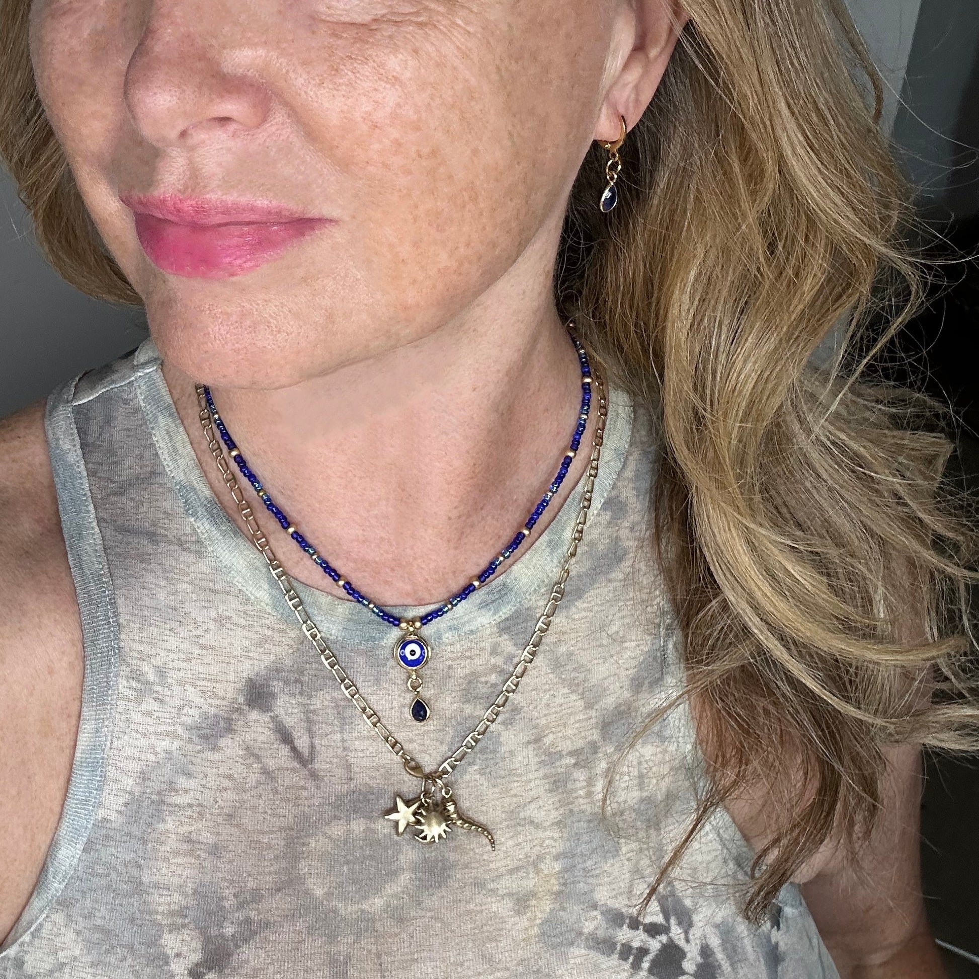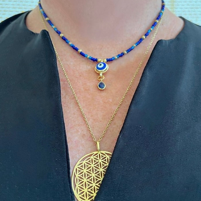 Our Evil Eye Drop Sapphire Beaded Necklace is handmade with 7 shades of deep blue, ultramarine, peacock, azure and gold Preciosa and Miyuki glass beads. It has an evil eye charm and real Burmese sapphire Briolette drop set in 22 kt gold vermeil with a 22 kt gold vermeil clasp.