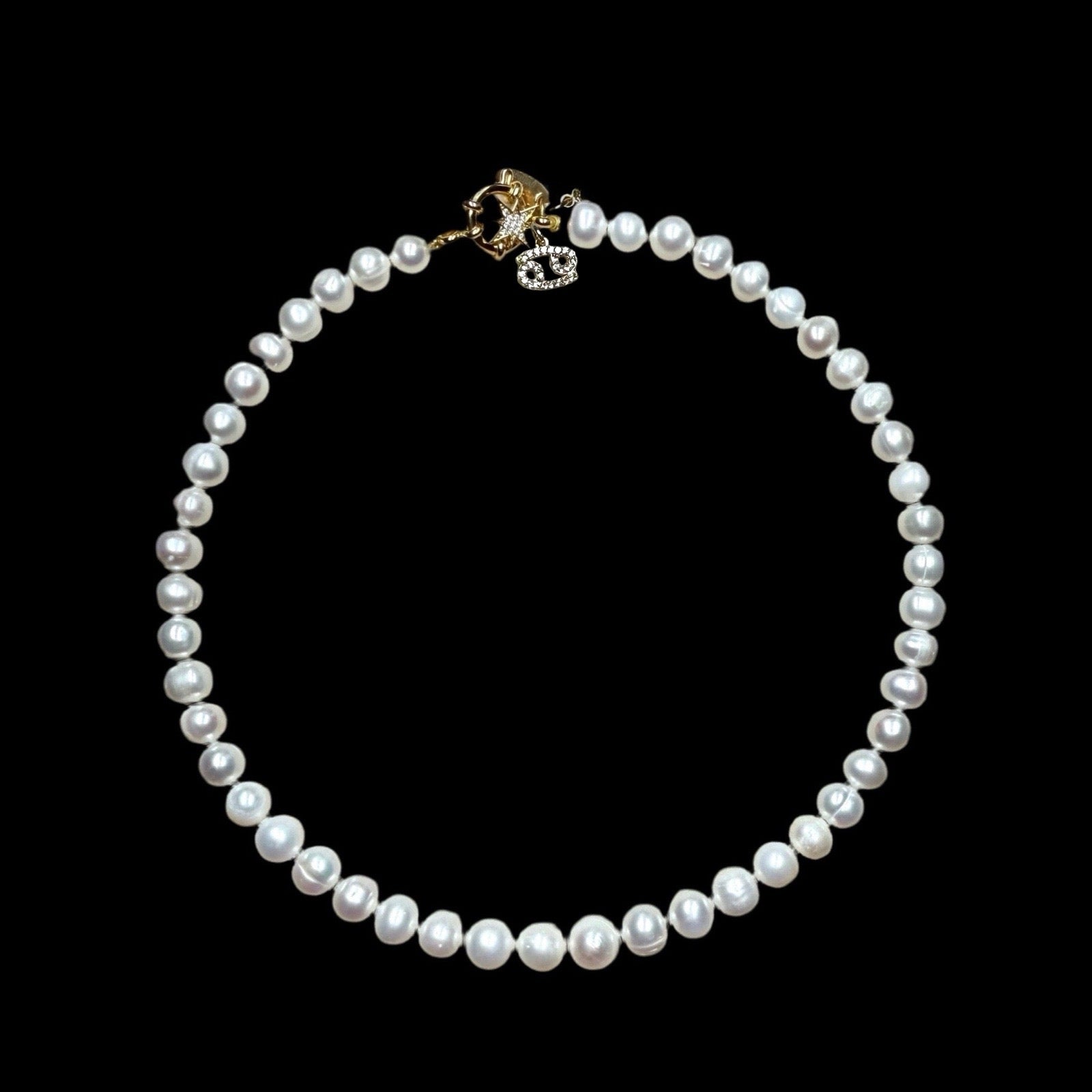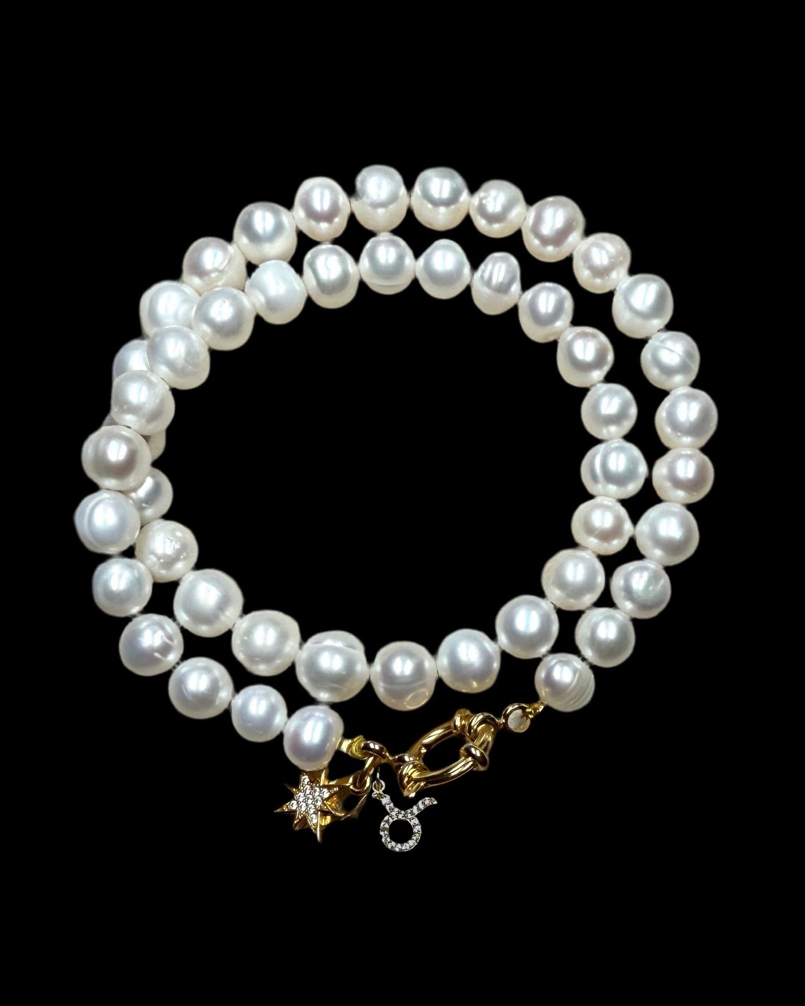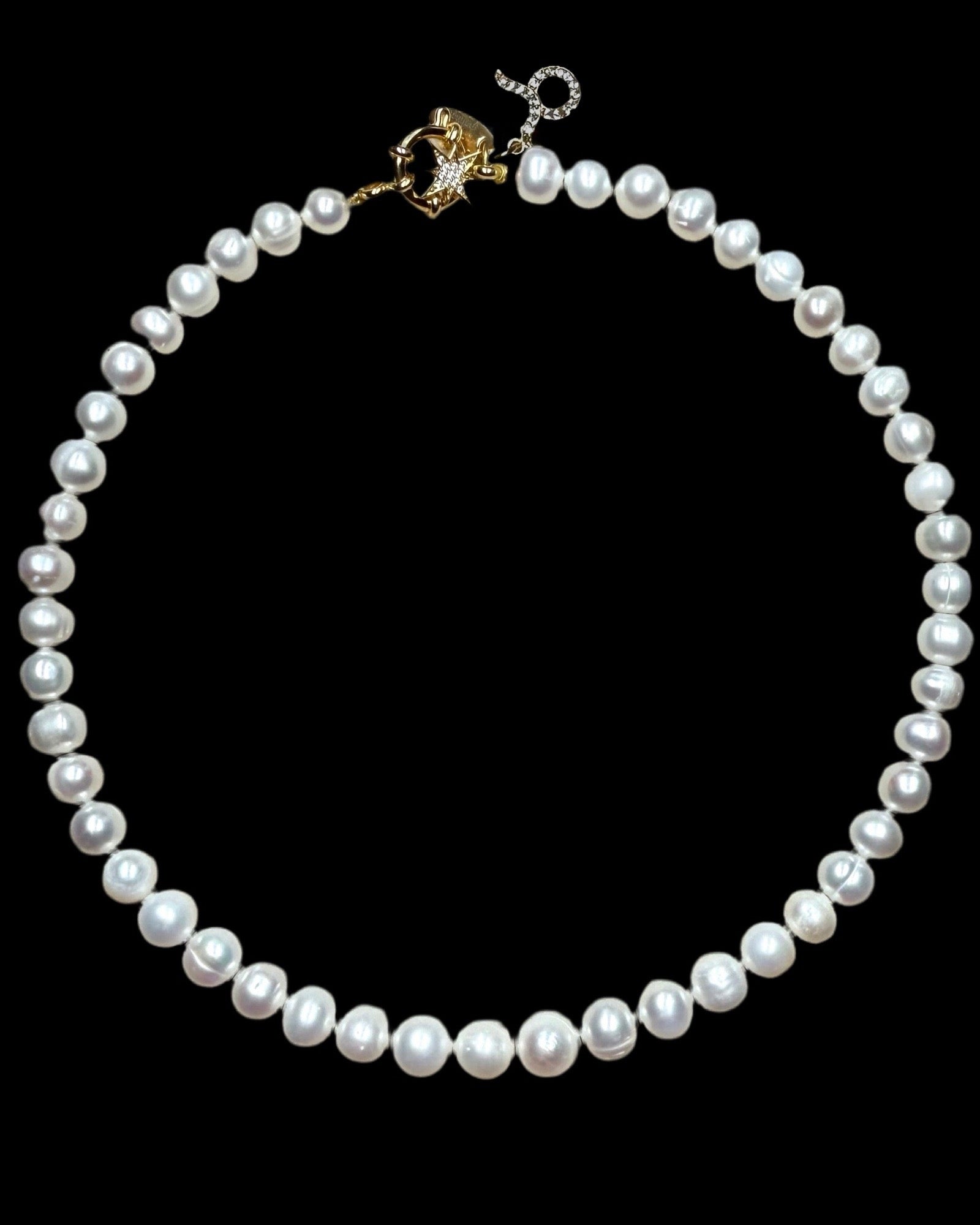 This is our classic pearl single strand necklace with your chosen 22kt gold vermeil CZ horoscope charm. The clasp is a 22kt gold vermeil sailor clasp.