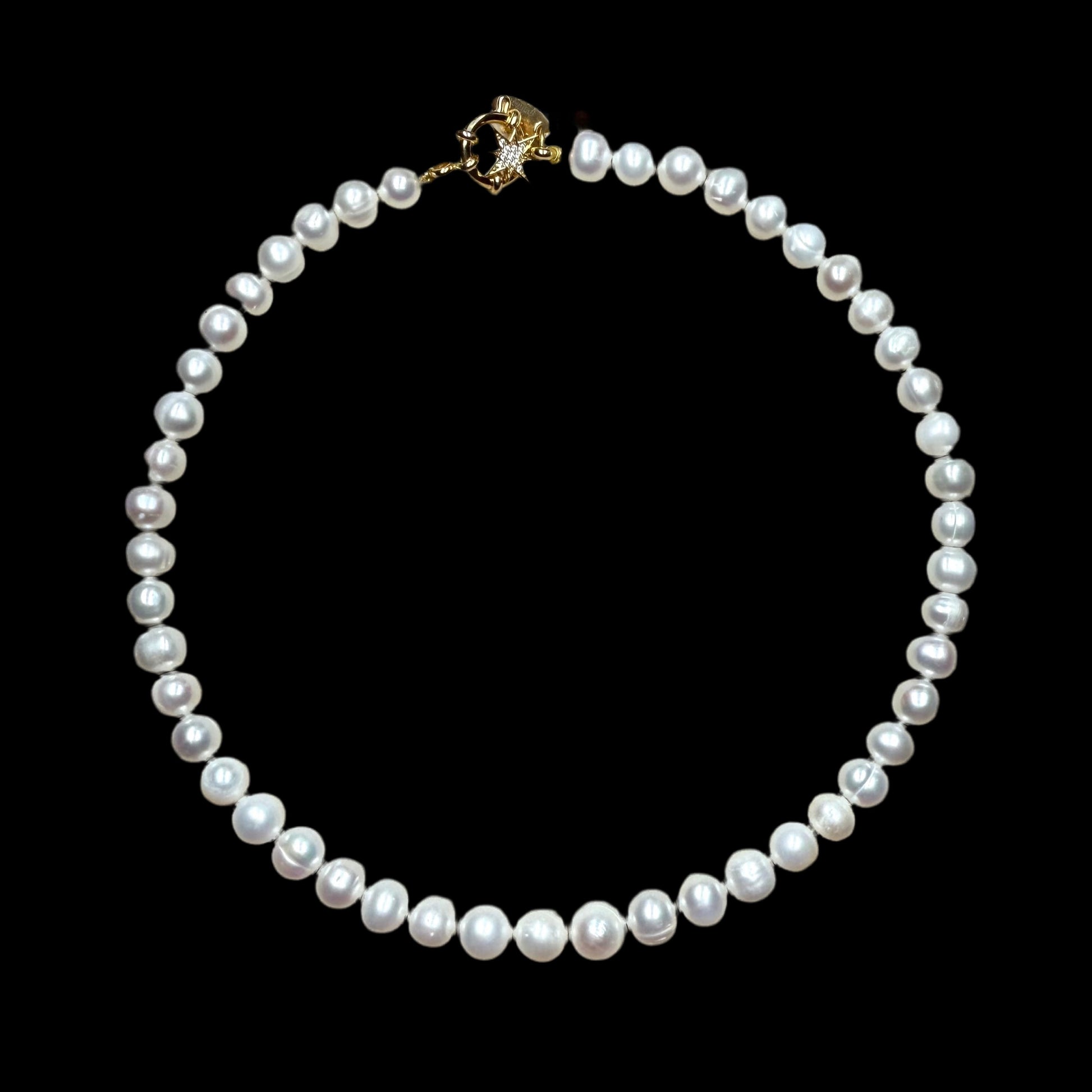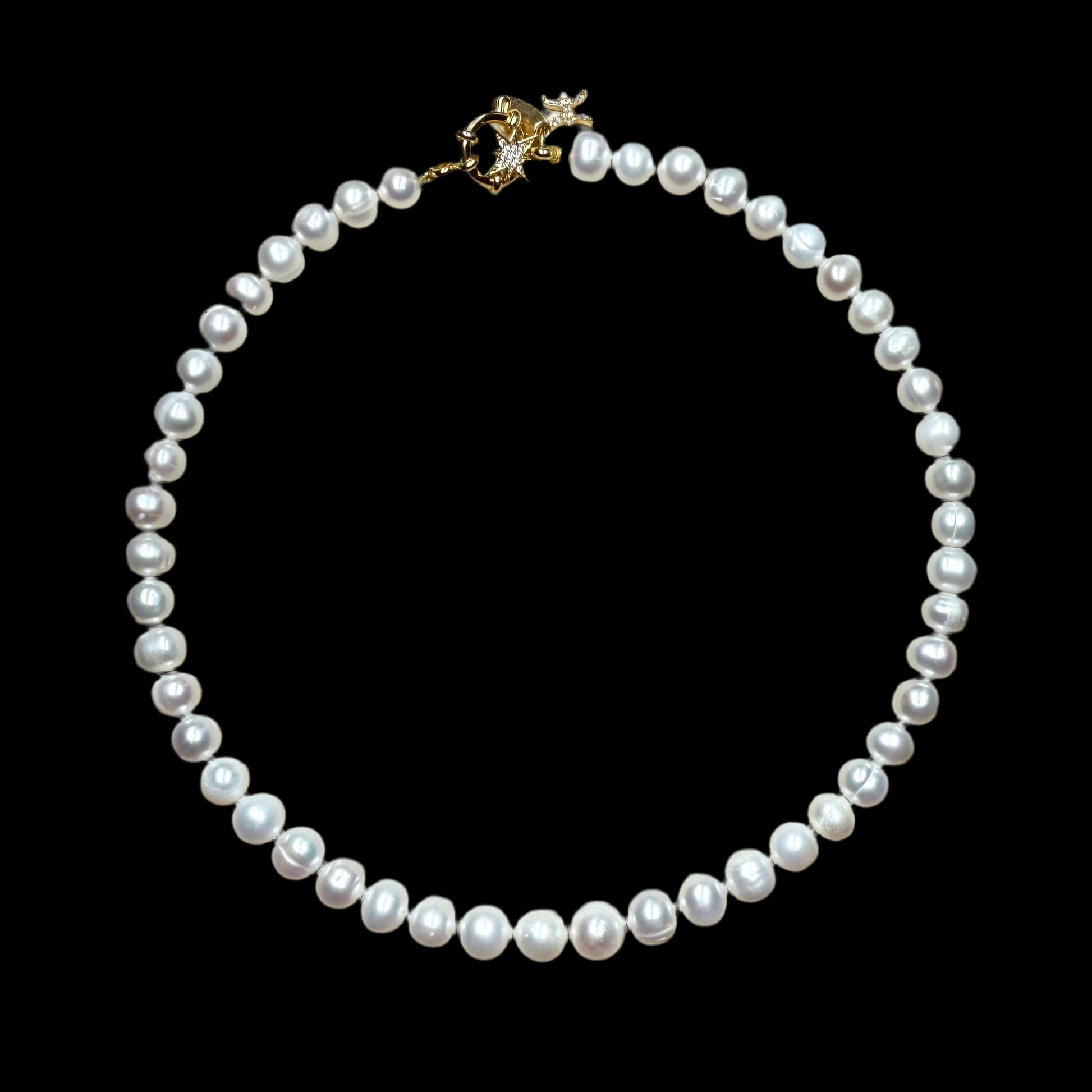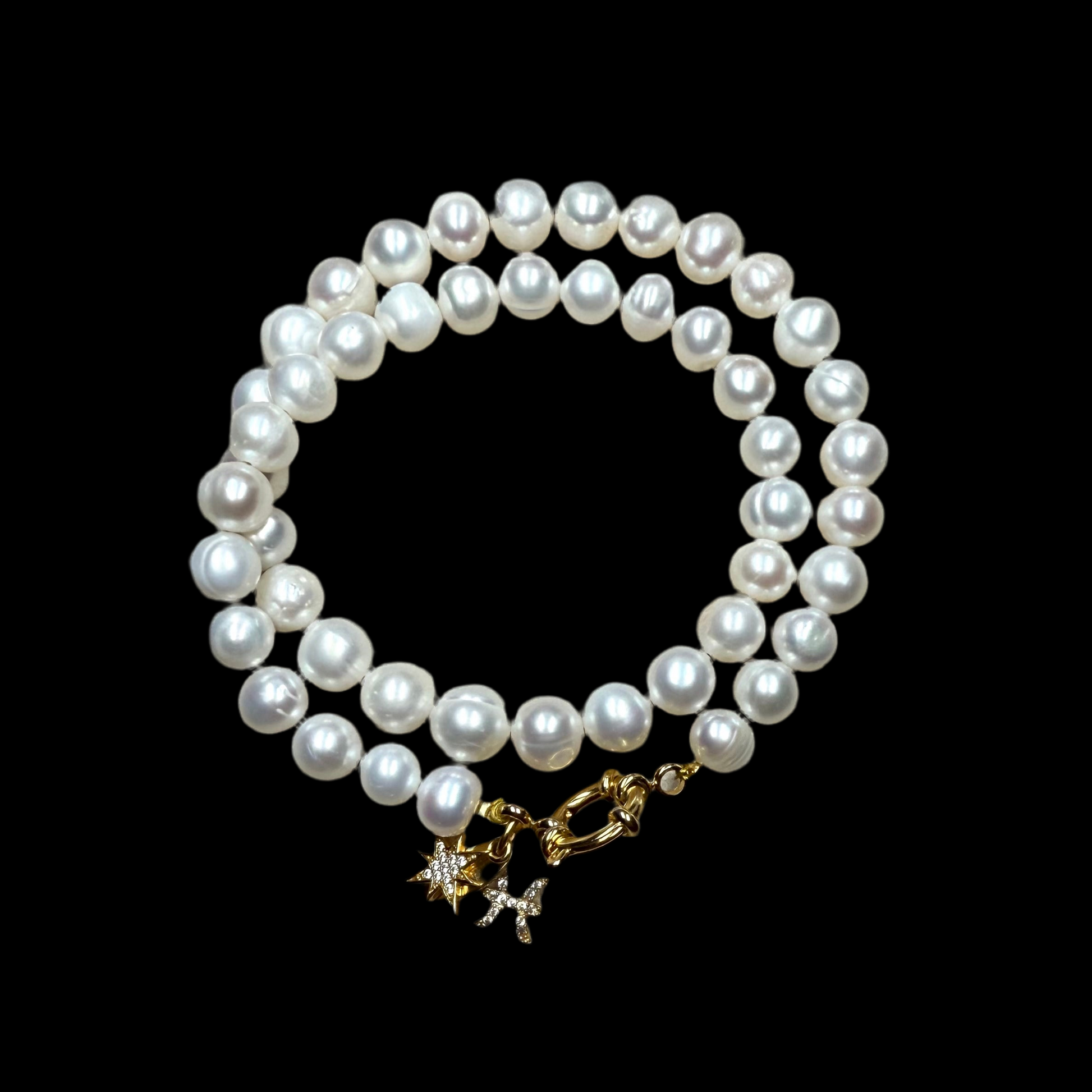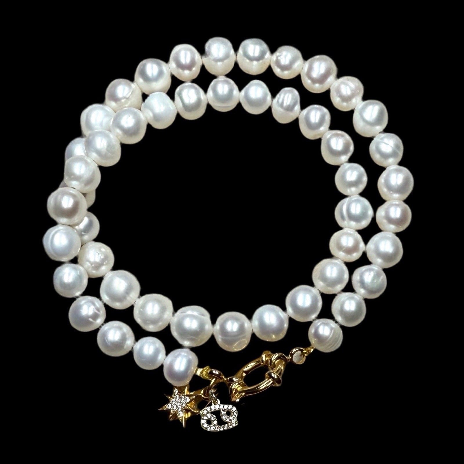 This is our classic pearl single strand necklace with your chosen 22kt gold vermeil CZ horoscope charm. The clasp is a 22kt gold vermeil sailor clasp.
