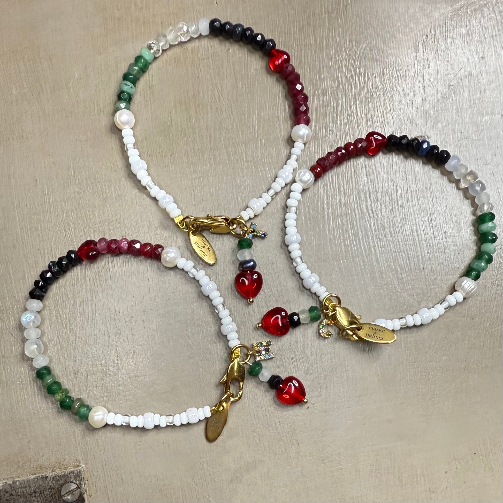 Praying for a positive peace process in Gaza. Including ruby, chalcedony, spinel, black pearls, quartz, moonstone, white pearls and emerald, these braceletsm celebrate the preciousness of Palestine and its people.