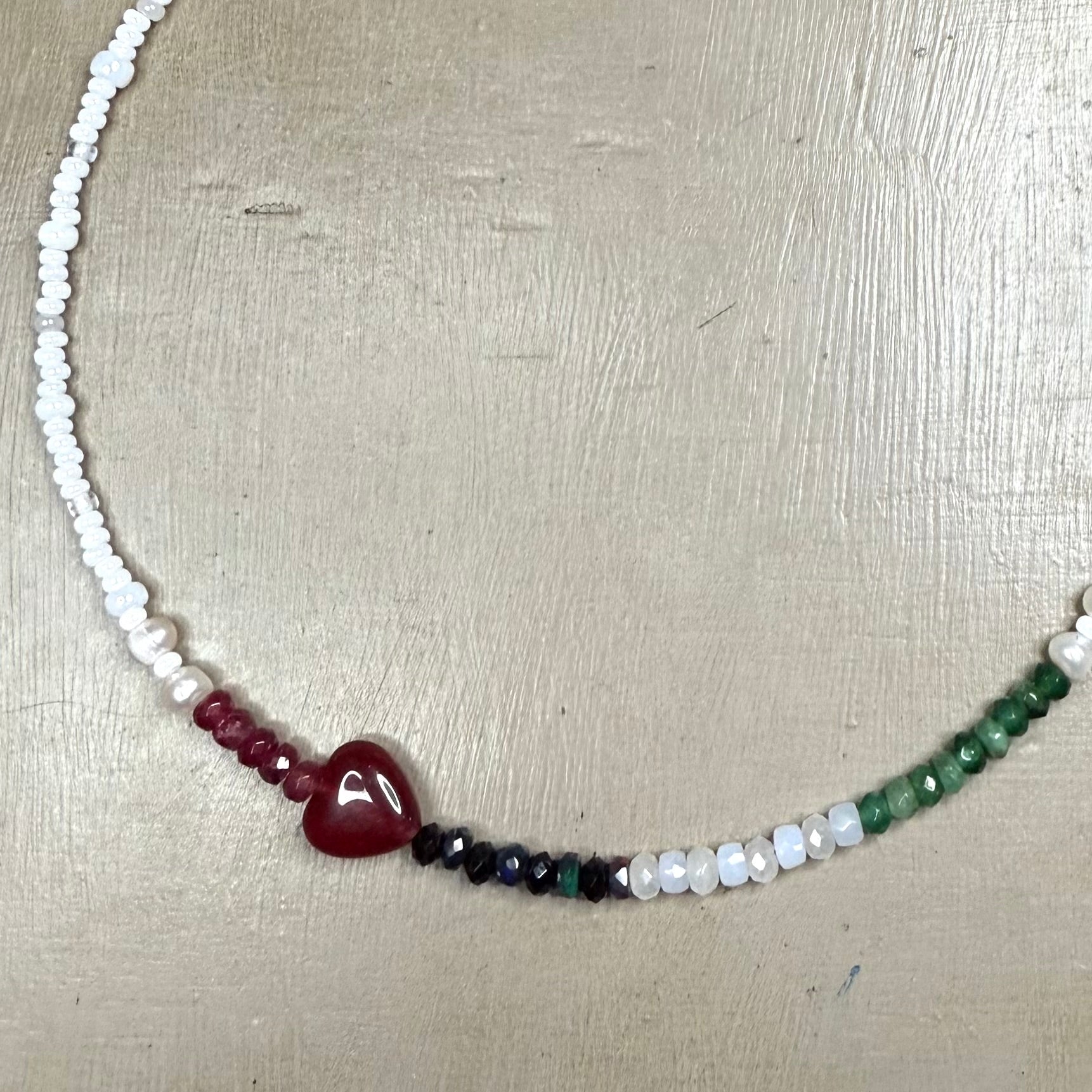 Praying for a positive peace process in Gaza. Including ruby, chalcedony, spinel, black pearls, quartz, moonstone, white pearls and emerald, this necklace celebrates the preciousness of Palestine and its people.