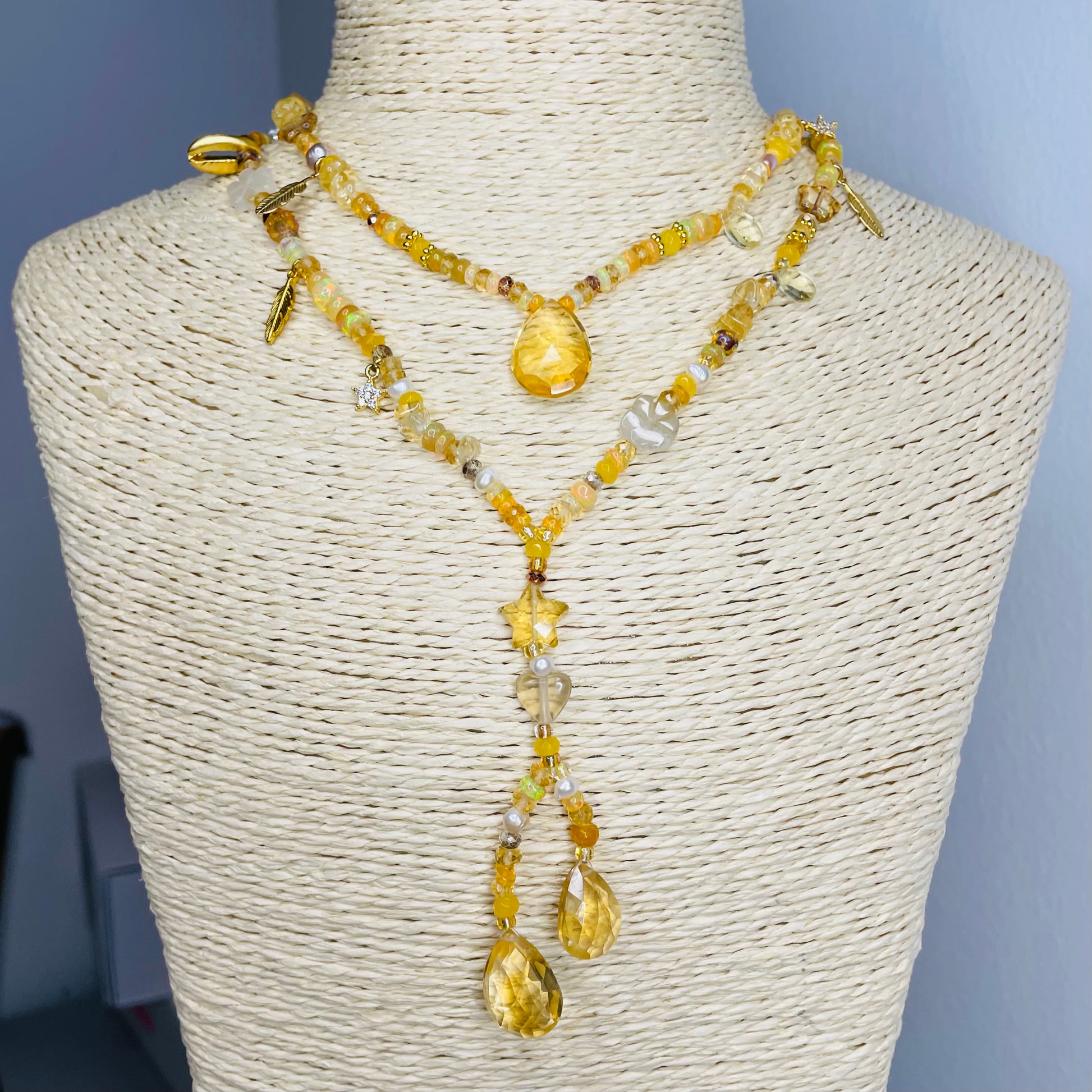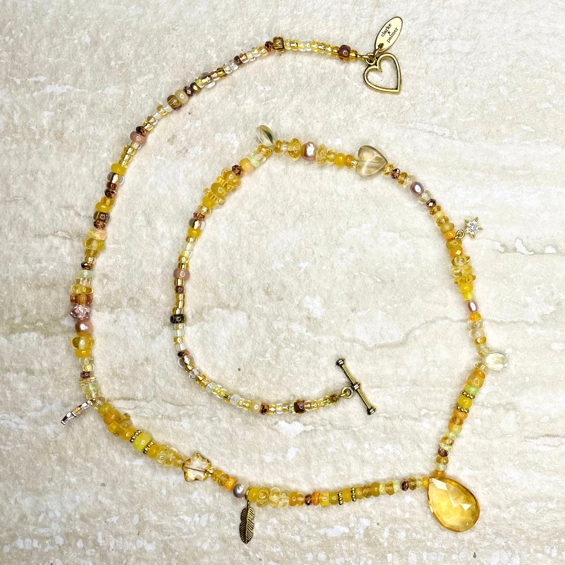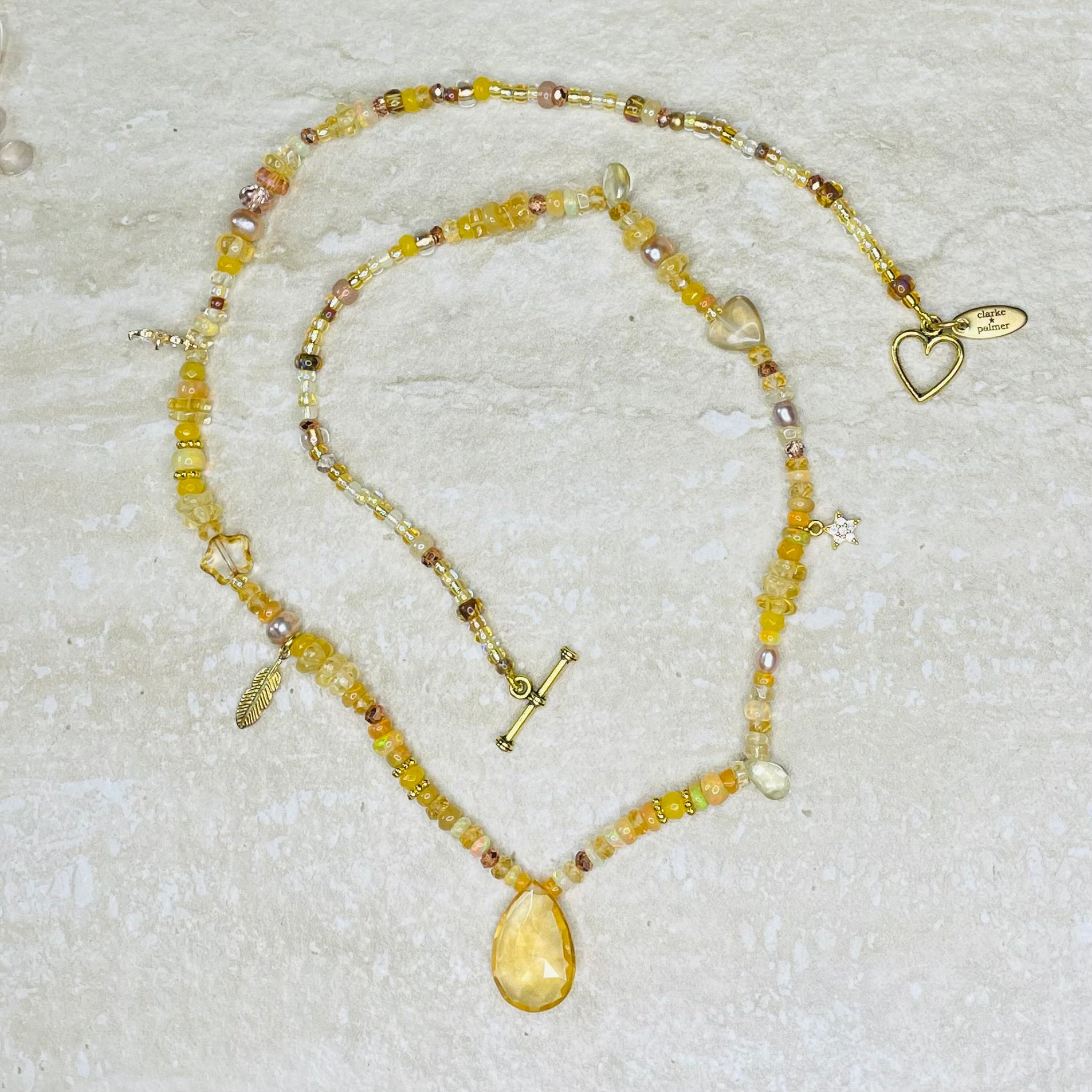 Part of our Golden Treasure Beach Collection, this beautiful pendant necklace is handmade from golden shades of Picasso glass Preciosa and Miyuki beads blended with semi precious stones including sustainably sourced citrine, Ethiopian opal, pearls, hand carved rutile citrine flowers, stars, and pearls. It is centred by a stunning hand cut faceted golden quartz briolette and has a 22kt gold vermeil lobster clasp.