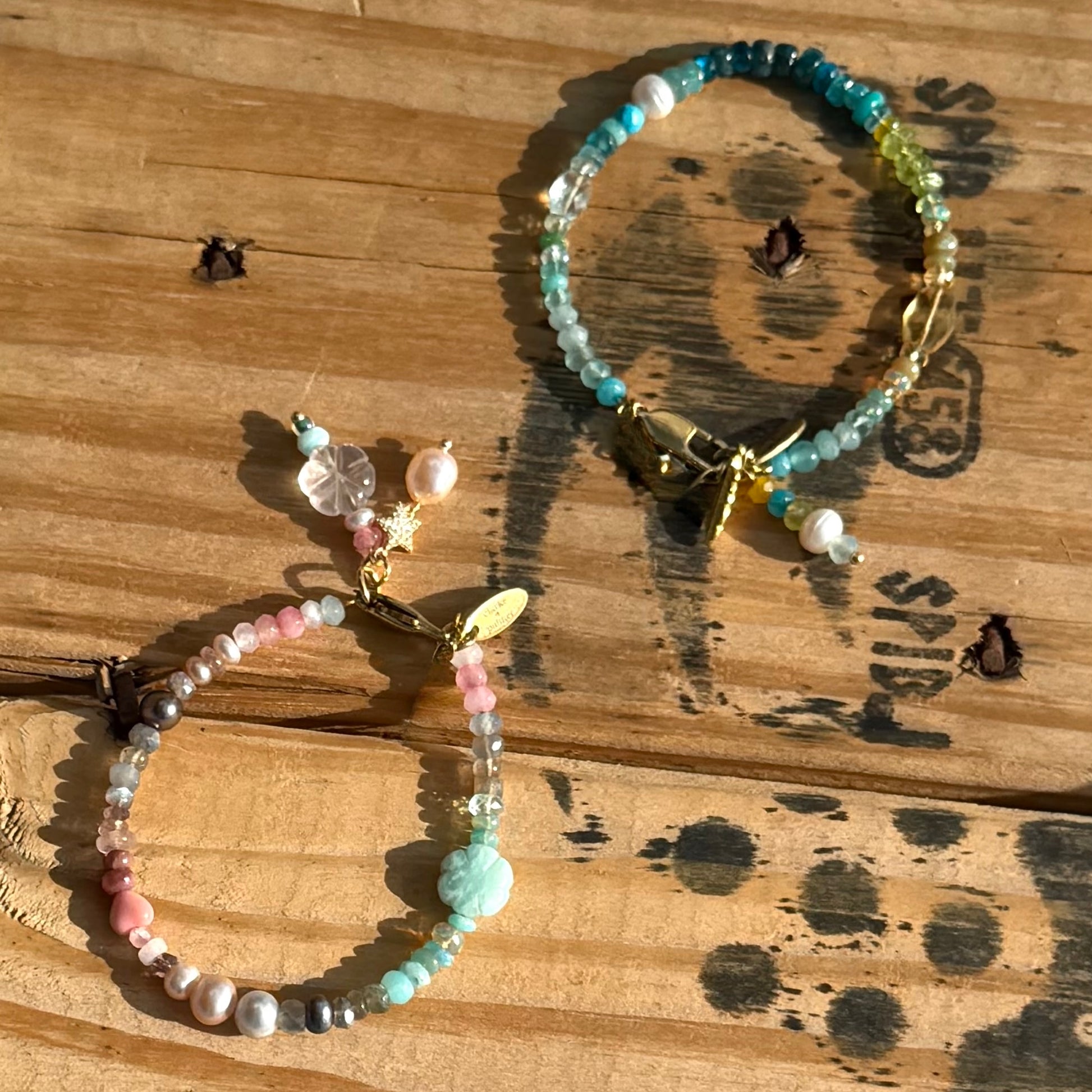 Our Heavenly Love bracelet blends ivory, blush, rose, duck egg, aqua, silver and grey shades of moonstone, rose Quartz, opal, aquamarine, labradorite and pearl. It also features a hand carved rose quartz flowers and a clasp in either silver or 24kt gold vermeil.