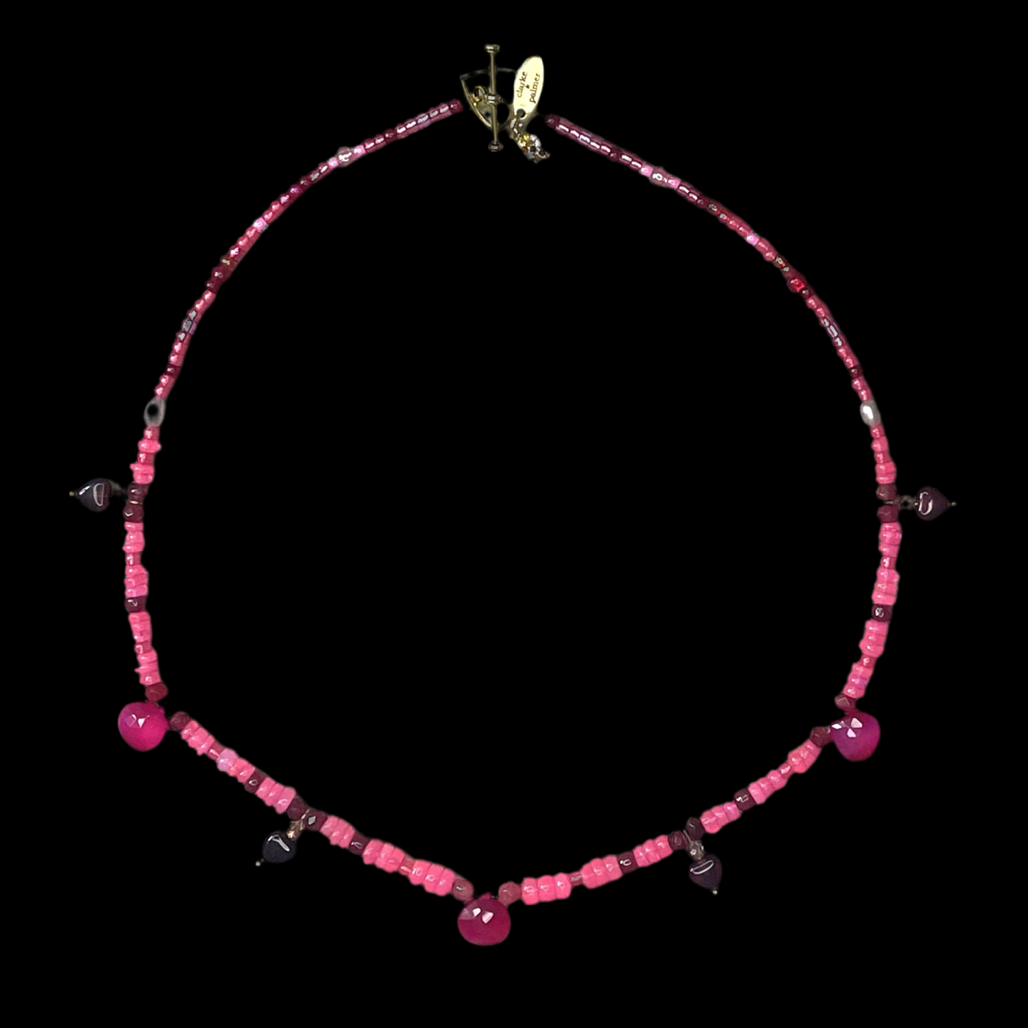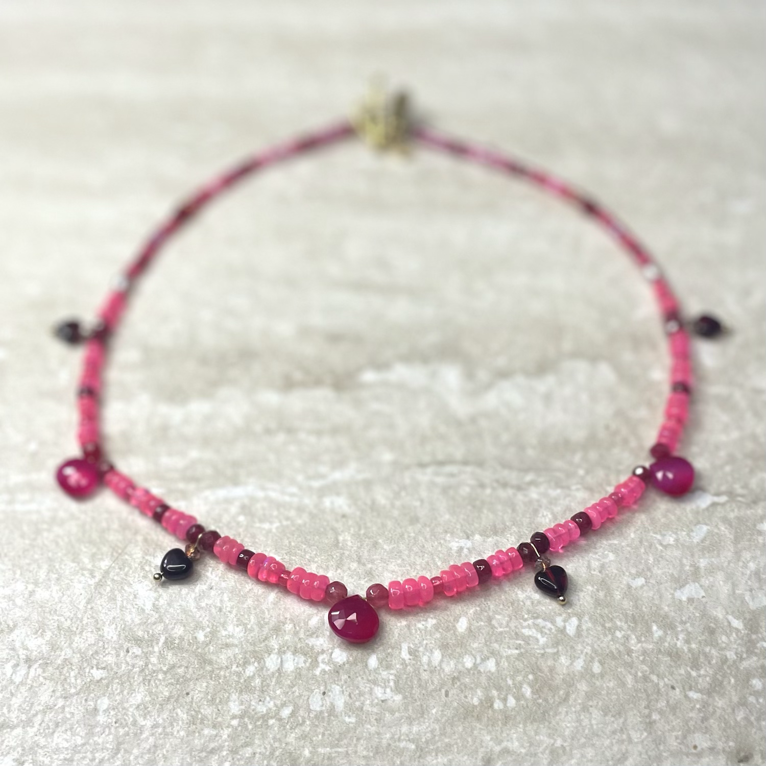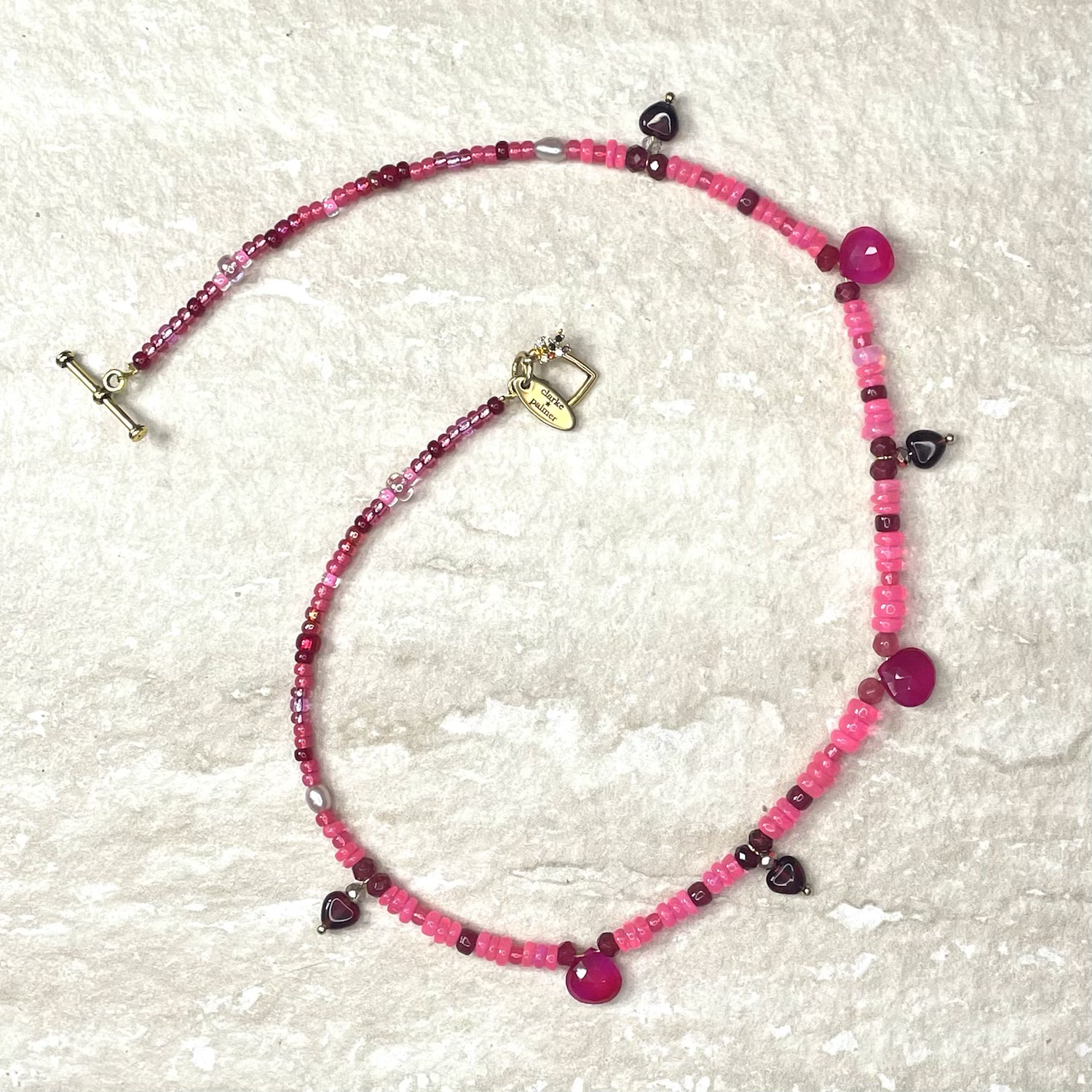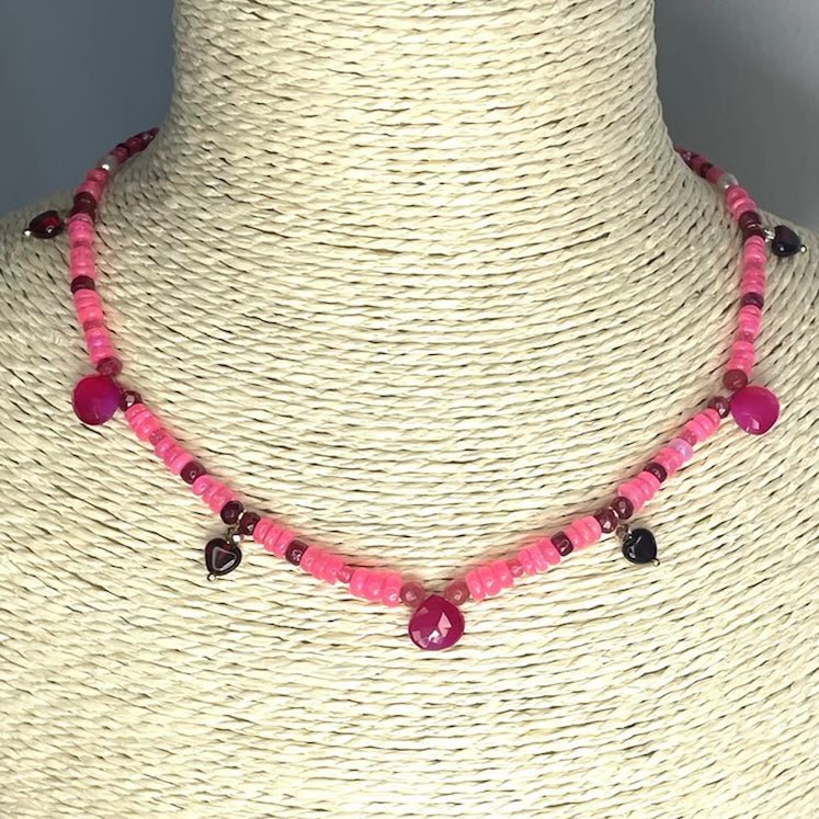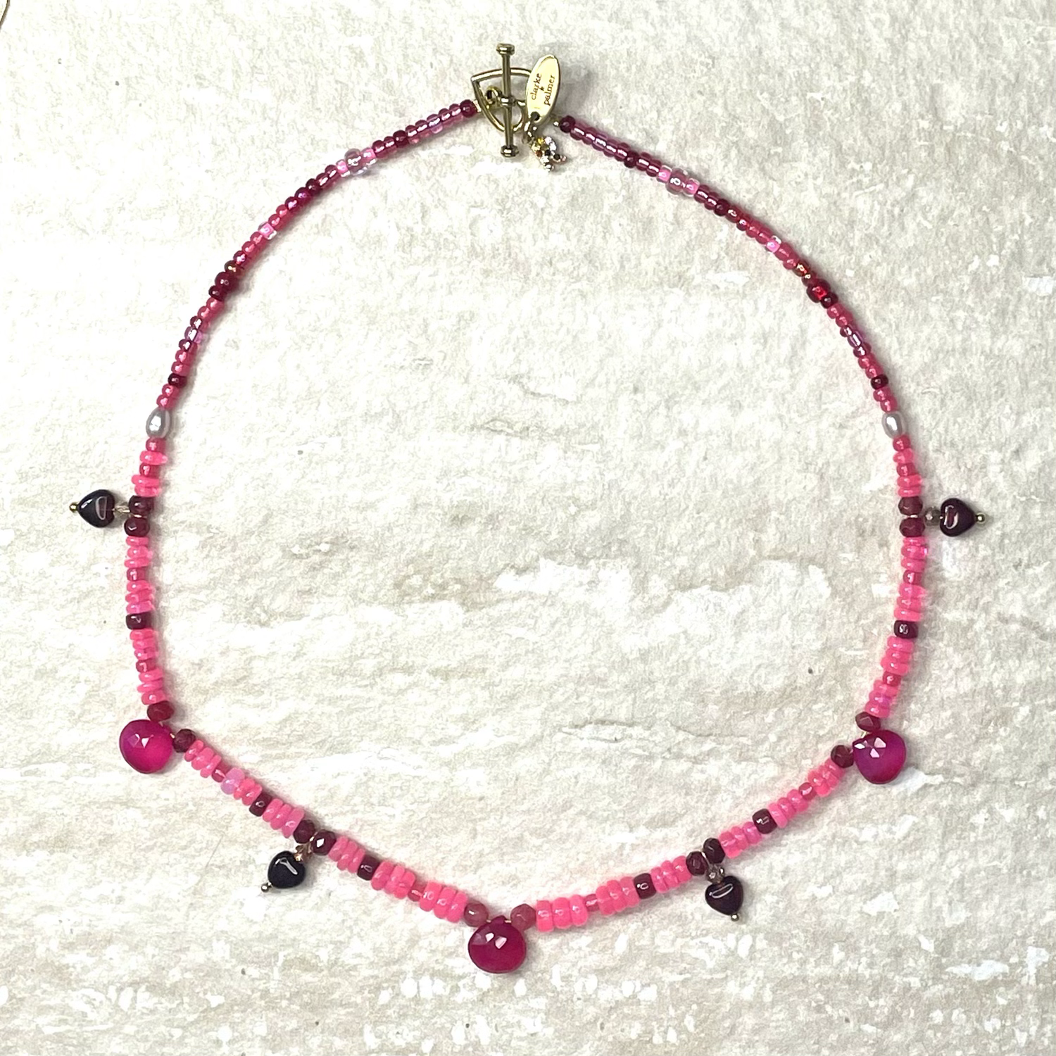Our 'La Vie en Rose' necklace includes glowing pink ethiopian opals, garnet and ruby rondelle beads, centred by chalcedony hand cut faceted drops and deep red Preciosa hearts.