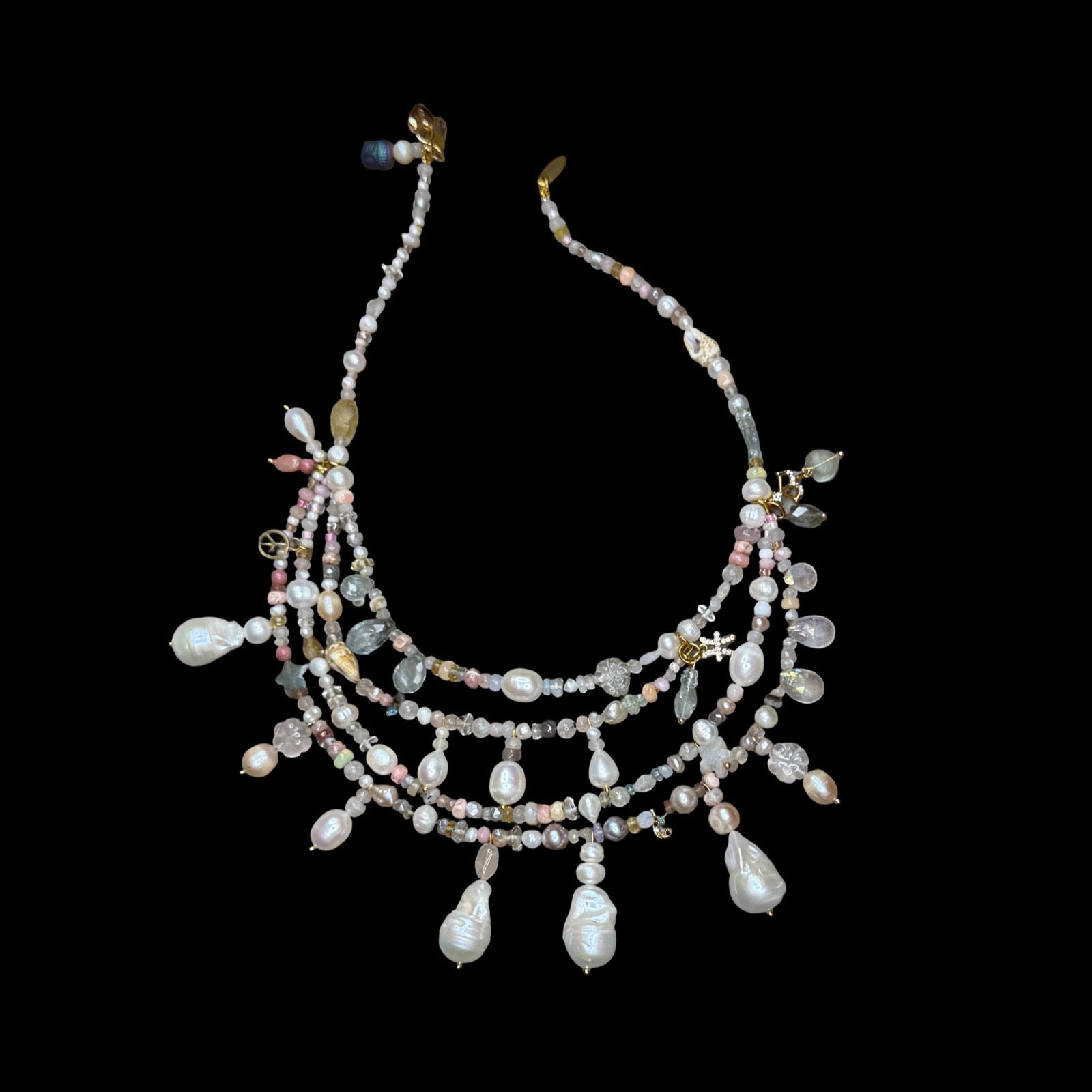 Pearls anchor this necklace in calm, wisdom and quiet strength, long associated with purity, protection and emotional balance. Baroque and freshwater pearls bring an organic softness, celebrating individuality and natural beauty rather than perfection.