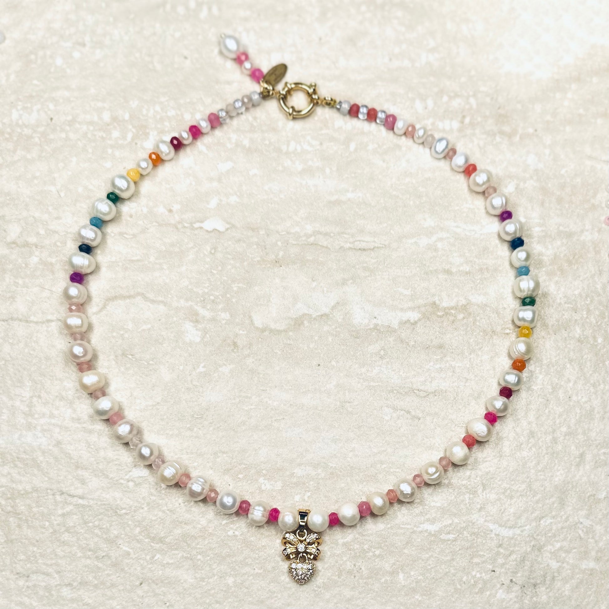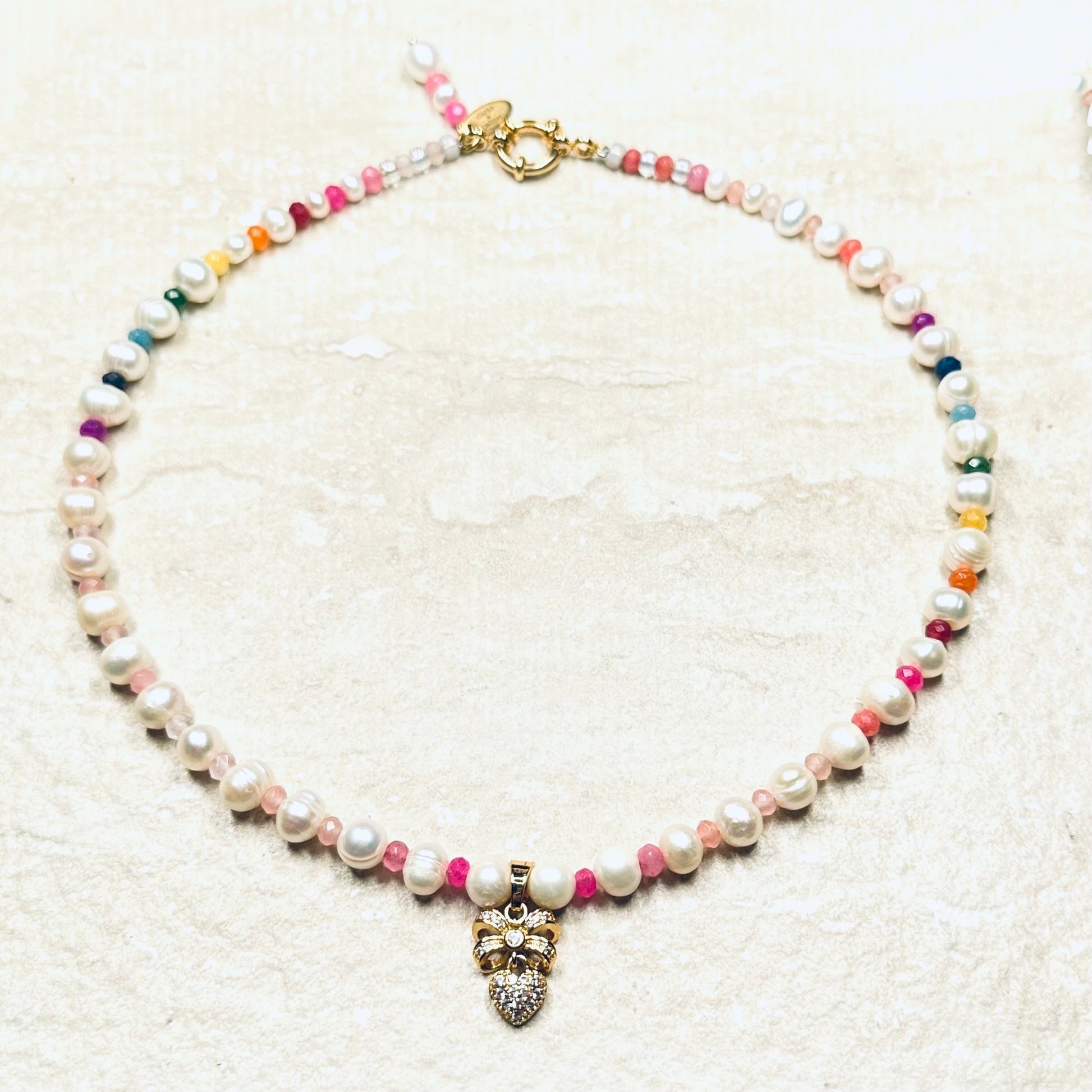 This Necklace is handmade in real ivory pearls interspersed with ombré pink and rainbow faceted agate rondelles and centred by a 24 kt gold vermeil cz heart and bow charm pendant. The colours of the agates remind us of the delightful colours of Parisian macarons and the pearls and heart charm the style of jewellery that Marie Antoinette favoured. Our pearls are sustainably sourced from Japan. It has a 24 kt gold vermeil lobster clasp and is adjustable from 40 cm to 45 cm.