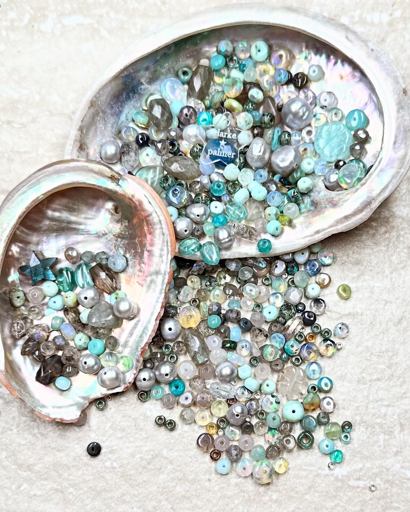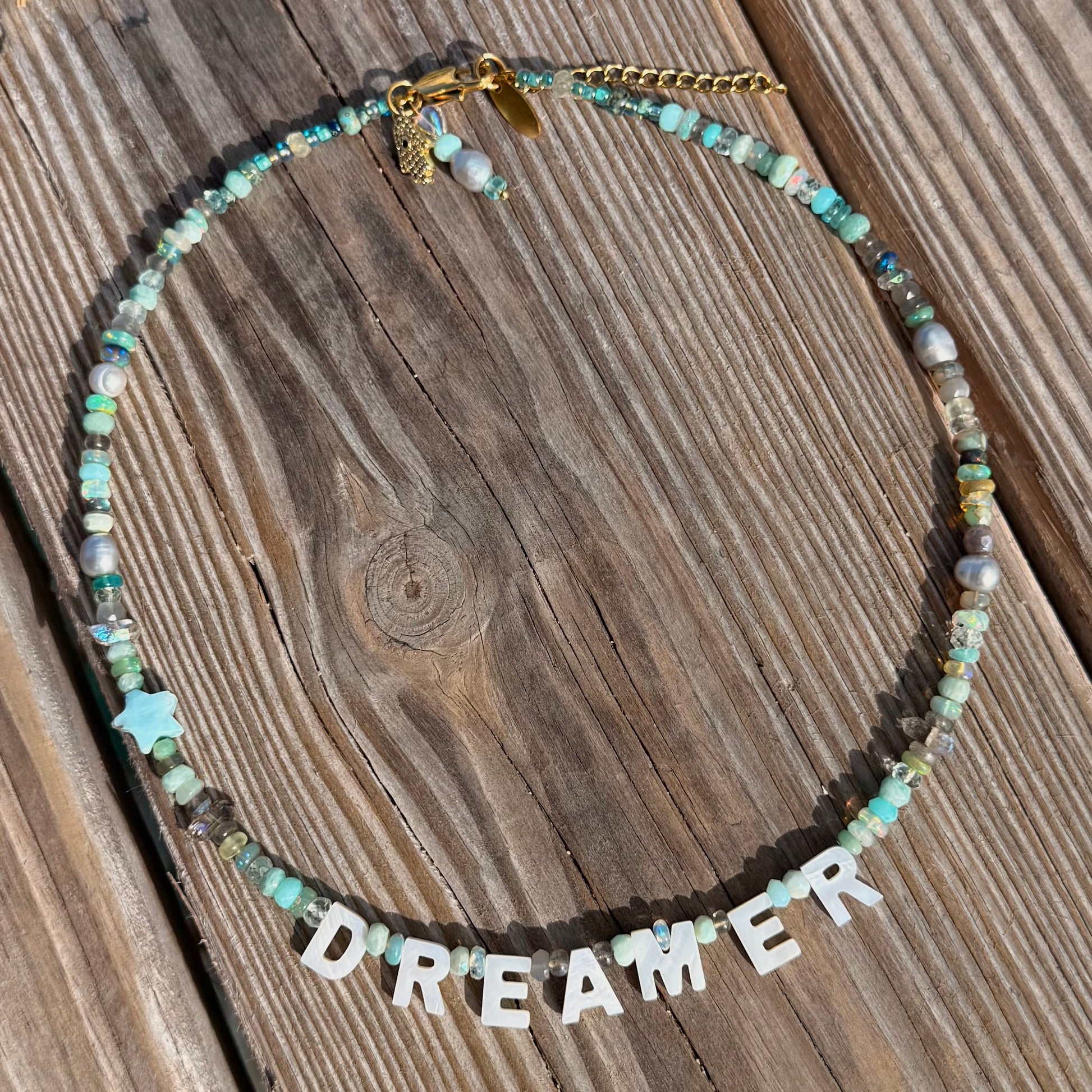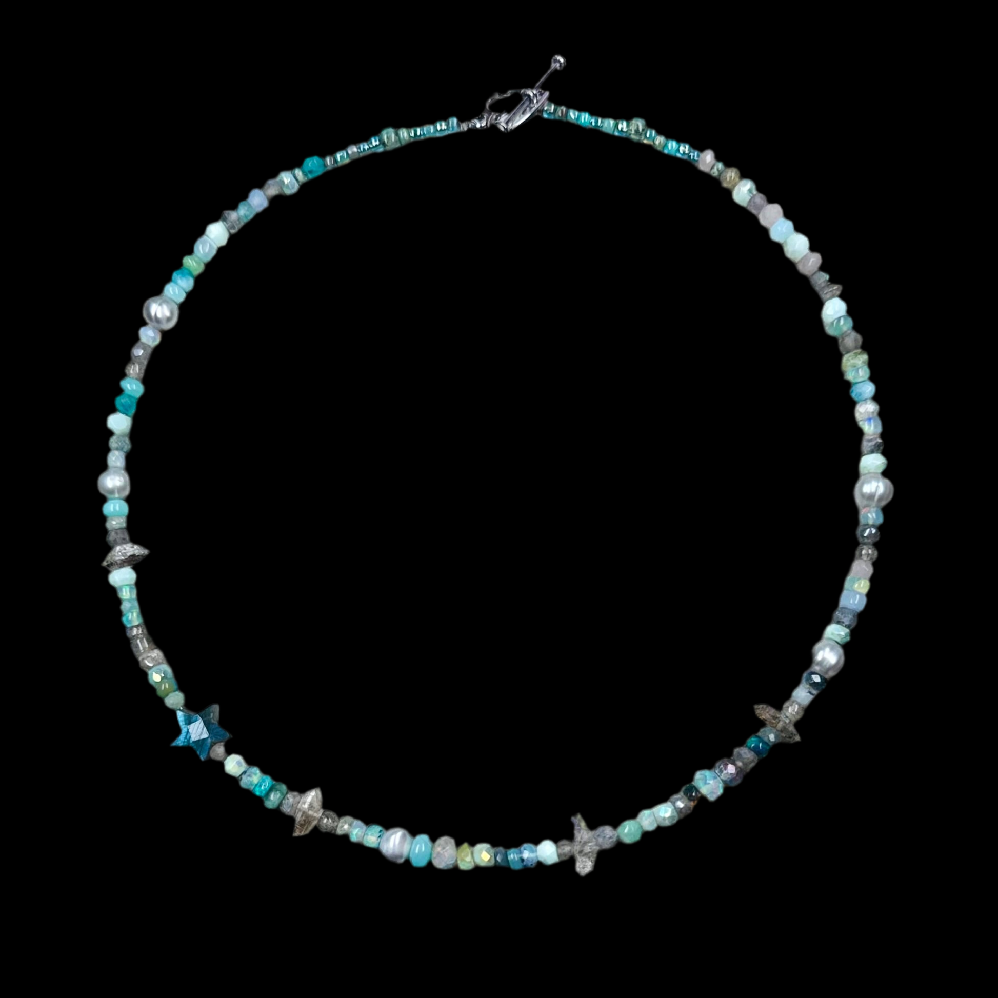 This beautiful necklace is inspired by the iridescent beauty of mythical mermaids and their ocean environment. Featuring a shimmering labradorite hand cut star, it blends shimmering precious metal coated Herkimer diamonds, pale grey pearis, smooth and faceted rondelles in pale turquoise and azure amazonite, opals, labradorite.