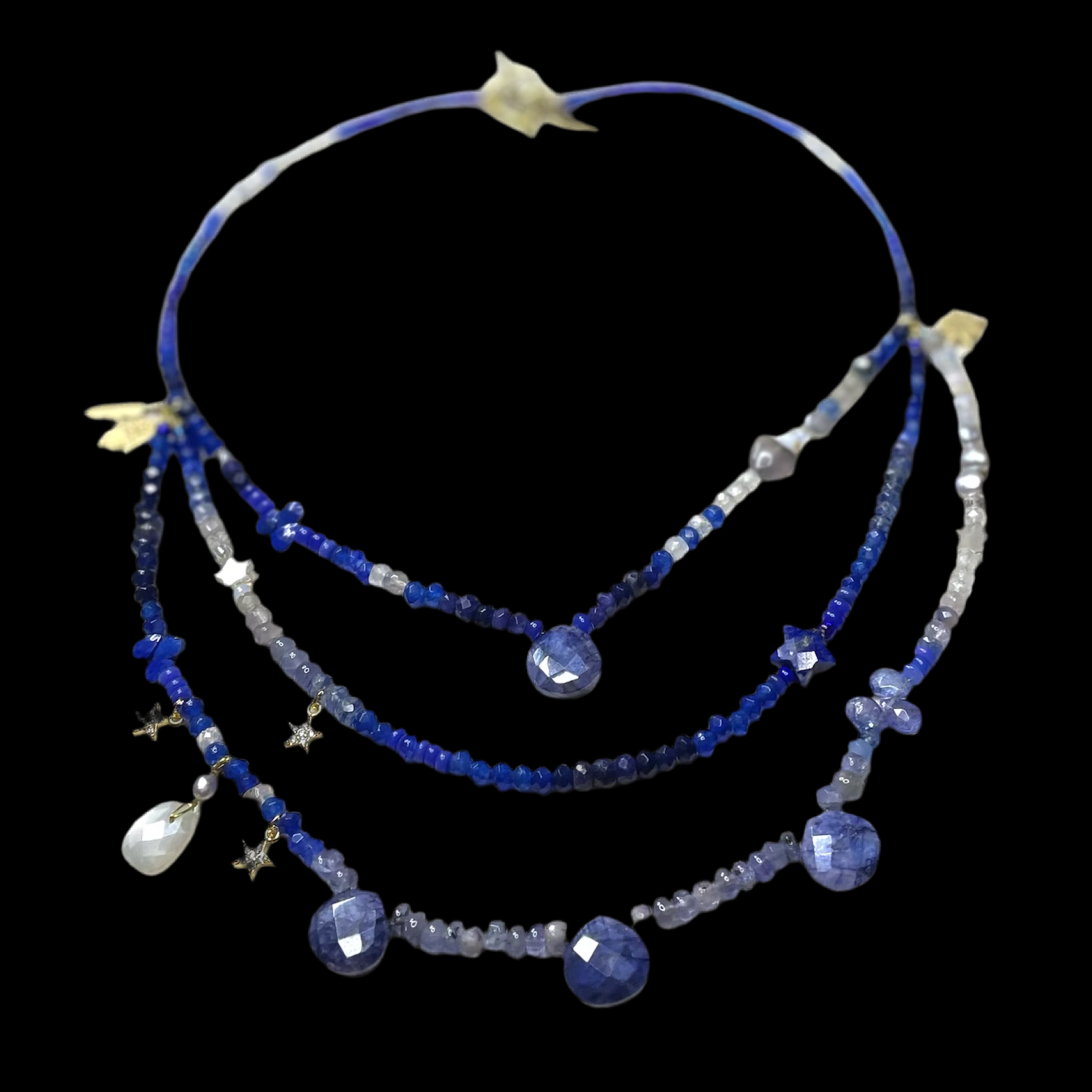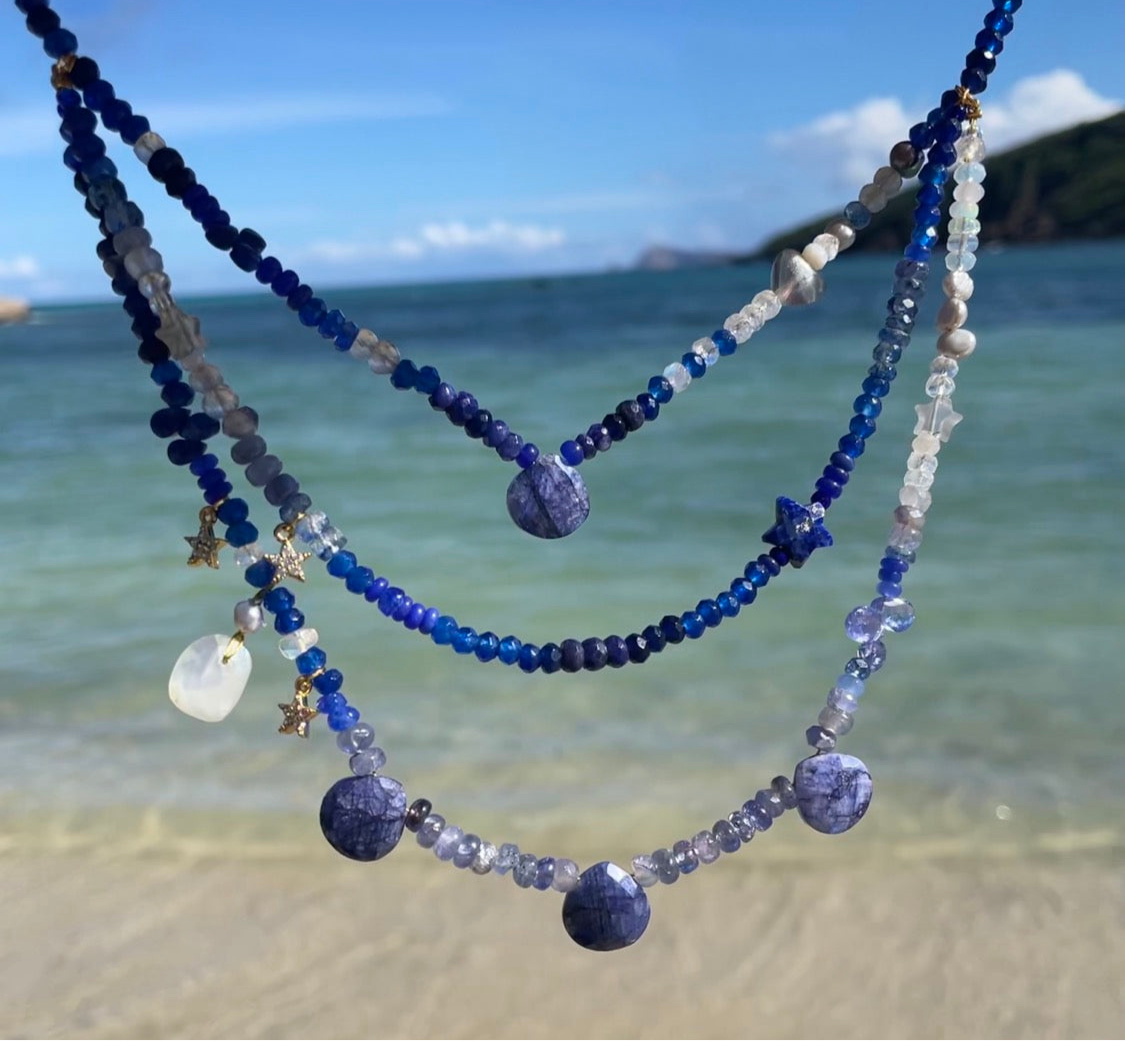 Designed especially for the holiday season, our Moonlit Midnight necklace blends ombré shades of deep inky blue, indigo, ultramarine, wisteria violet-blue and bright clear iridescent white precious and semi-precious stones. Including sustainably sourced sapphire, Ethiopian opal, lapis lazuli, pearl, tanzanite, rainbow moonstone and rutile quartz, it is centred by a beautiful hand cut rainbow moonstone heart and blue moonstone briolettes. This magical necklace has a 22kt gold vermeil lobster clasp, is andjustable from 40 cm to 45 cm and makes a perfect gift for someone special in your life or as a well deserved treat for yourself.