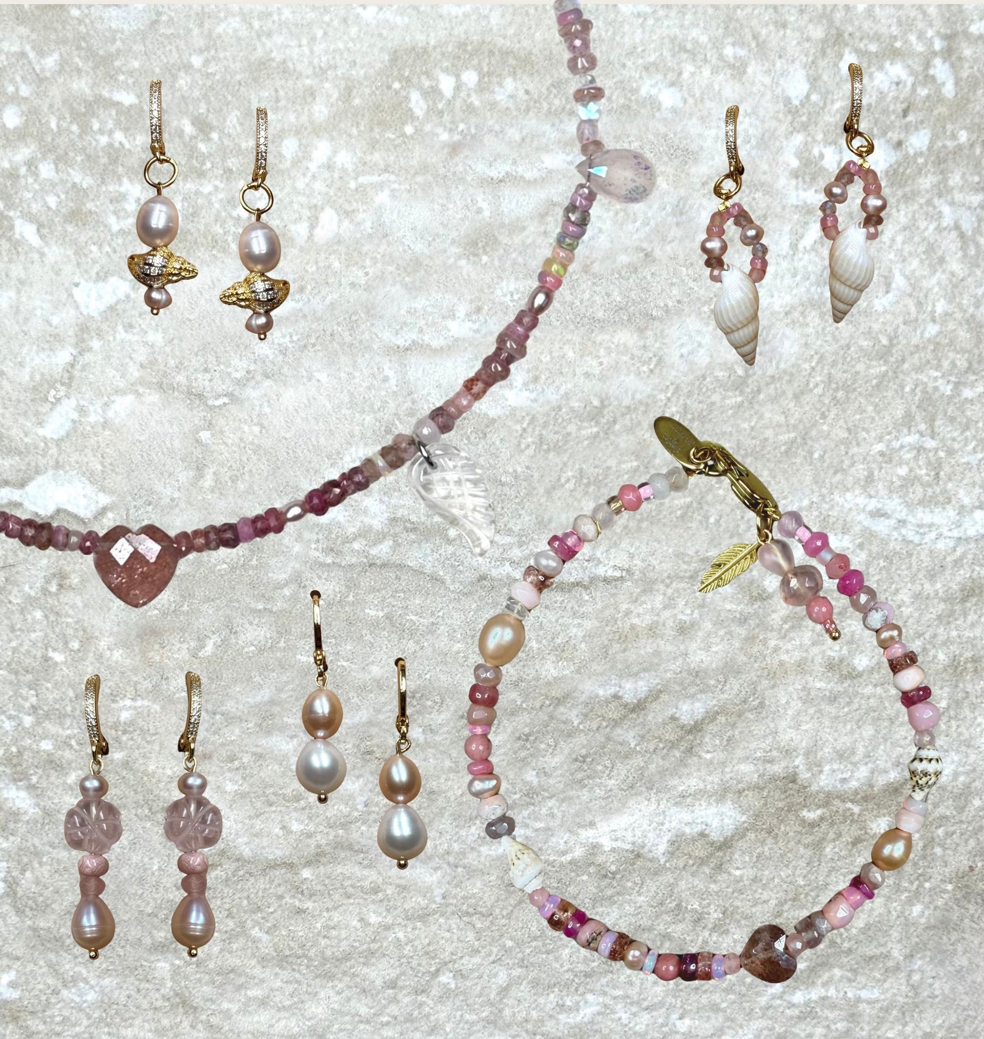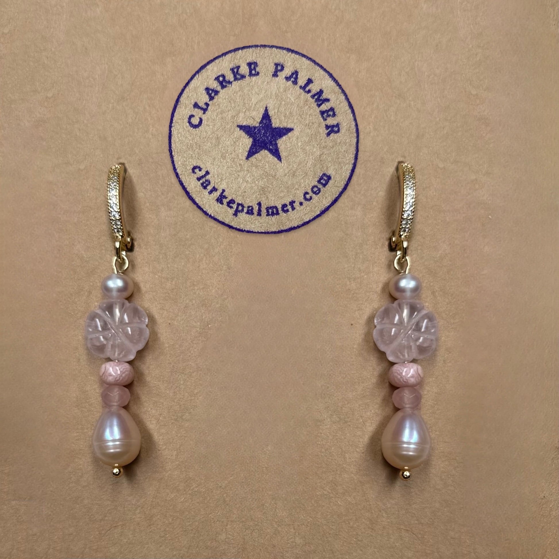 Part of our Naked Beach Collection, these beautiful drop earrings are handmade from rose Quartz hand cut flowers, rhodendrite rondelles and Pearls.