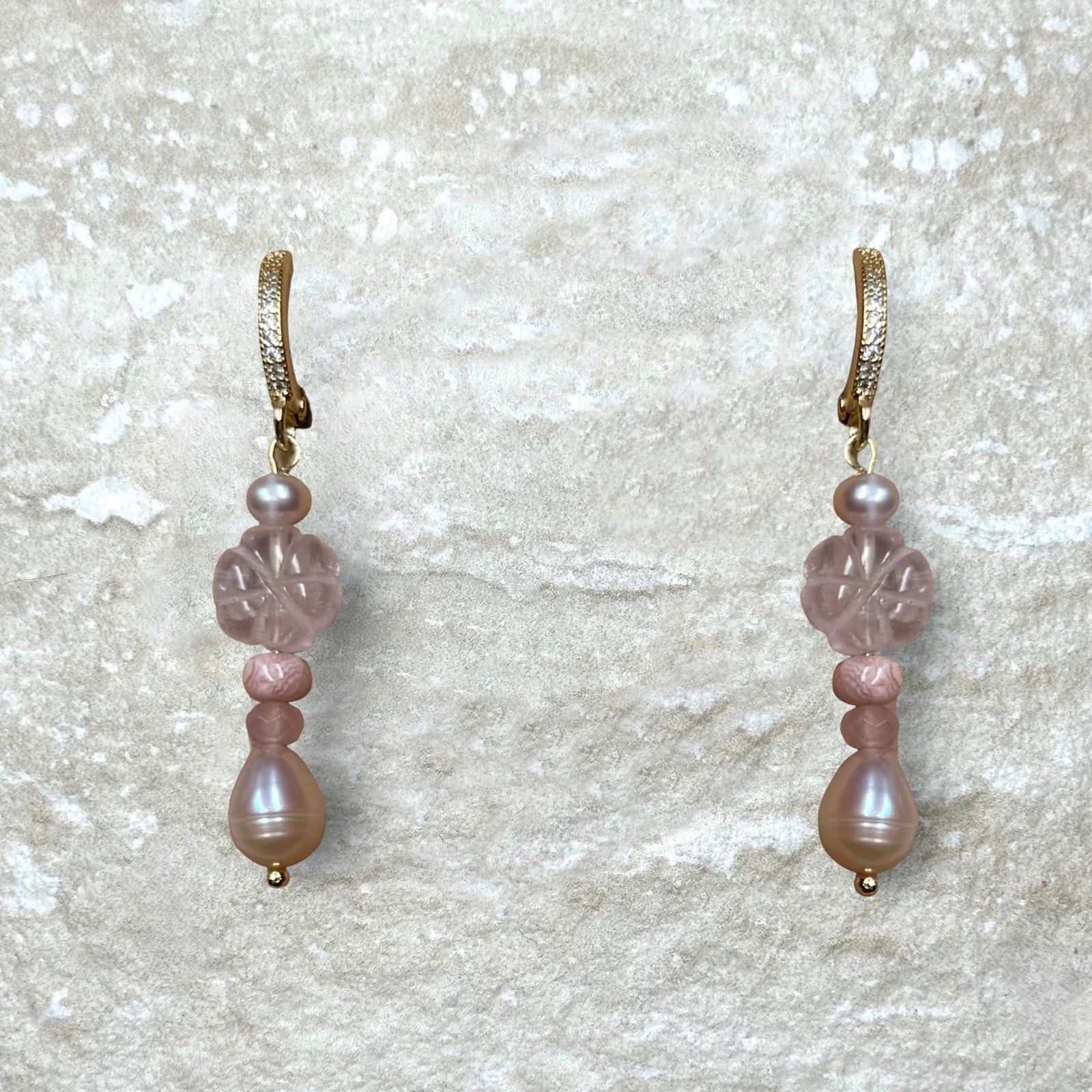 Naked Beach Rose Quartz Flower and Pearl Earrings