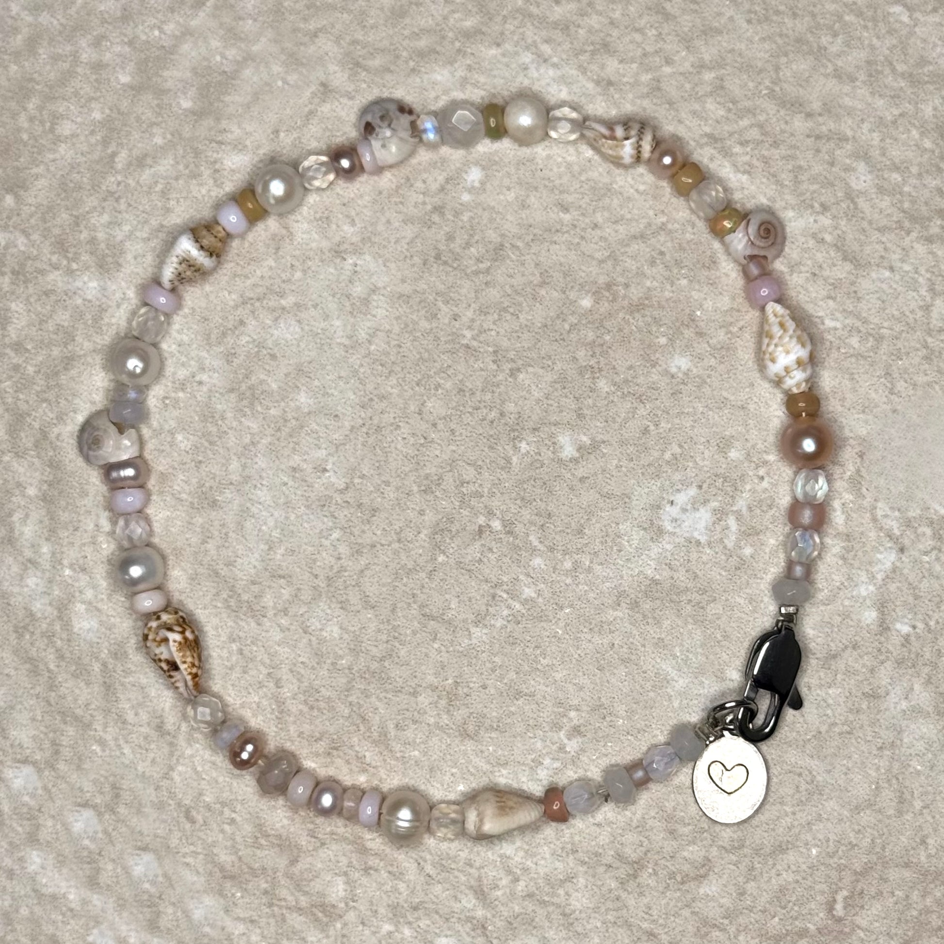 Our Naked Beach Anklet is handmade and blends ivory, blush, natural, iridescent shades of Miyuki glass beads pearls, opals and shells.