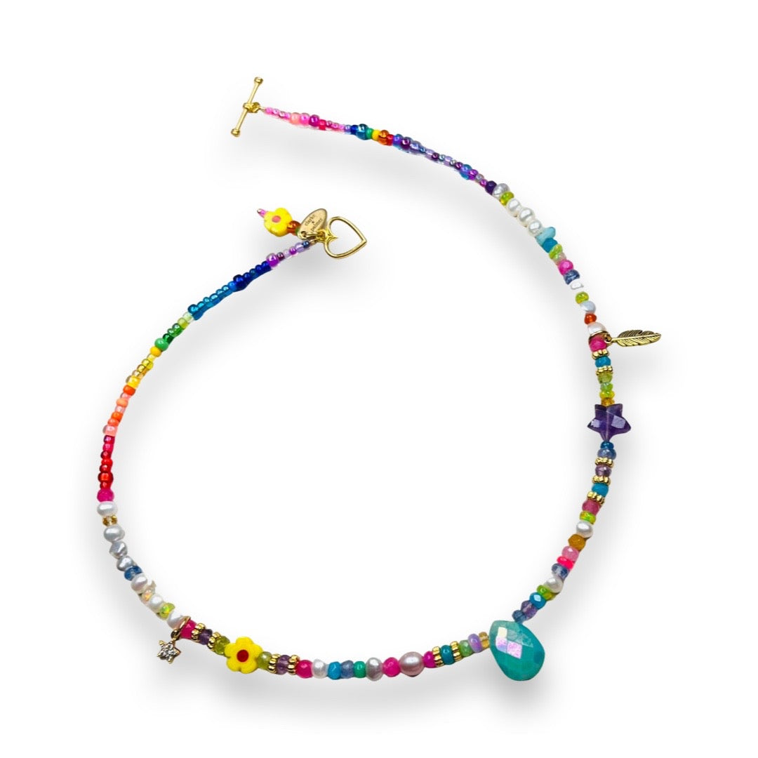 This beautiful necklace is handmade from a rich mix of rainbow shades of semi precious sustainably sourced rondelles, including Ethiopian opals, freshwater pearls, peridot, sapphire, ruby, emerald, moonstone, amethyst, garnet, citrine and tanzanite. It features a hand cut faceted amethyst star and is centred by a large faceted chrysoprase Briolette .