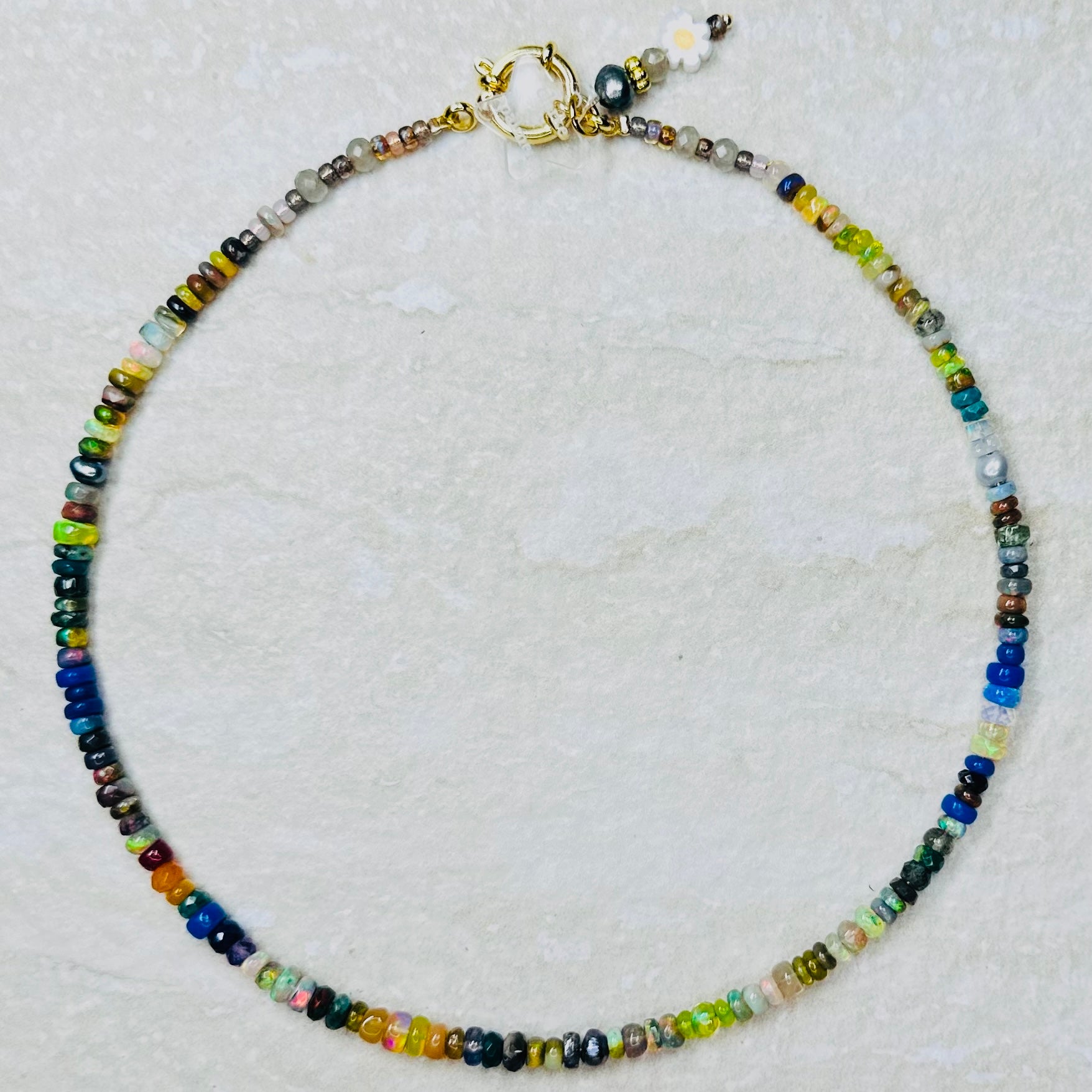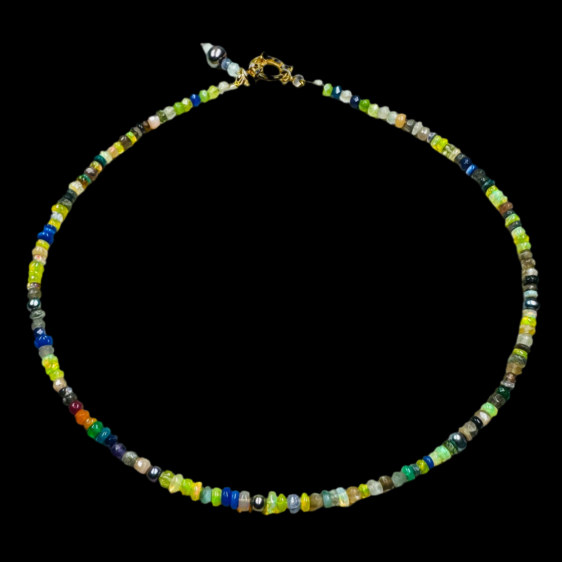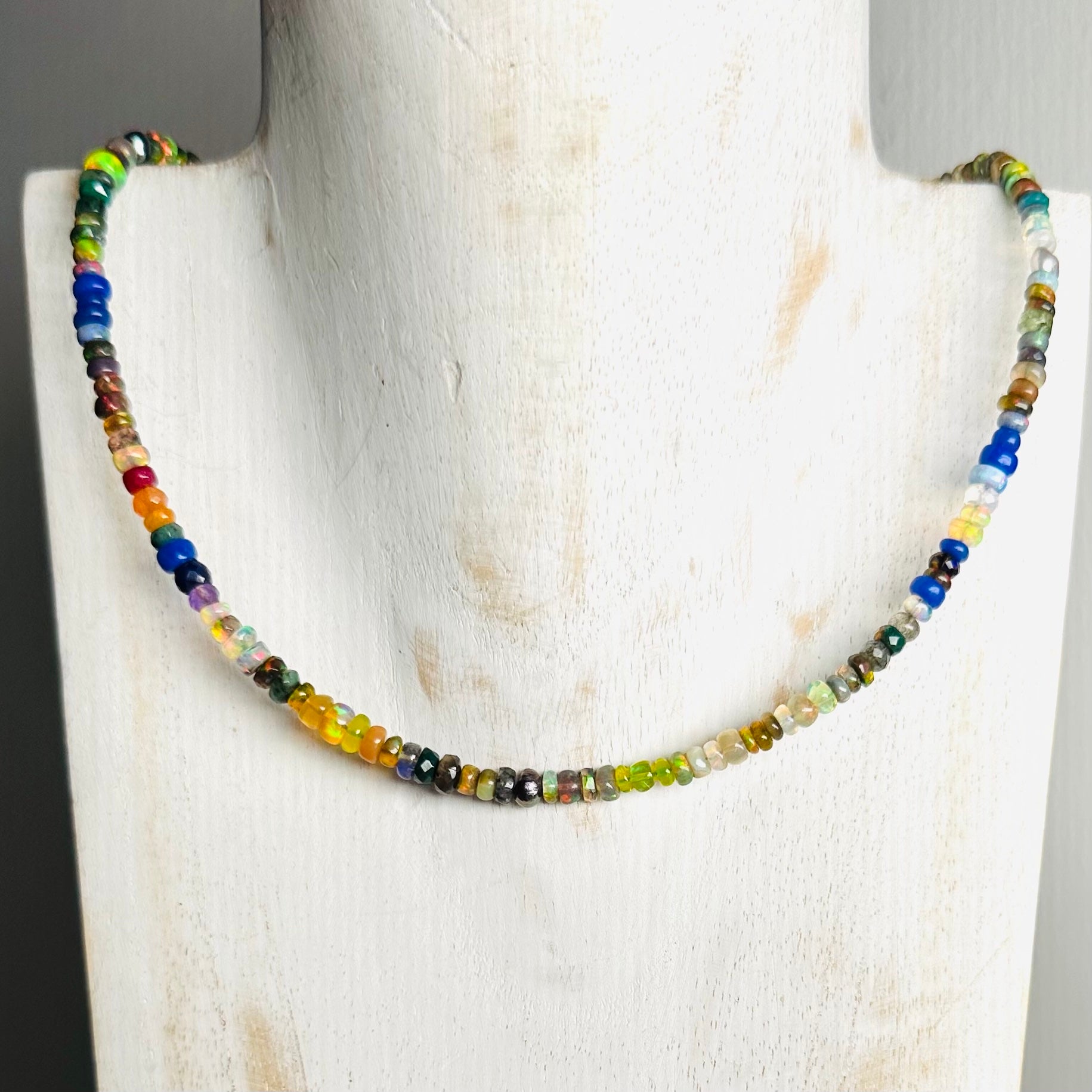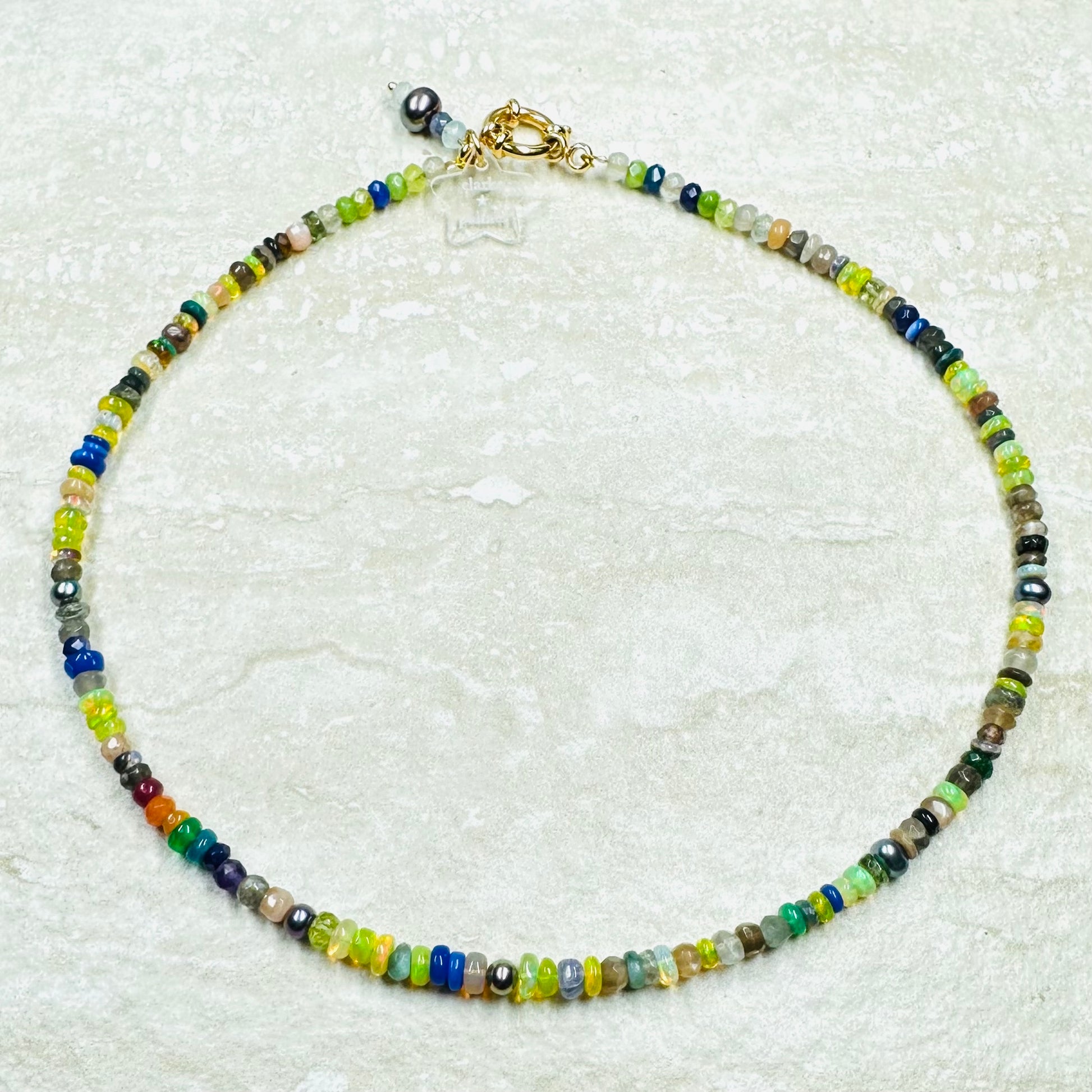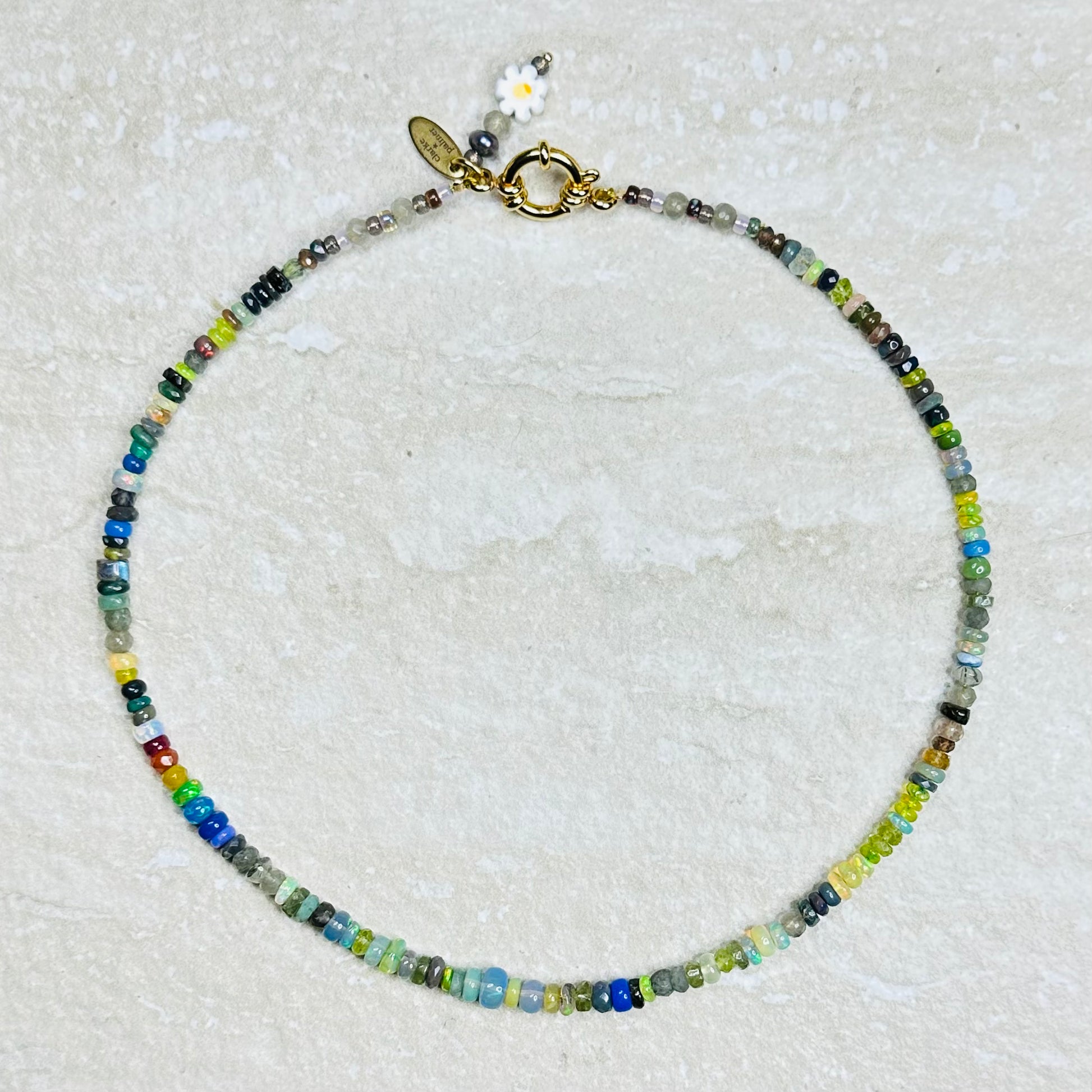 This necklace is the Neon Fantasy version of our Earth opal necklace using bigger graduated opals. As featured in Vogue and worn by Anna Murphy - Fashion Director at the Times, Susan Bender-Whitfield of British Vogue and photographer Joel Palmer, it is handmade to order from sustainably sourced beautiful flashy opals, and accented with bright royal ultramarine and juicy citrus lime, with a rainbow feature. Pictured with a 24 kt gold vermeil sailor clasp you can choose a heart toggle clasp if you wish. Choose your size in the options.