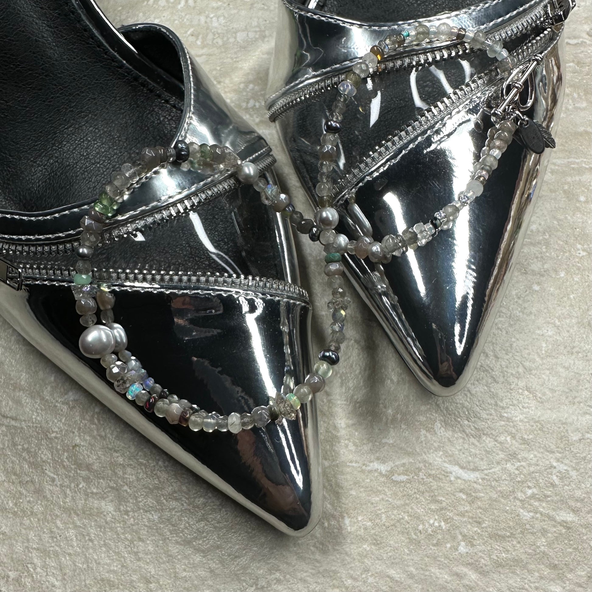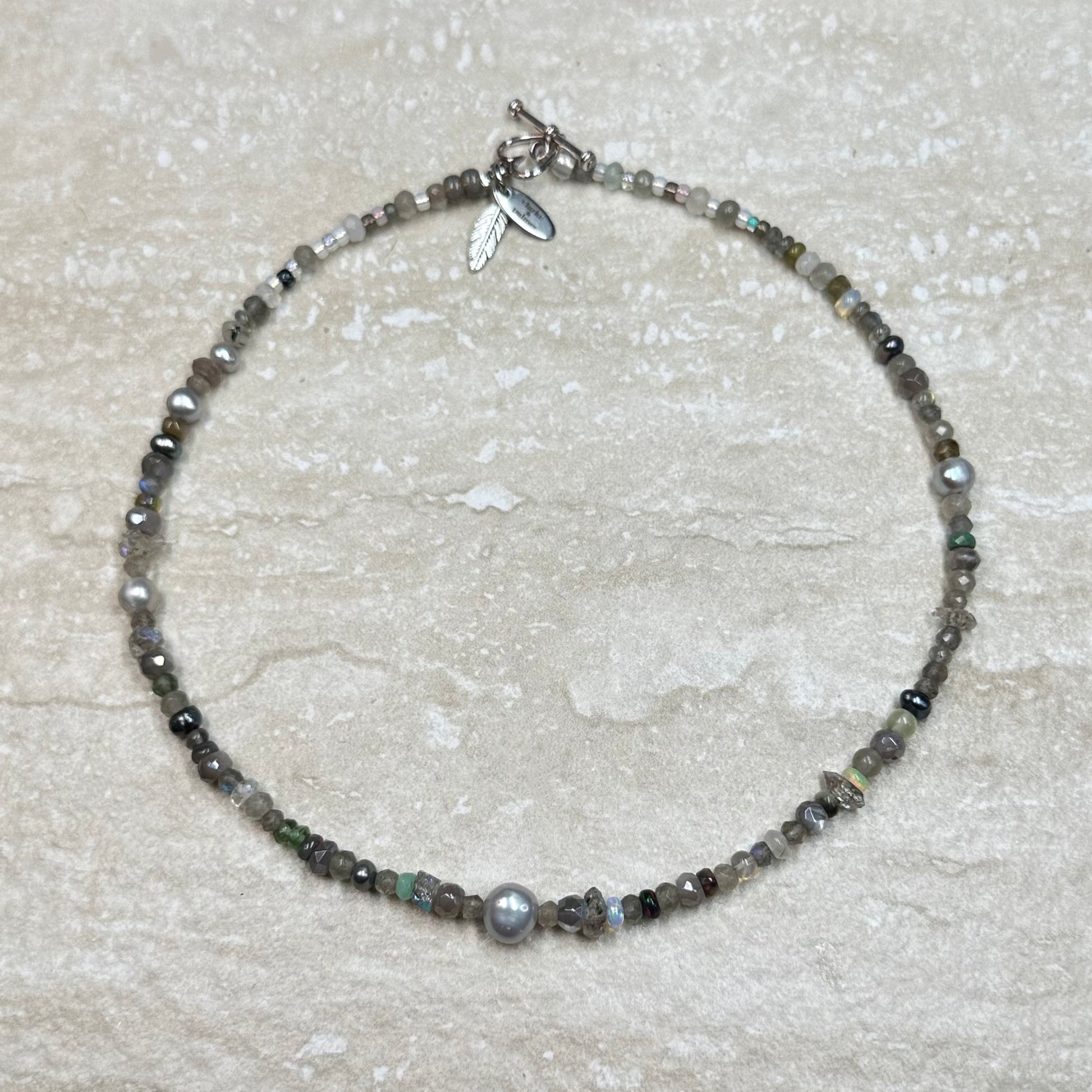 This stunning necklace is handmade from sustainably sourced hand cut gemstones in smoky grey-green ombré shades of opal, smoky Quartz, earth opal, precious metal coated Herkimer diamonds, emerald, green apatite and three central large real freshwater pearls.
