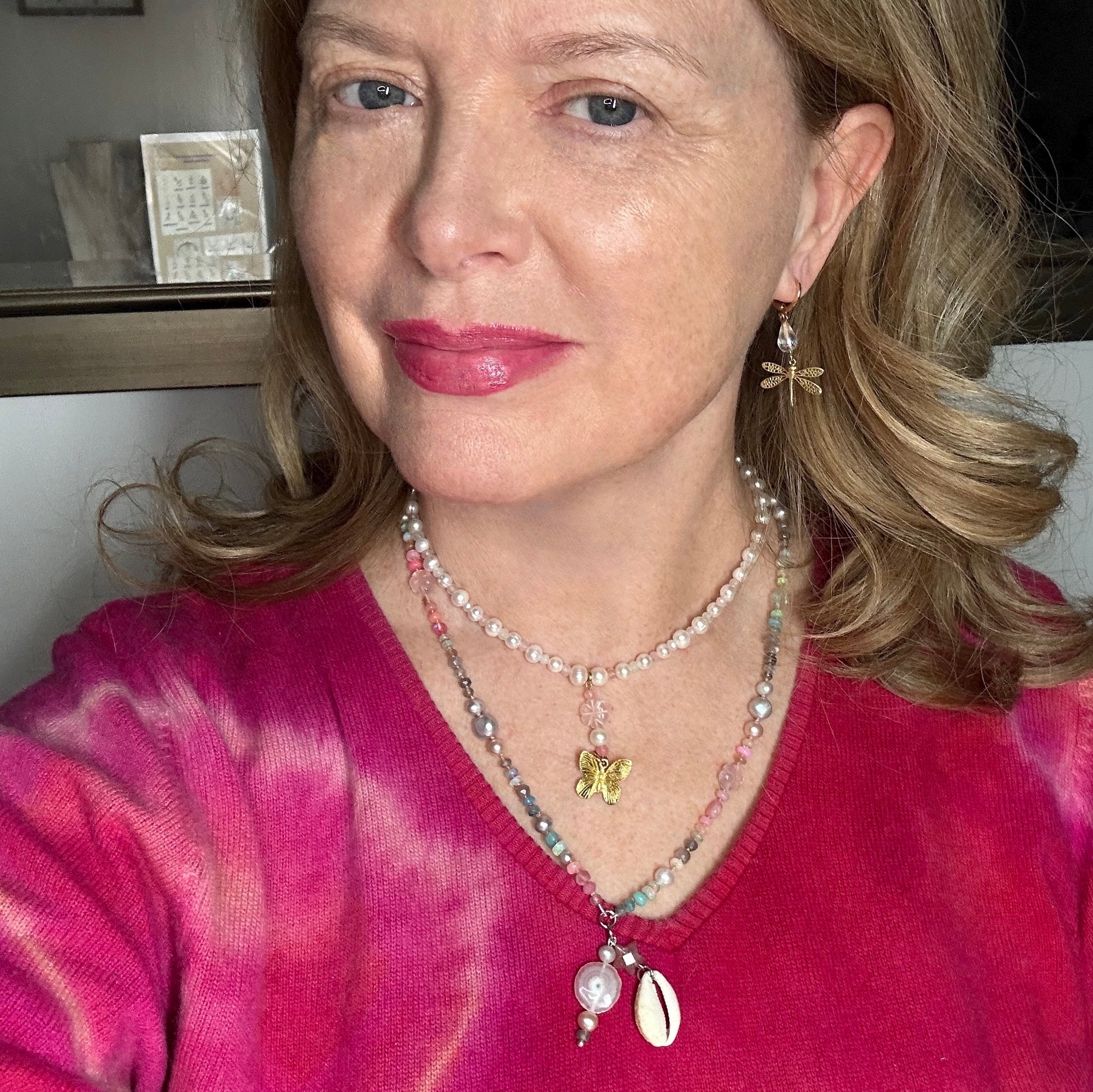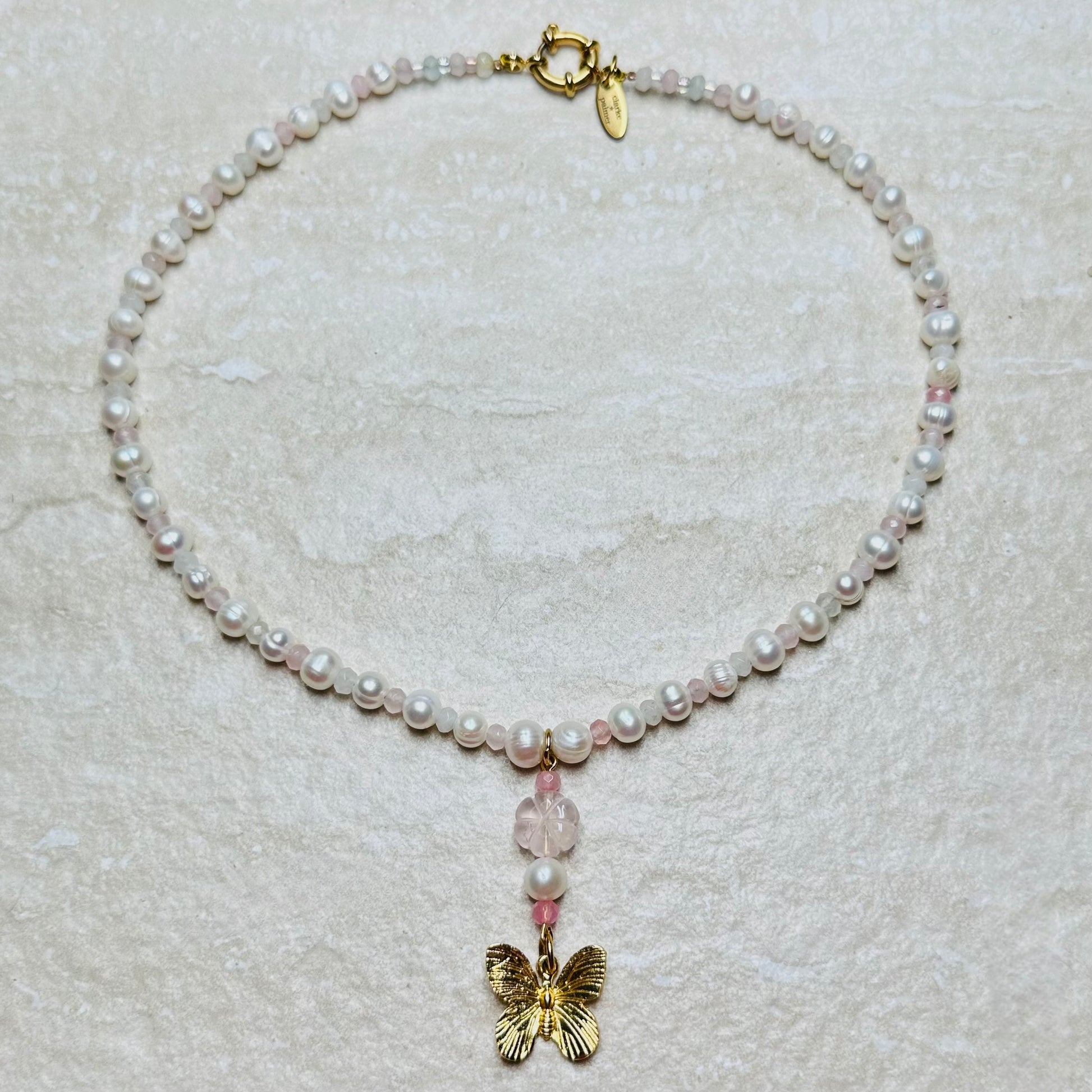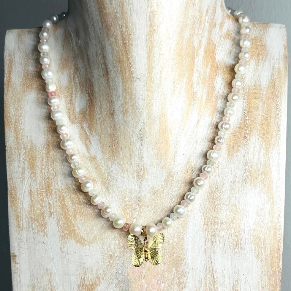 This Necklace is handmade in real ivory pearls interspersed with palest pink and ivory faceted agate rondelles and centred by your choice of 22 kt gold vermeil butterly charm pendant with or without teardrop pearl.