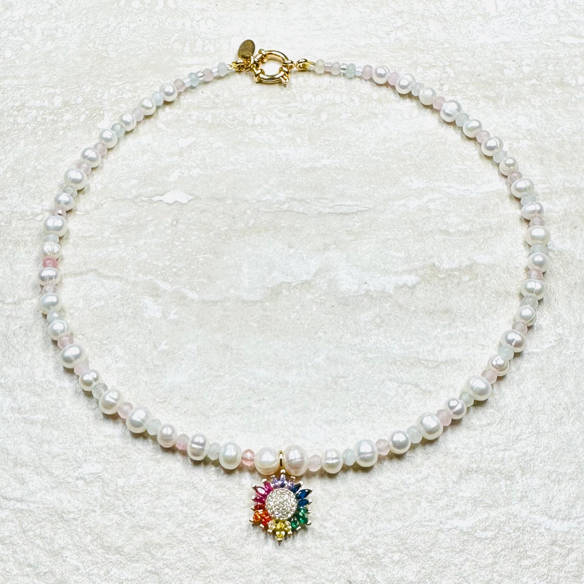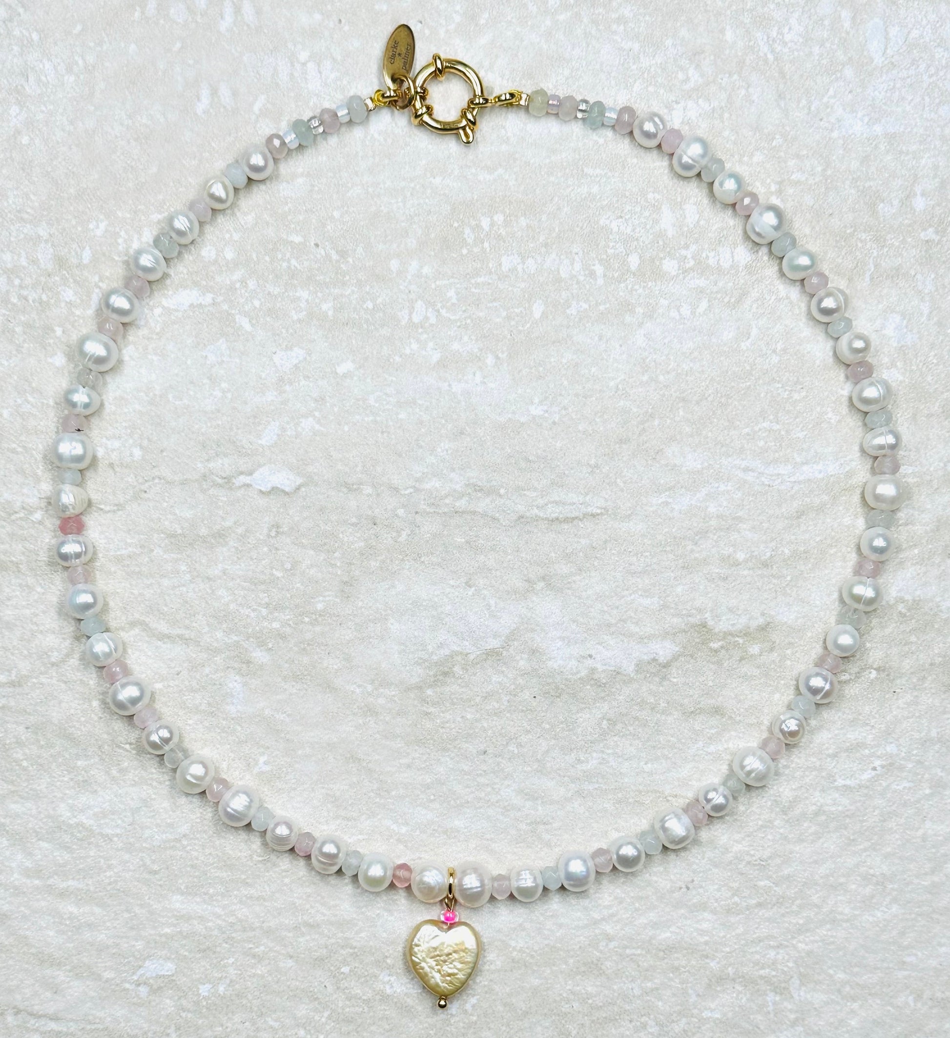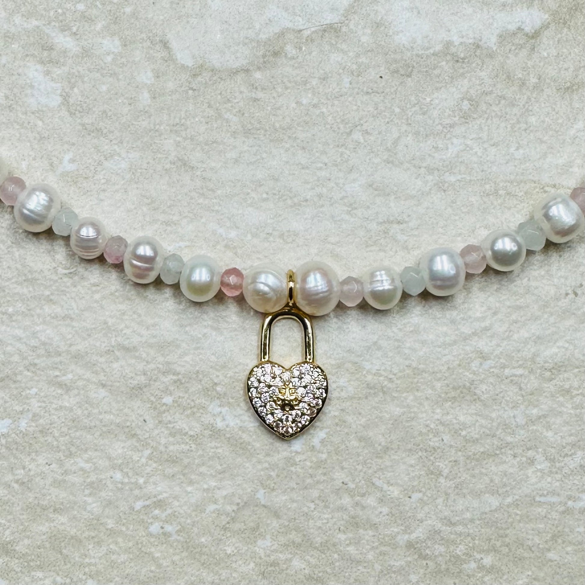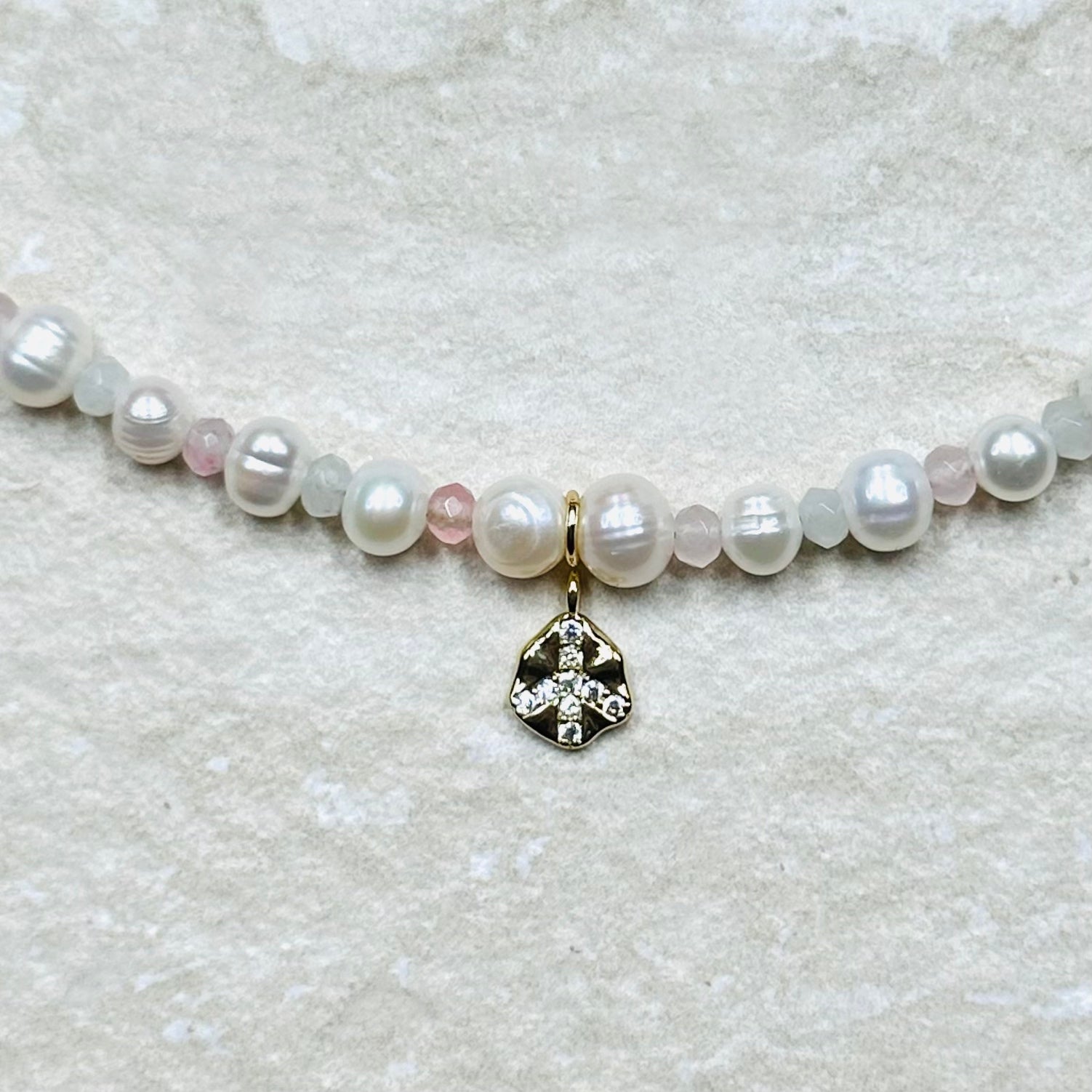 This Necklace is handmade in real ivory pearls interspersed with palest pink and ivory faceted agate rondelles and centred by your choice of 24 kt gold vermeil charm pendant. Our pearls are sustainably sourced from Japan. It has a 24 kt gold vermeil lobster clasp. It is adjustable in length from 40 - 44 cm.