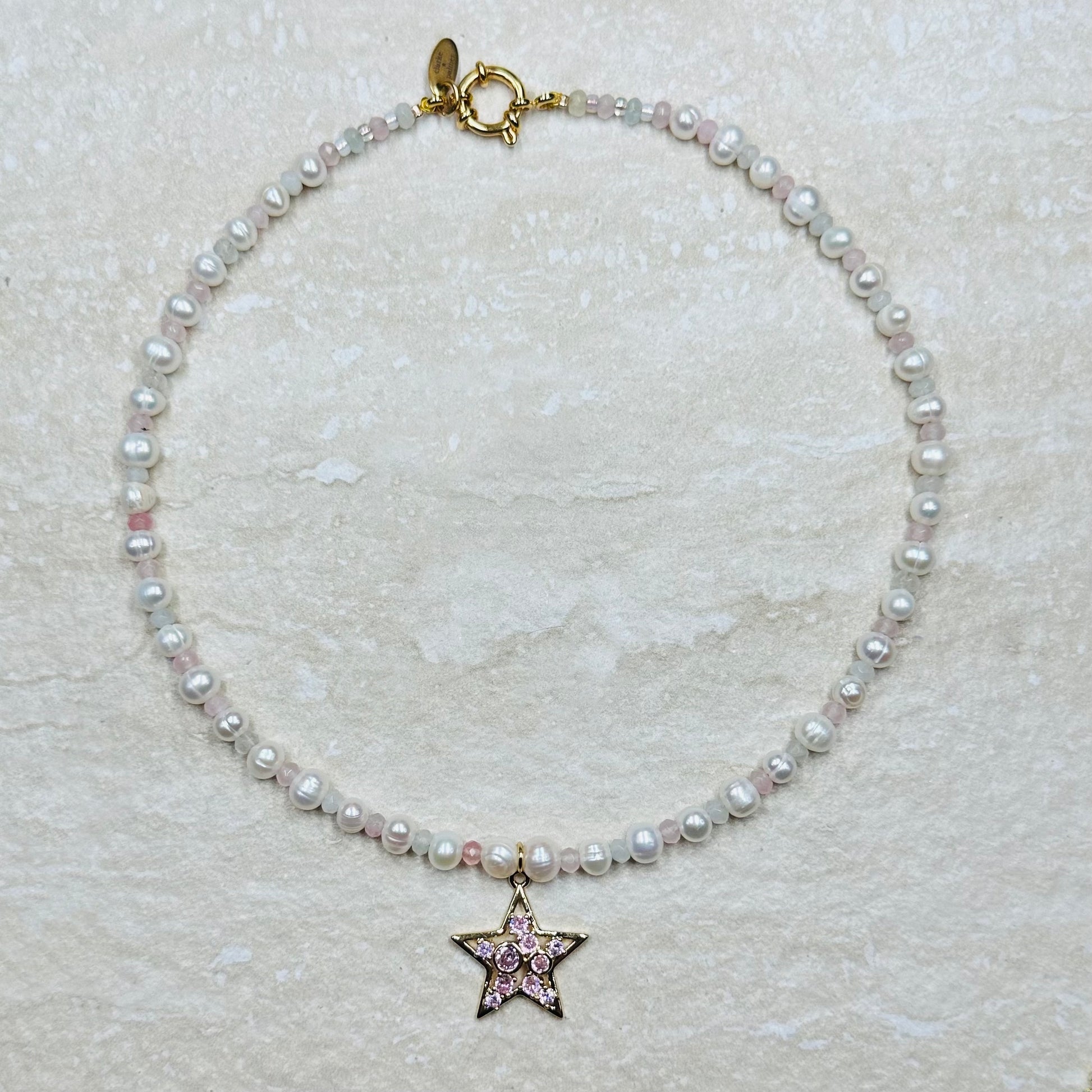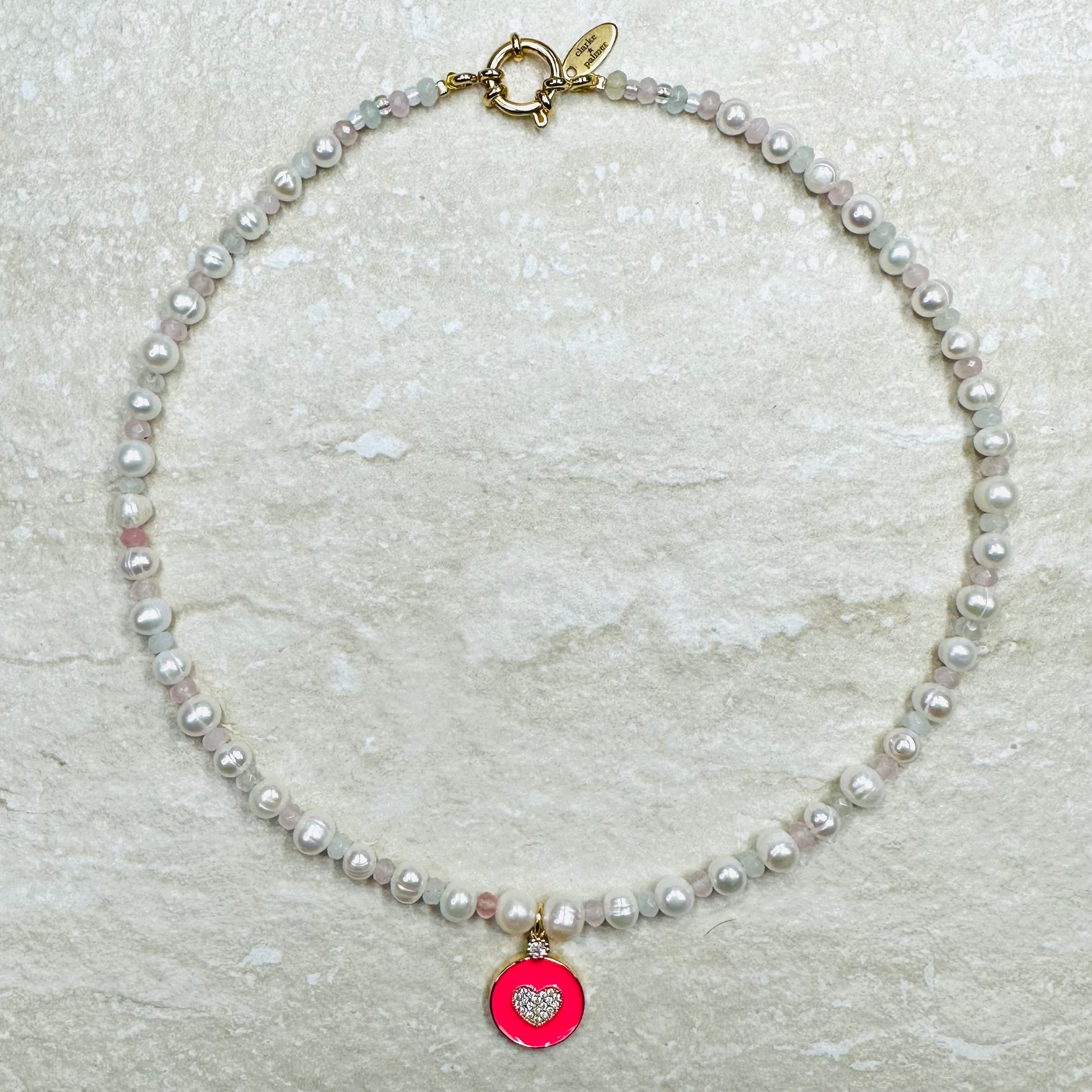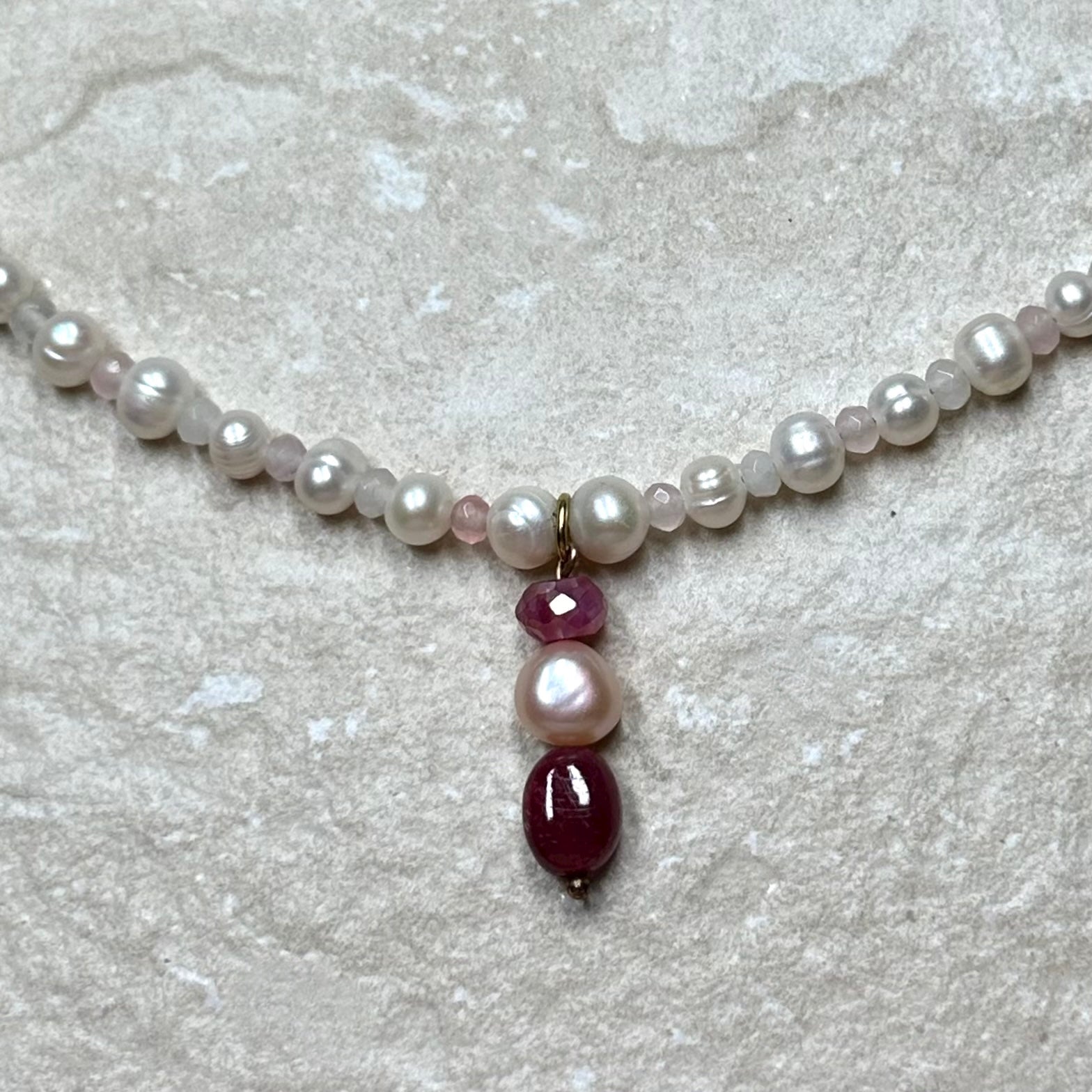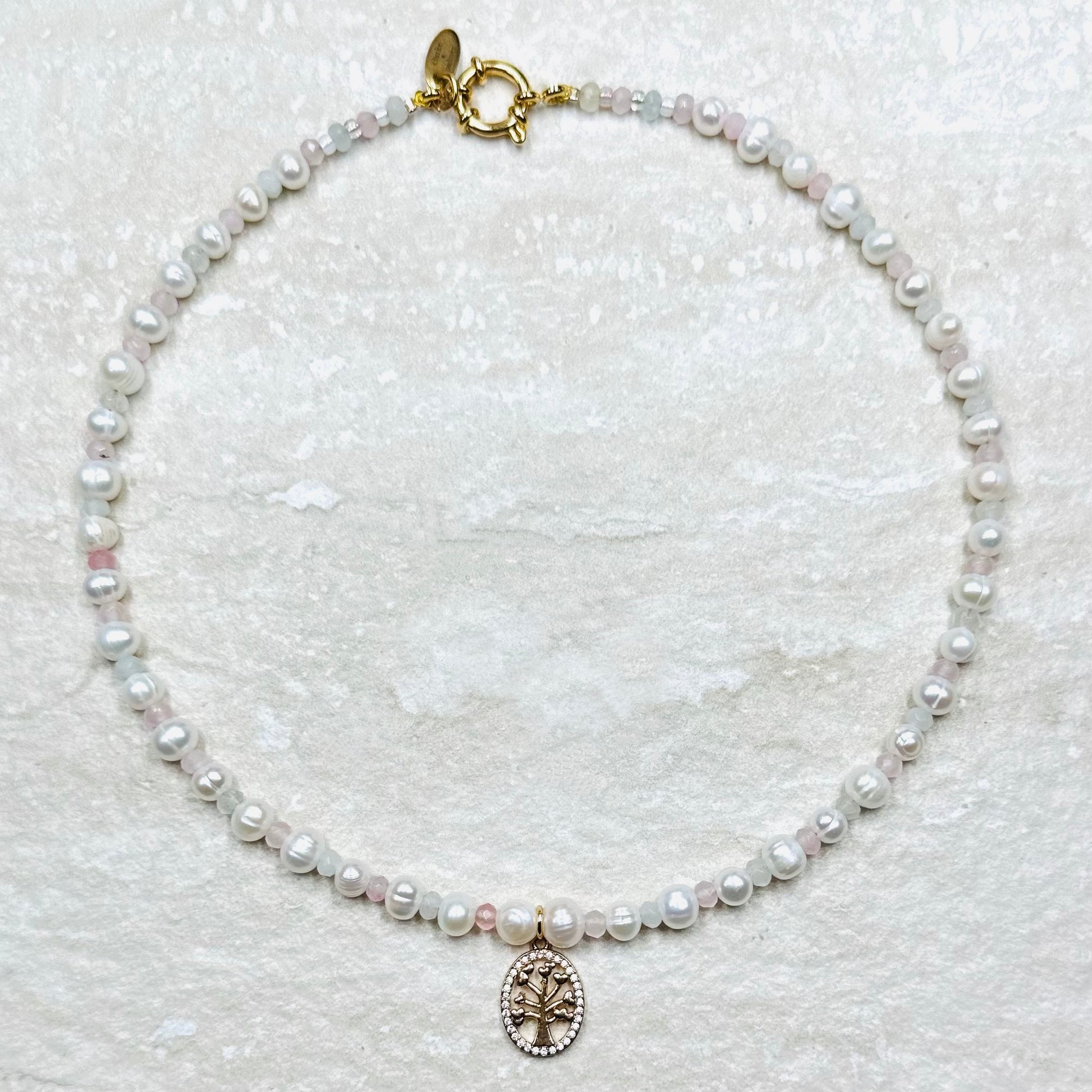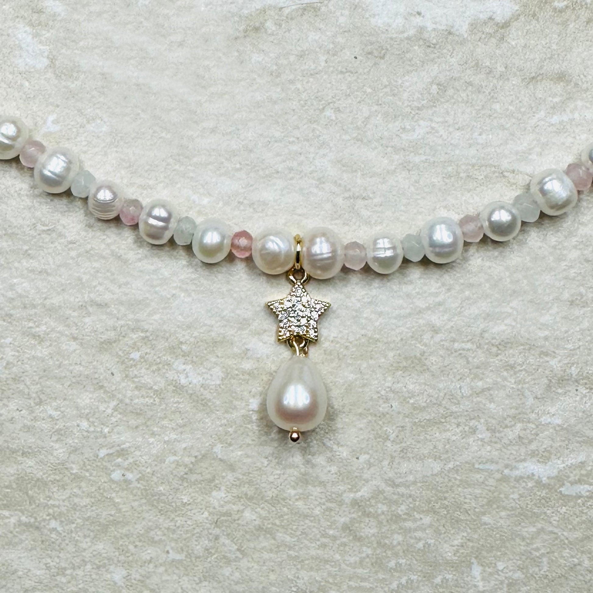 This Necklace is handmade in real ivory pearls interspersed with palest pink and ivory faceted agate rondelles and centred by your choice of 24 kt gold vermeil charm pendant. Our pearls are sustainably sourced from Japan. It has a 24 kt gold vermeil lobster clasp. It is adjustable in length from 40 - 44 cm.