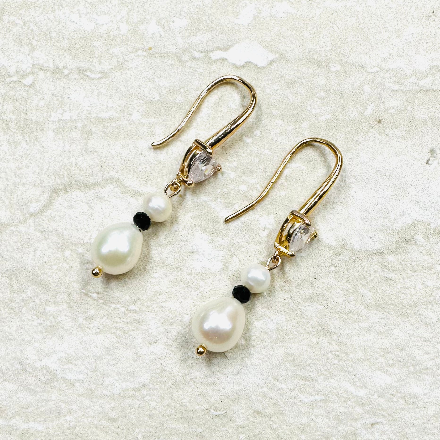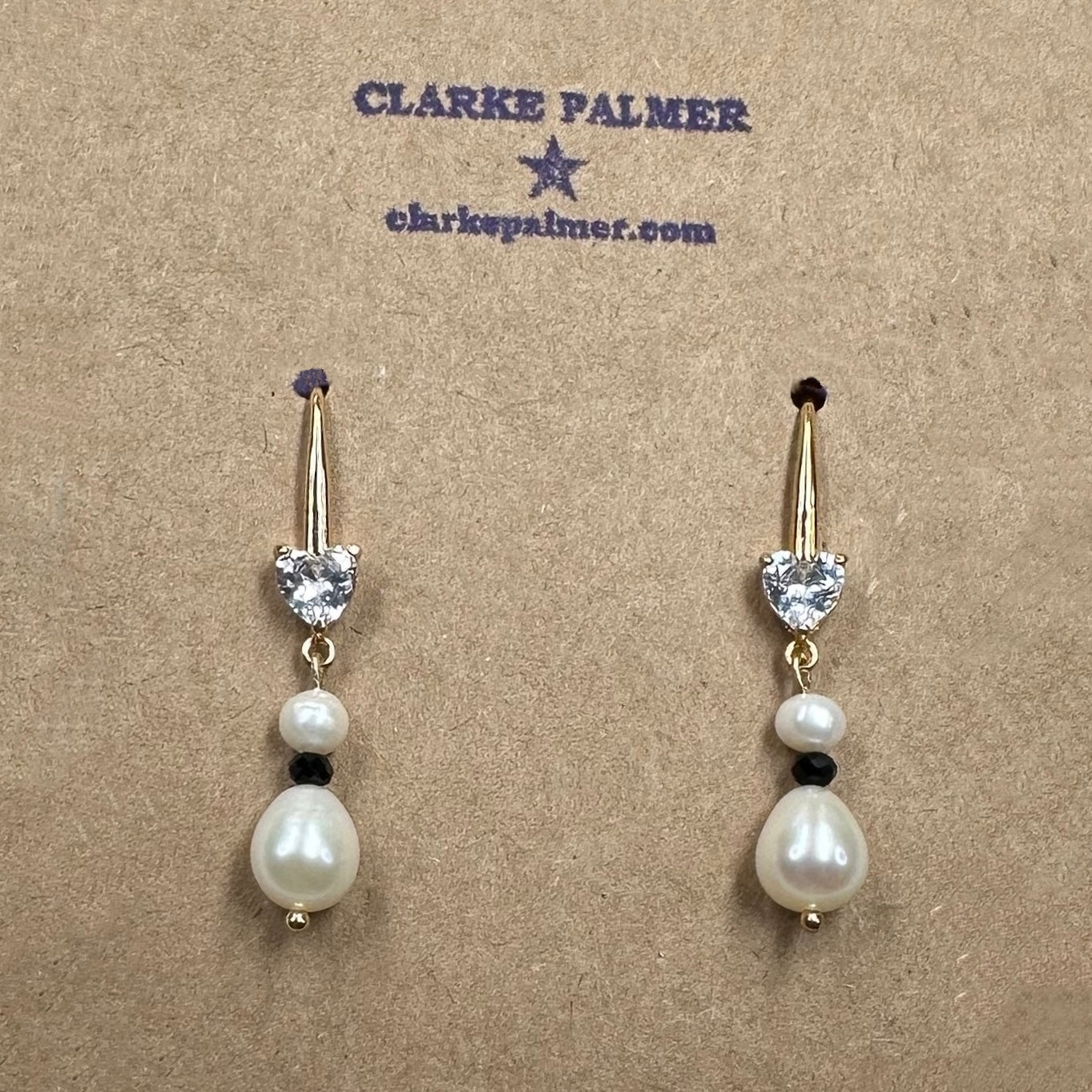 These beautiful drop earrings are made from round white pearls, black faceted spinel rondelles, teardrop shaped pearls on a 24kt gold vermeil setting with a heart shaped CZ stone.