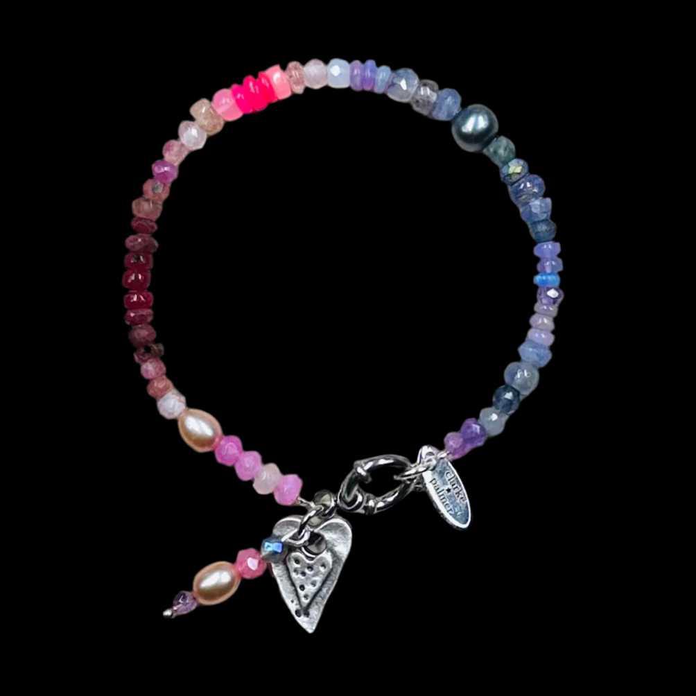 Our Rose Violet bracelet is handmade from ombré shades of purple, delphinium blue and pink sustainably sourced gemstones. It includes hand cut opal, moonstone, garnet, tanzanite, tourmaline, pearl, sapphire, amethyst, ruby and pearl rondelles. You can choose between gold or silver vermeil sailor clasp. Choose your size and extra cz letters in the options.