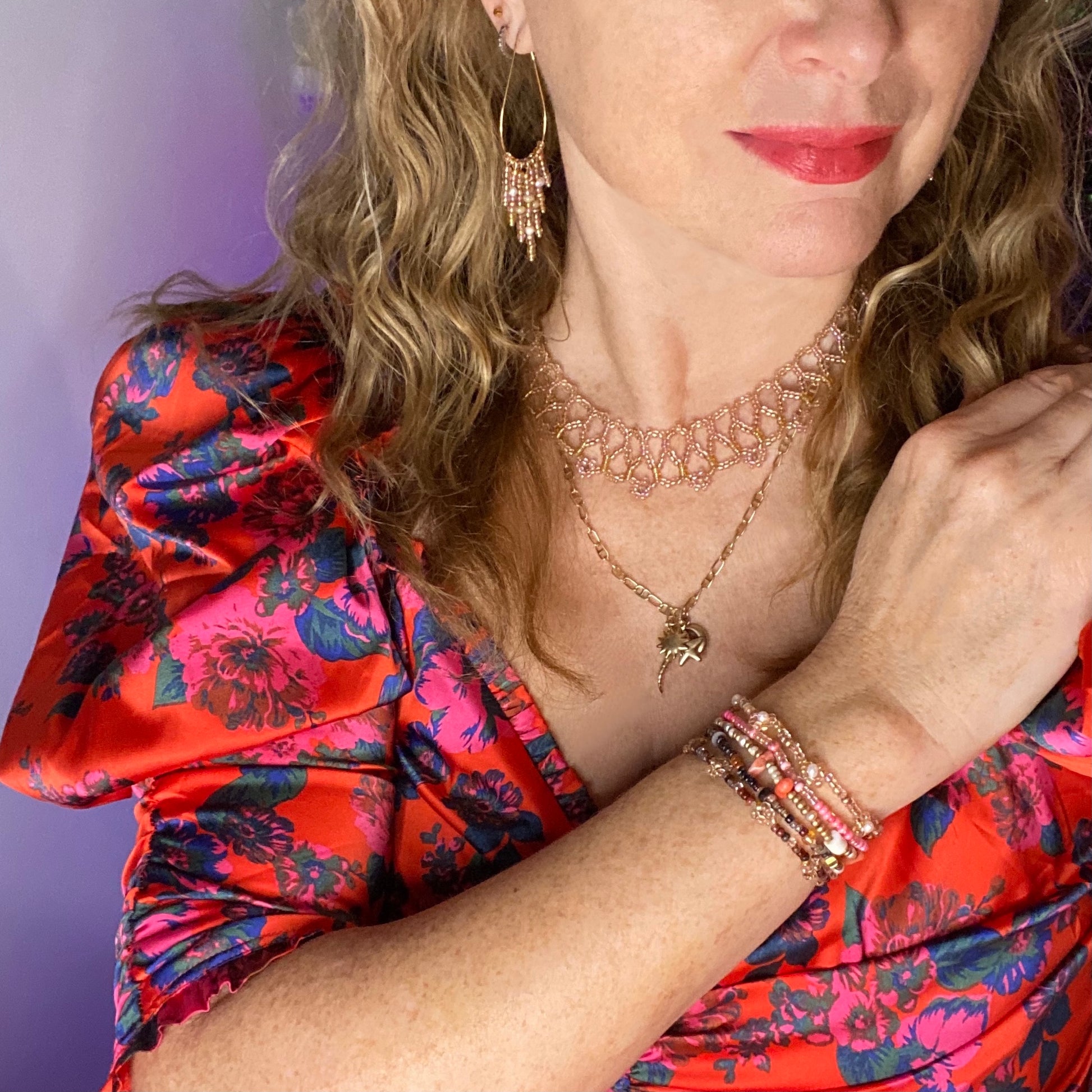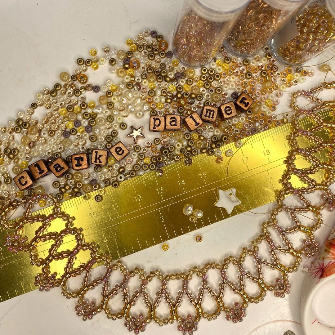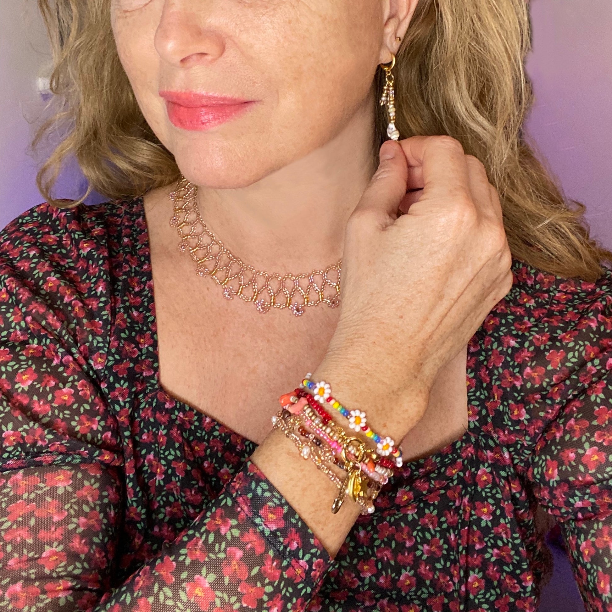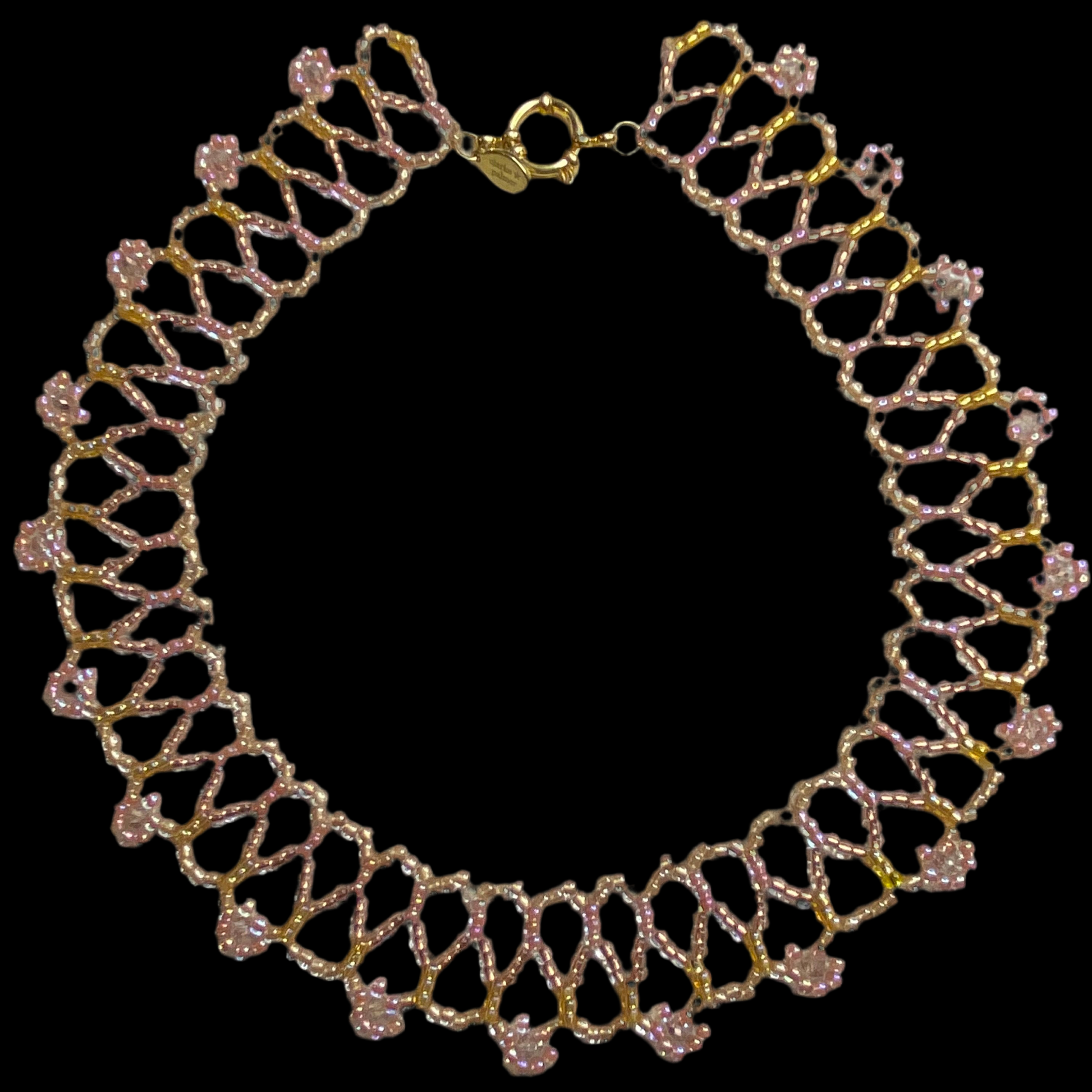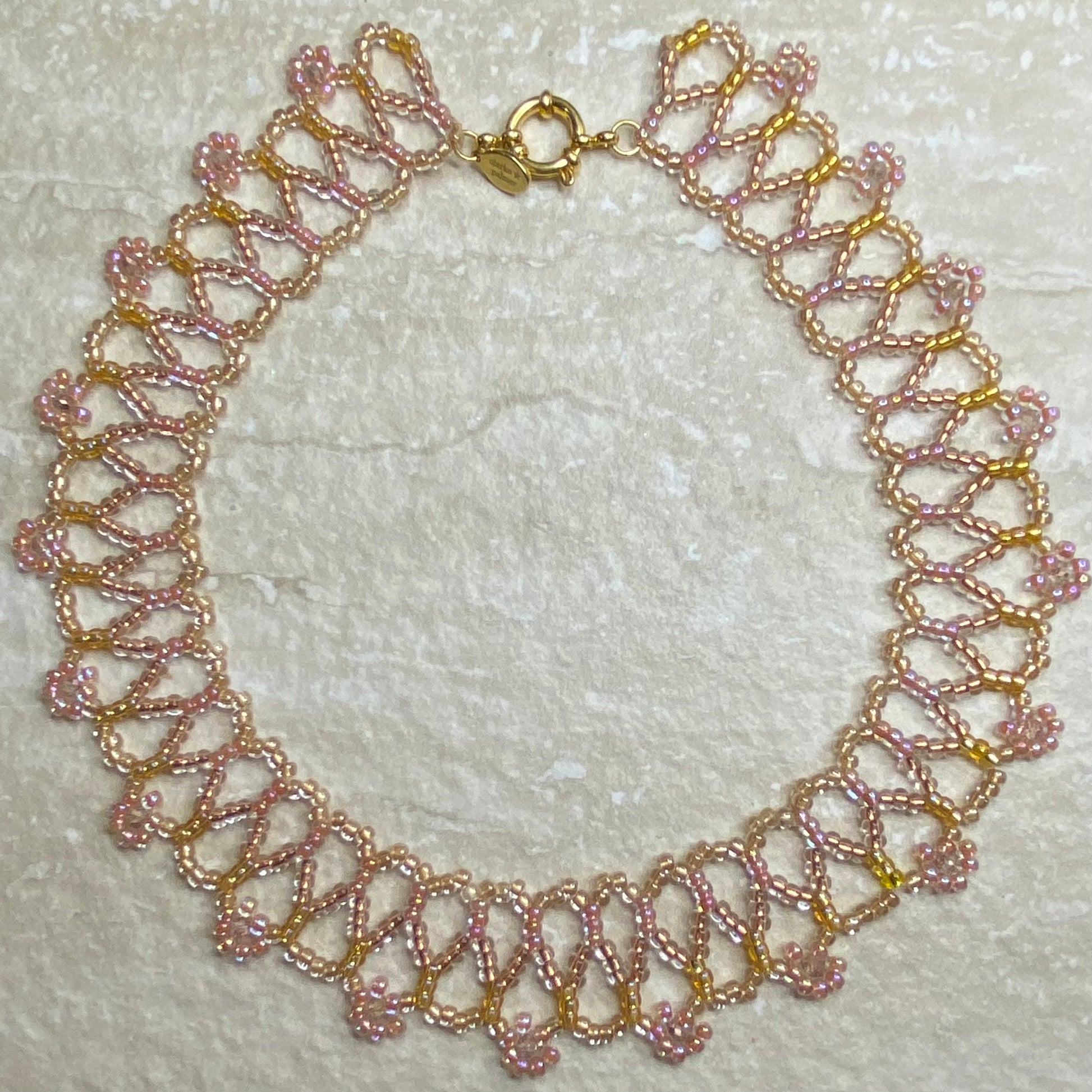 The Rosy Glow Daisy Lattice Necklace is handmade from shades of gold and rose gold glass Preciosa and Miyuki beads. It is handsewn on strong thread and closed with a 24 kt gold vermeil clasp.