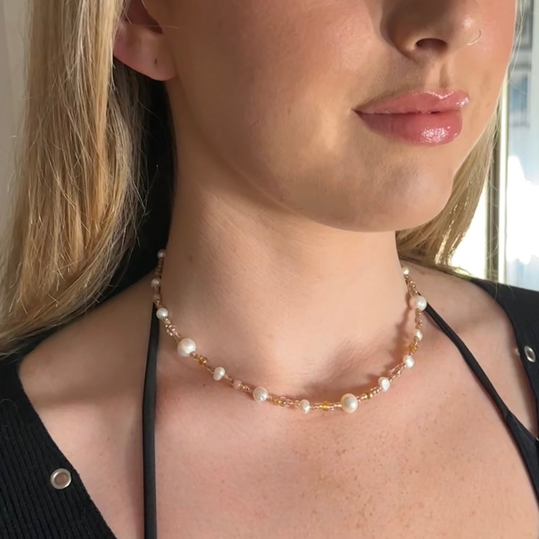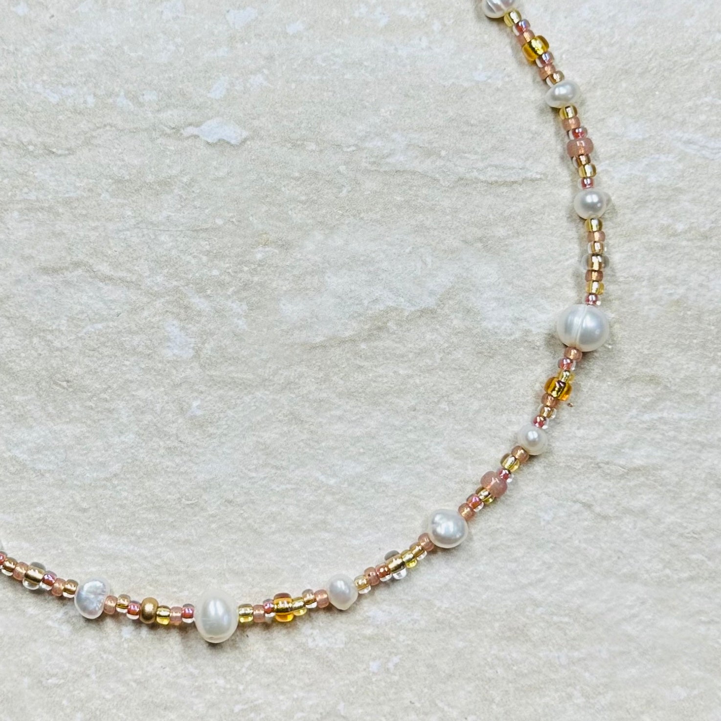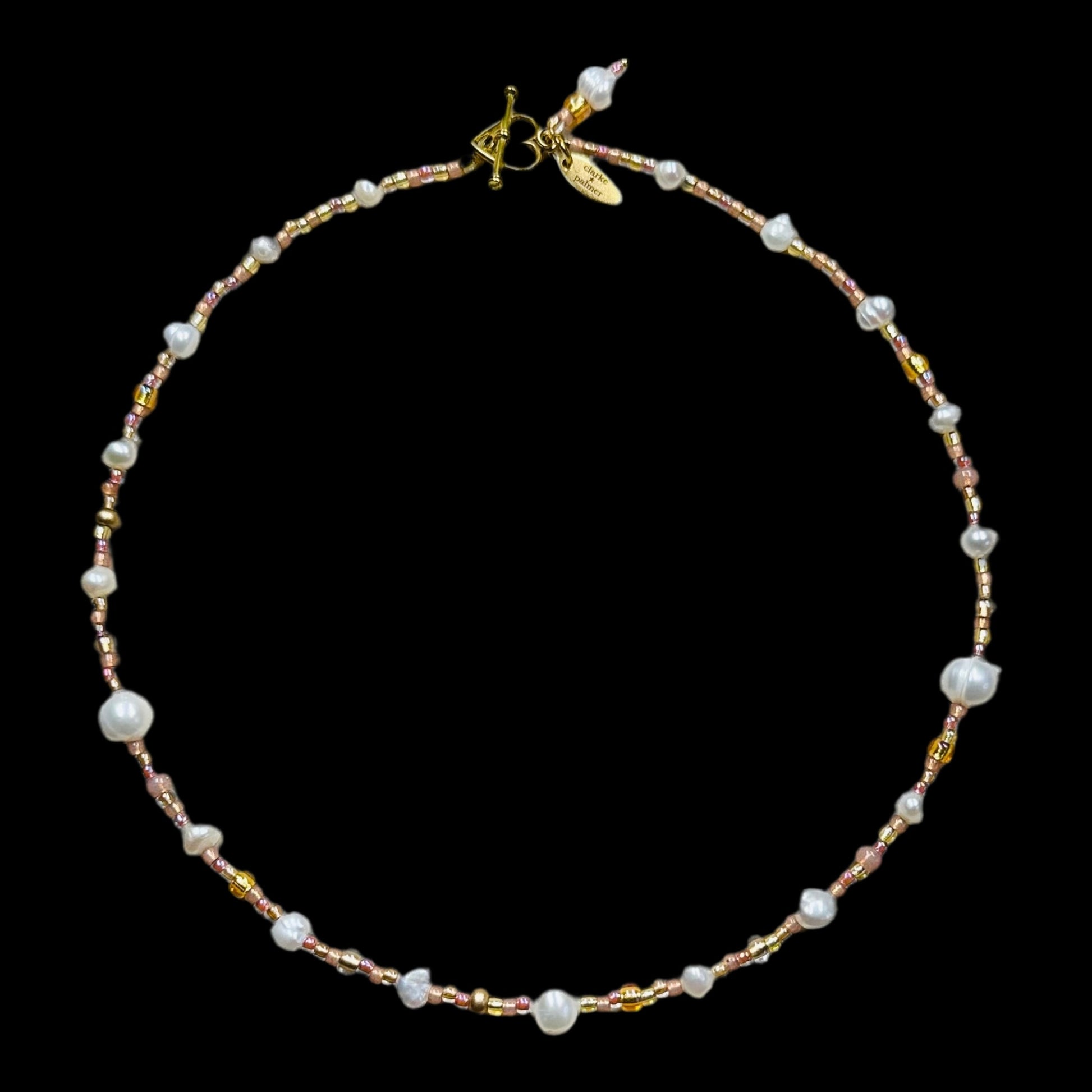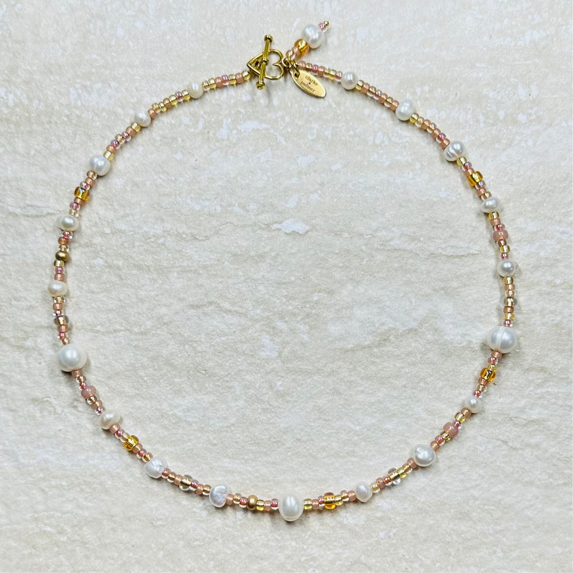 One of our most popular necklaces is the gorgeous Rosy Glow Pearl necklace. Super classic - it is handmade from shades of gold and rose gold Preciosa and Miyuki glass beads with real pearls a 22kt gold vermeil lobster clasp.