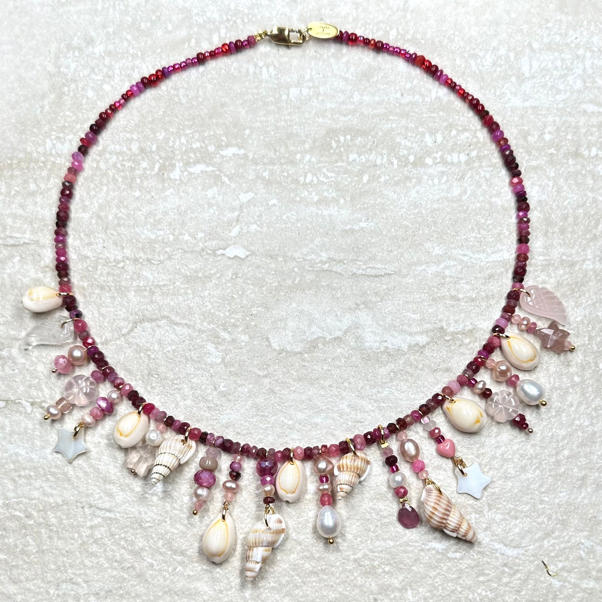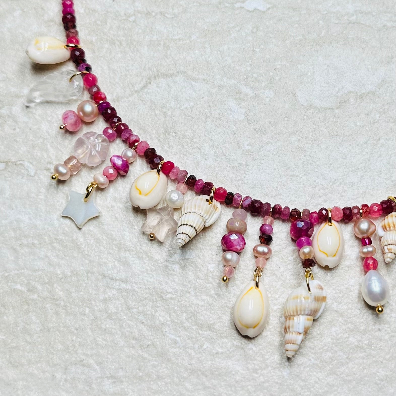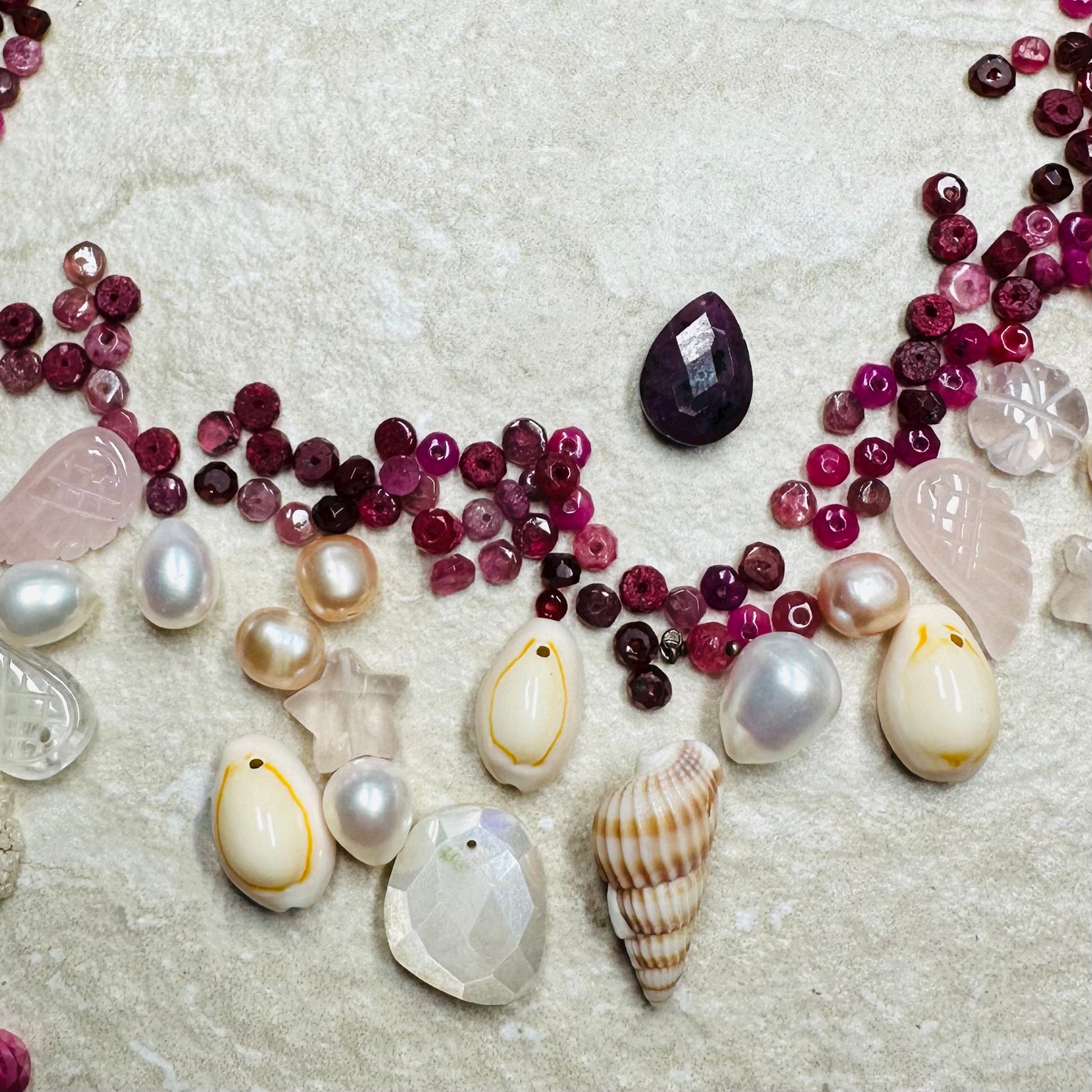 This stunning necklace is handmade from real gemstones including sustainably sourced ruby, garnet, pale pink, ivory pearls, tourmaline, rose quartz, moonstone and a hand carved stars, flowers and angel wing gemstone charms.