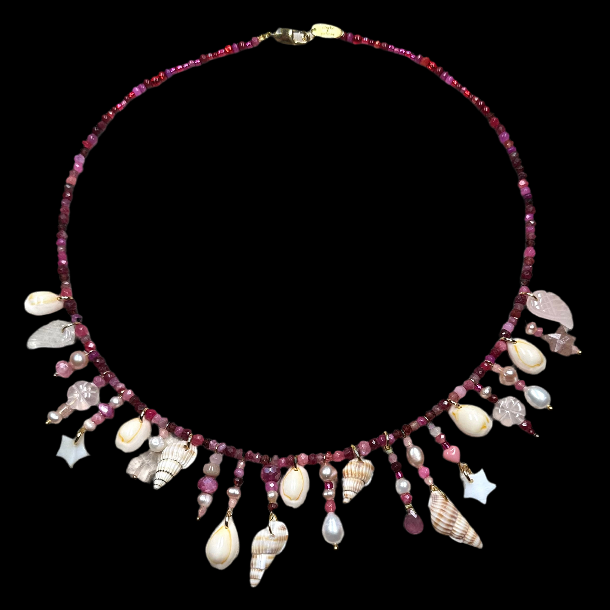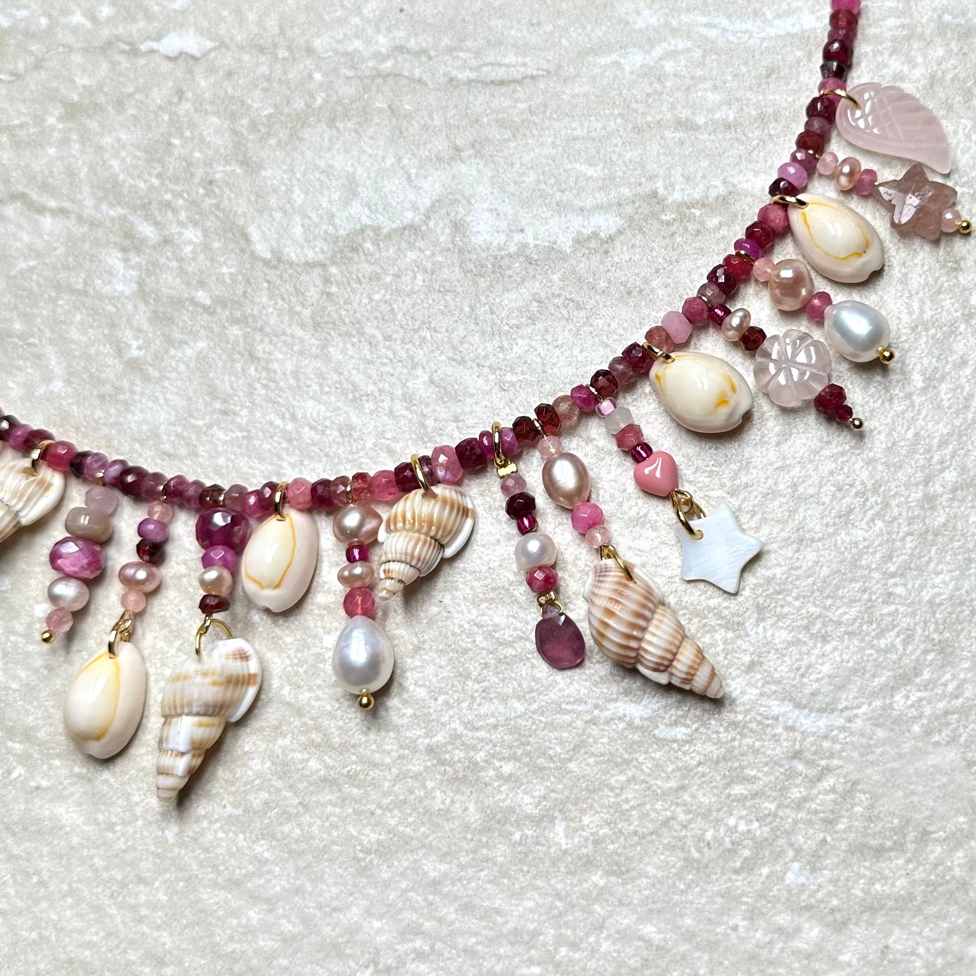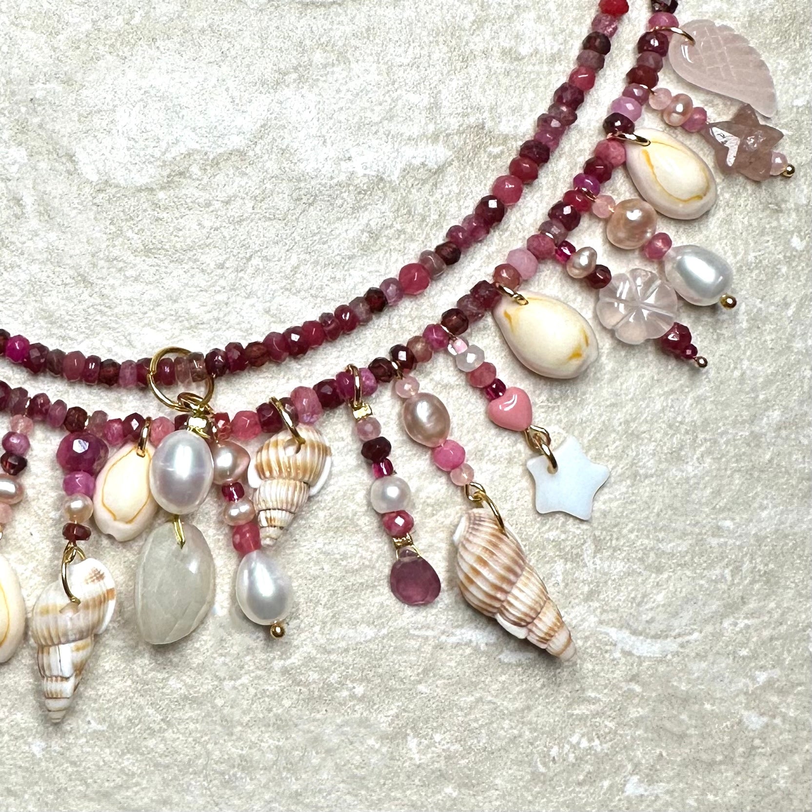This stunning necklace is handmade from real gemstones including sustainably sourced ruby, garnet, pale pink, ivory pearls, tourmaline, rose quartz, moonstone and a hand carved stars, flowers and angel wing gemstone charms.